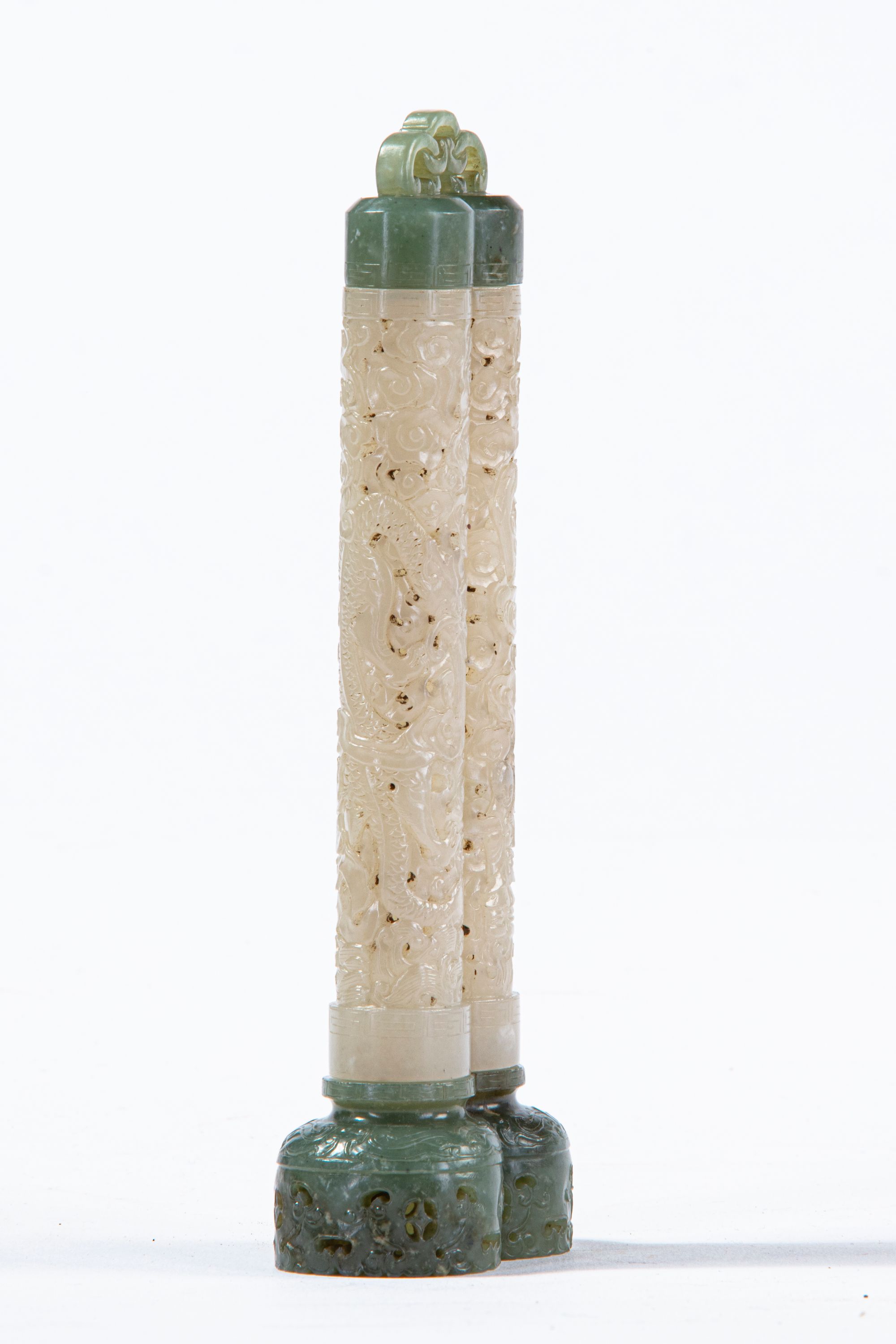 The standing vessel is carved to the middle section with openwork dragon and a boy amongst clouds in a double column in white jade, with a spinach jade cap, and a bulging spinach jade stand carved with stylised scrolls.