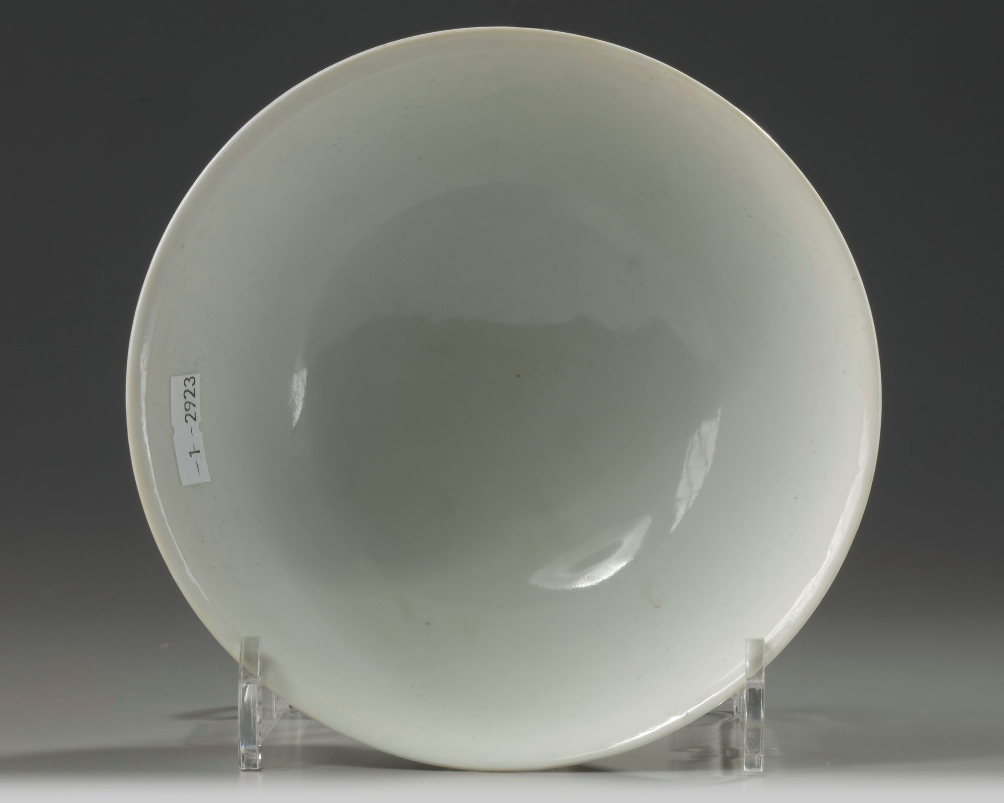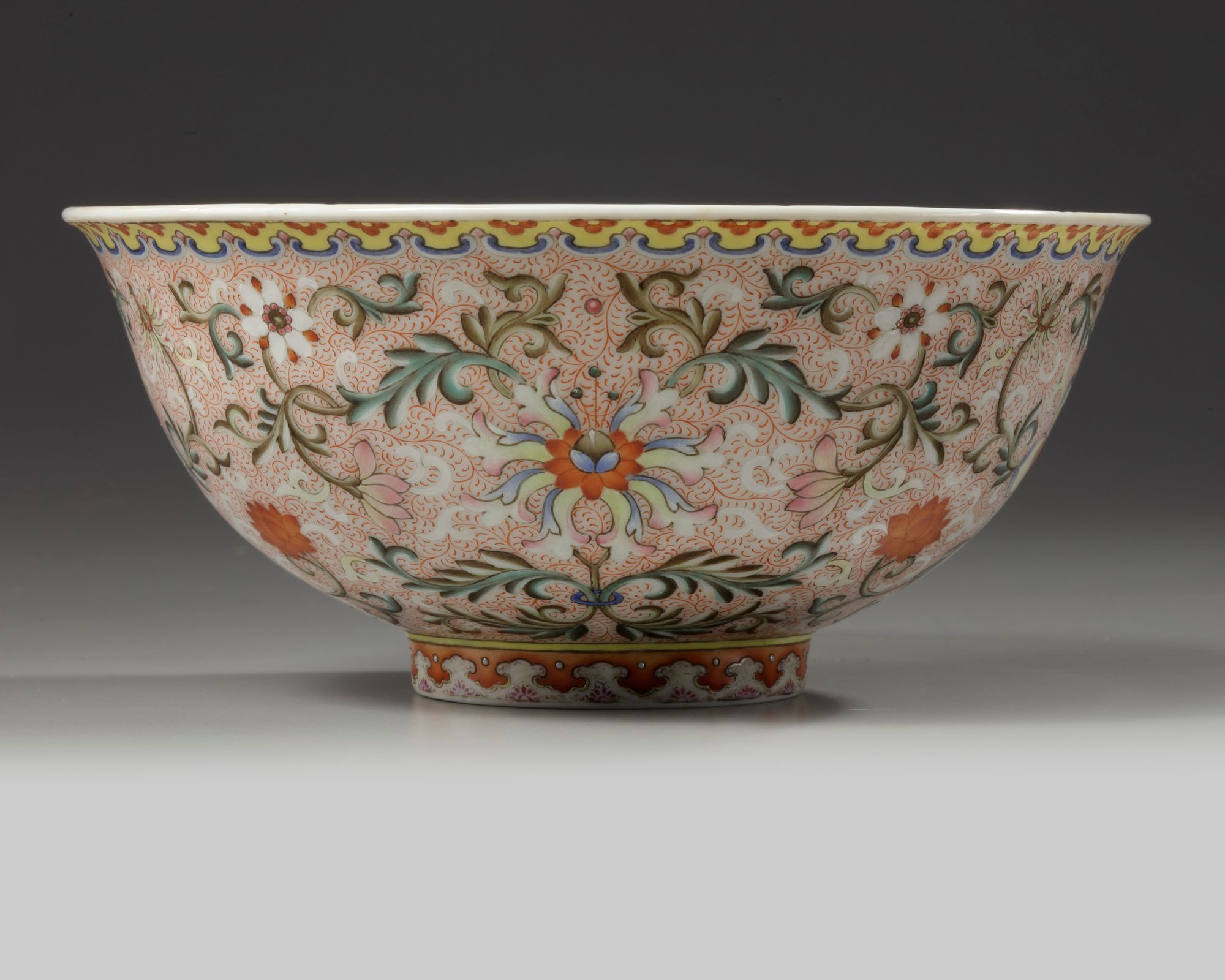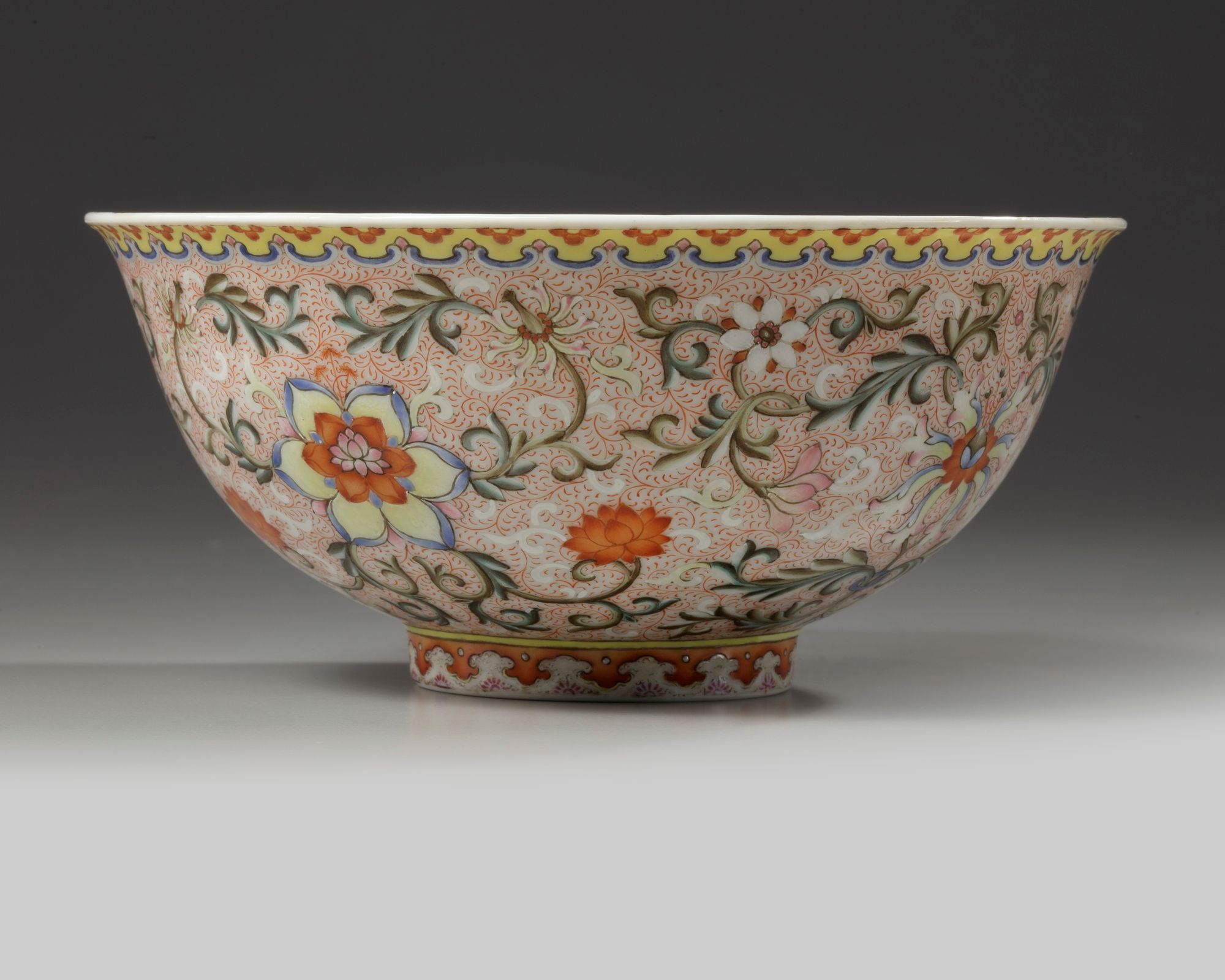 The bowl is decorated to the exterior with two kinds of hibiscus on scrolling green-enamelled leafy vines bearing lotus, all reserved on an iron red scrolling ground. The rim is decorated with c-scrolls and the foot with a spearhead band. The base with an apocryphal Qianlong mark.