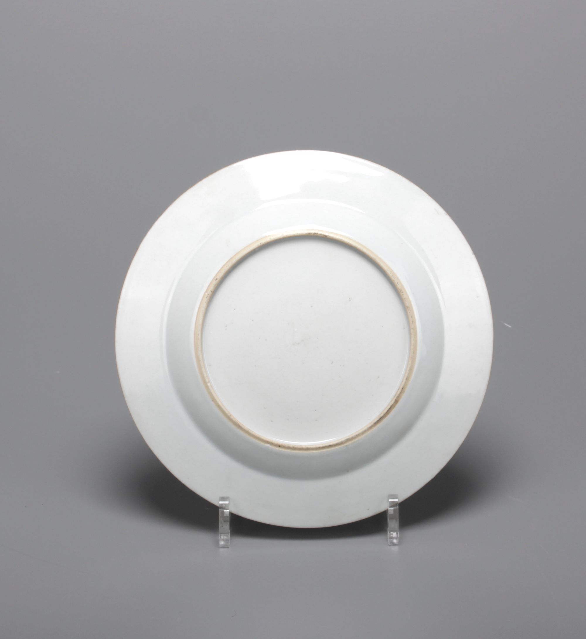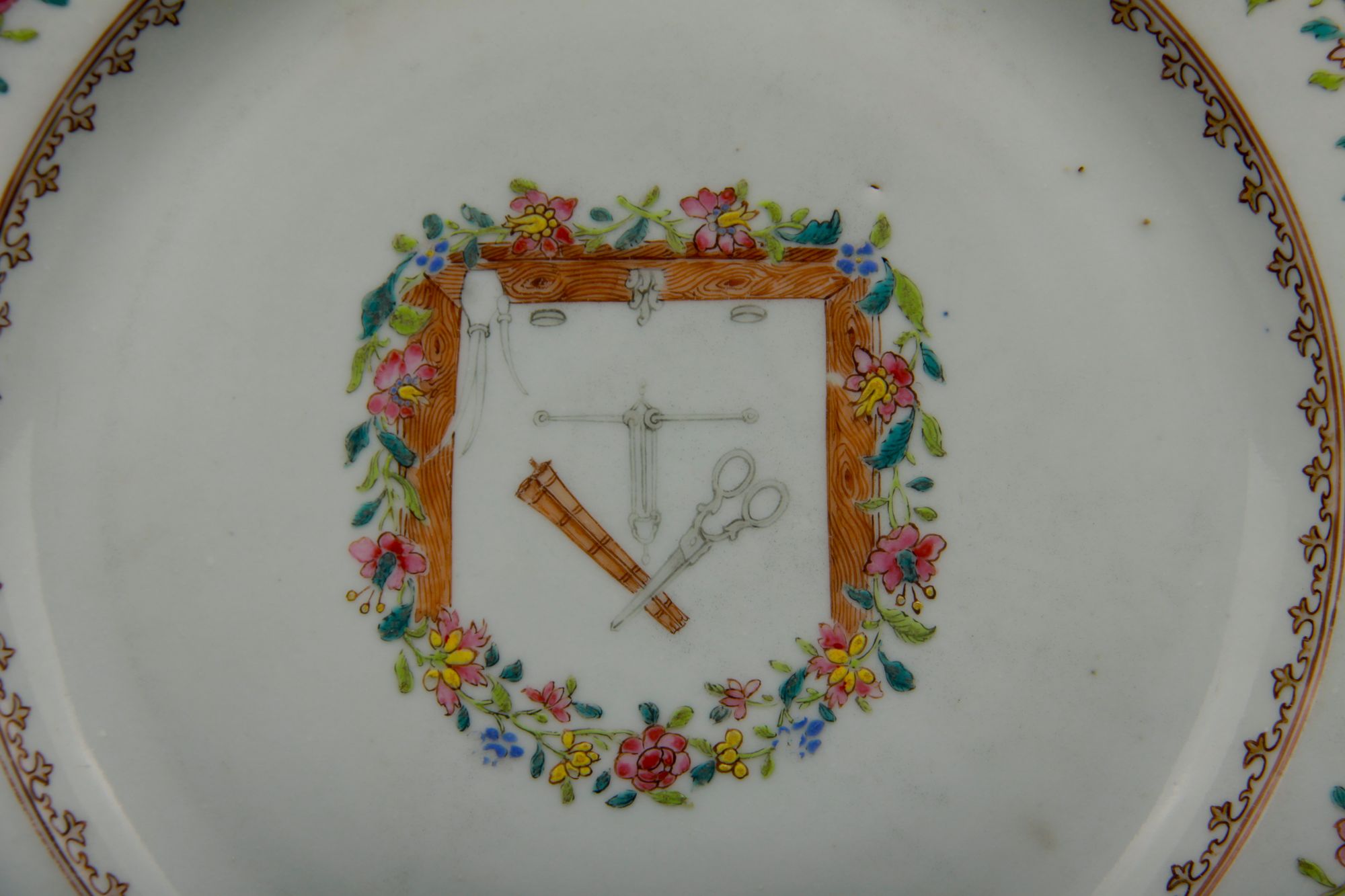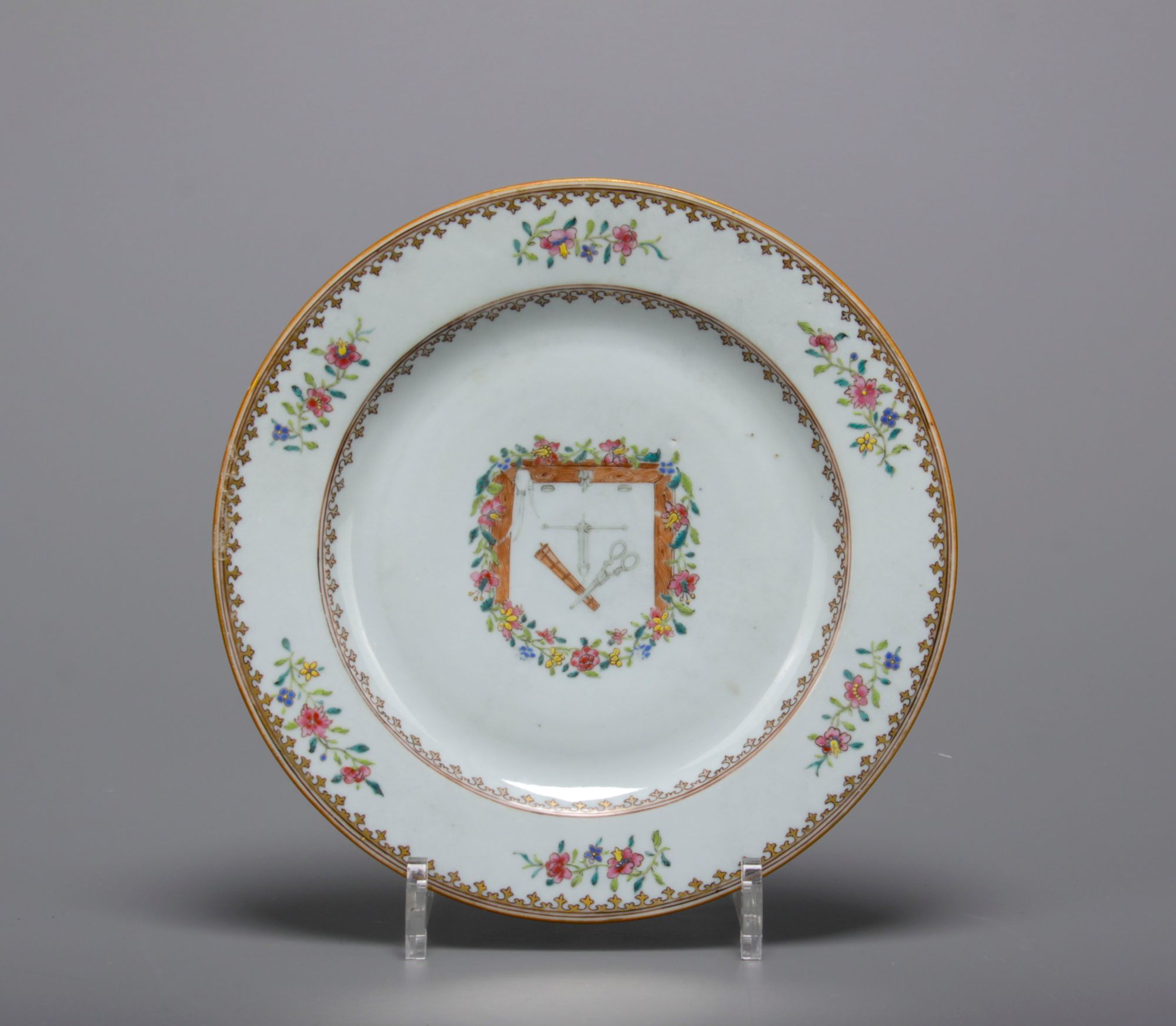 Decorated in the famille rose palette centrally depicting masonic symbols enclosed by flowers. Flower sprays around the rim.