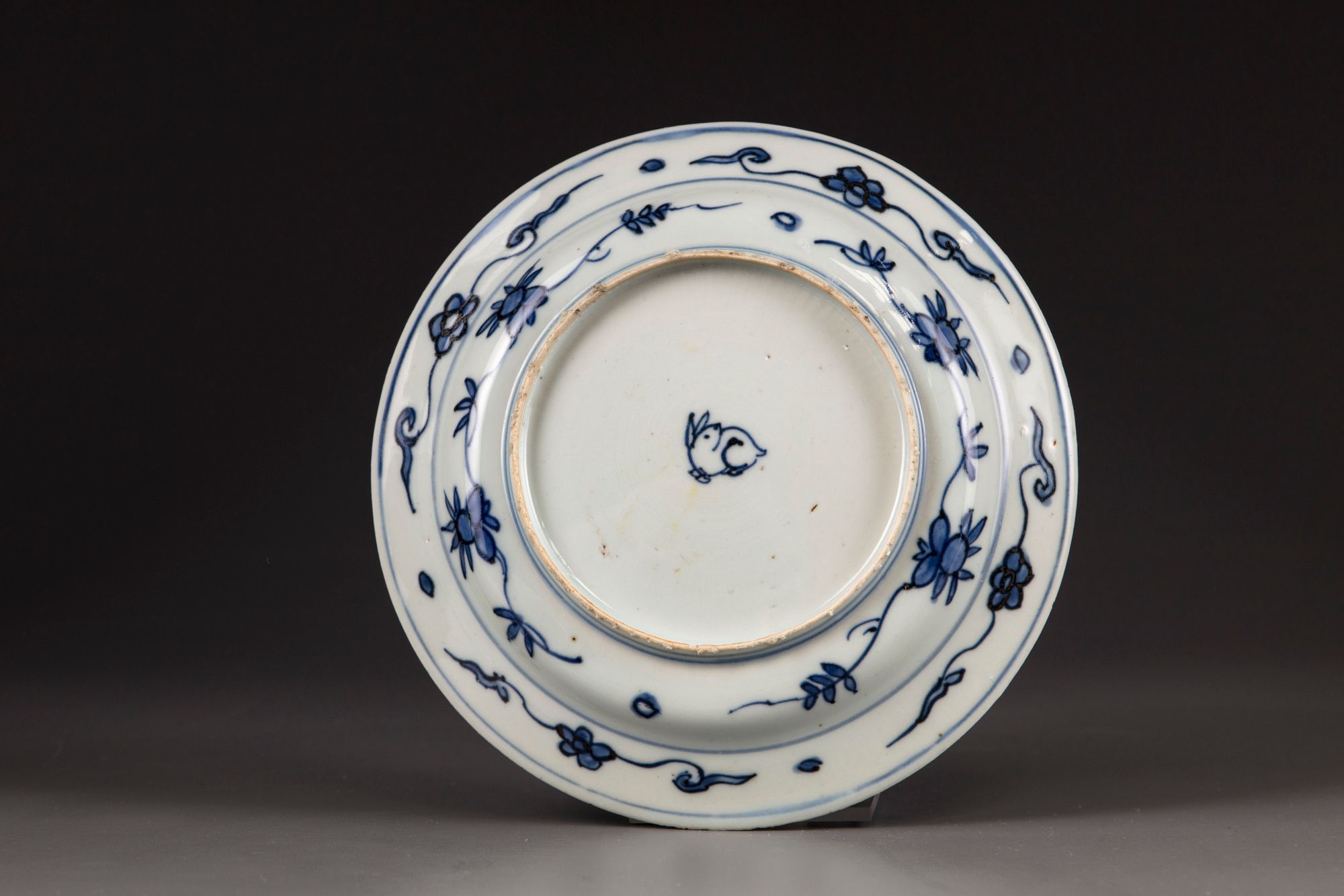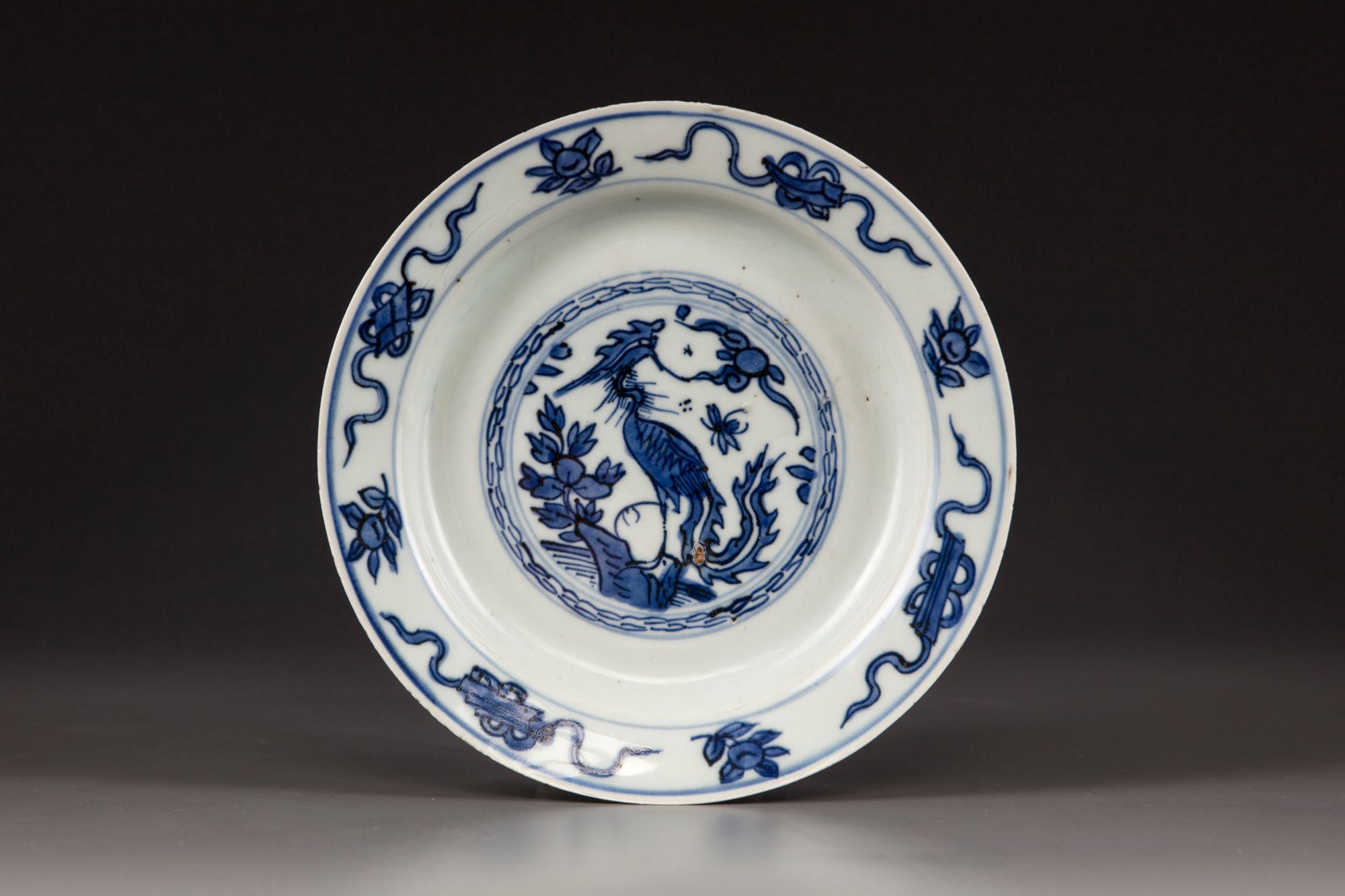 The dish is decorated with a central roundel enclosing a phoenix on a rock amongst flowers and a bee beneath a shining sun. The rim is decorated with a border of precious objects and flowers. The reverse is decorated with two floral bands and a rabbit mark.