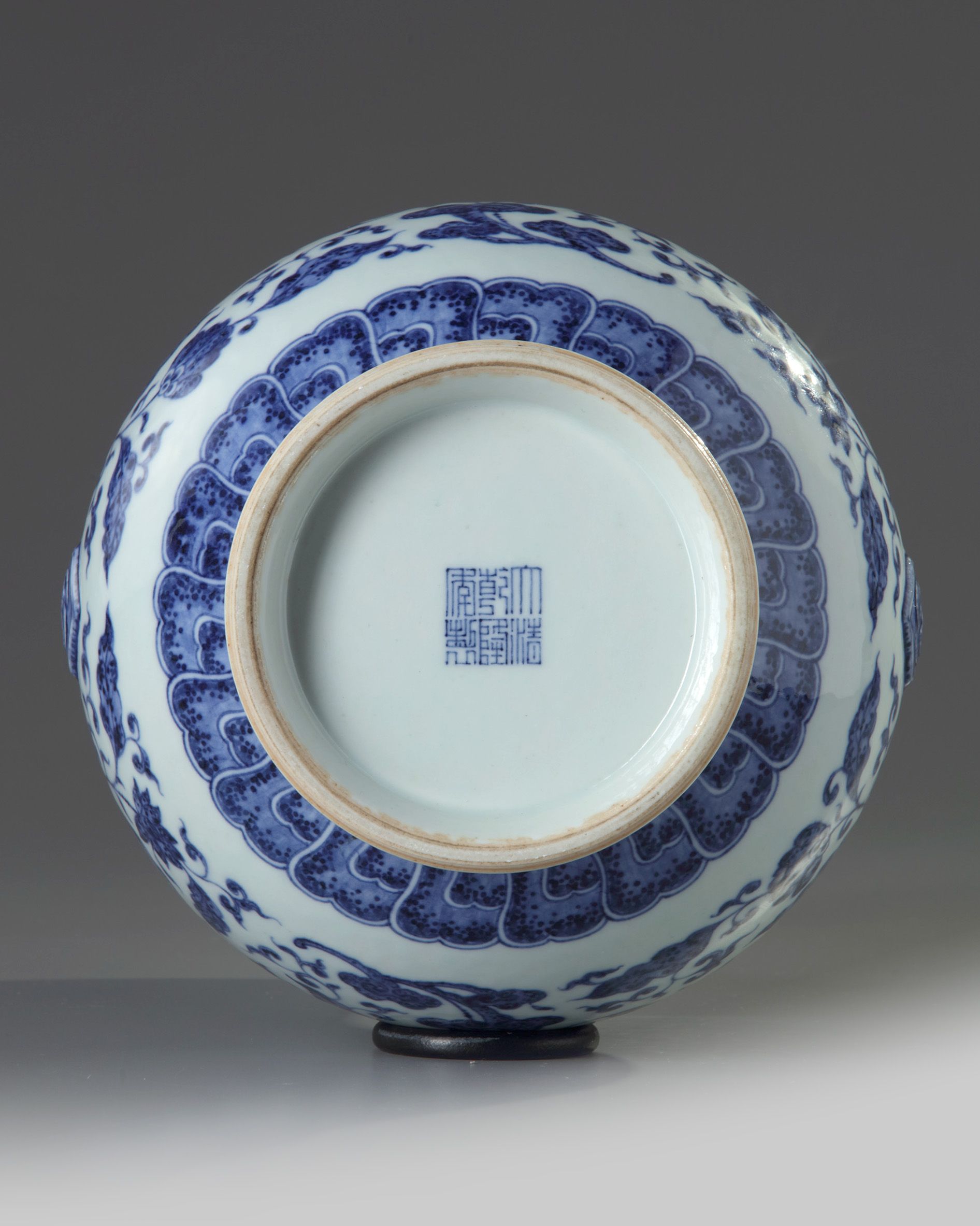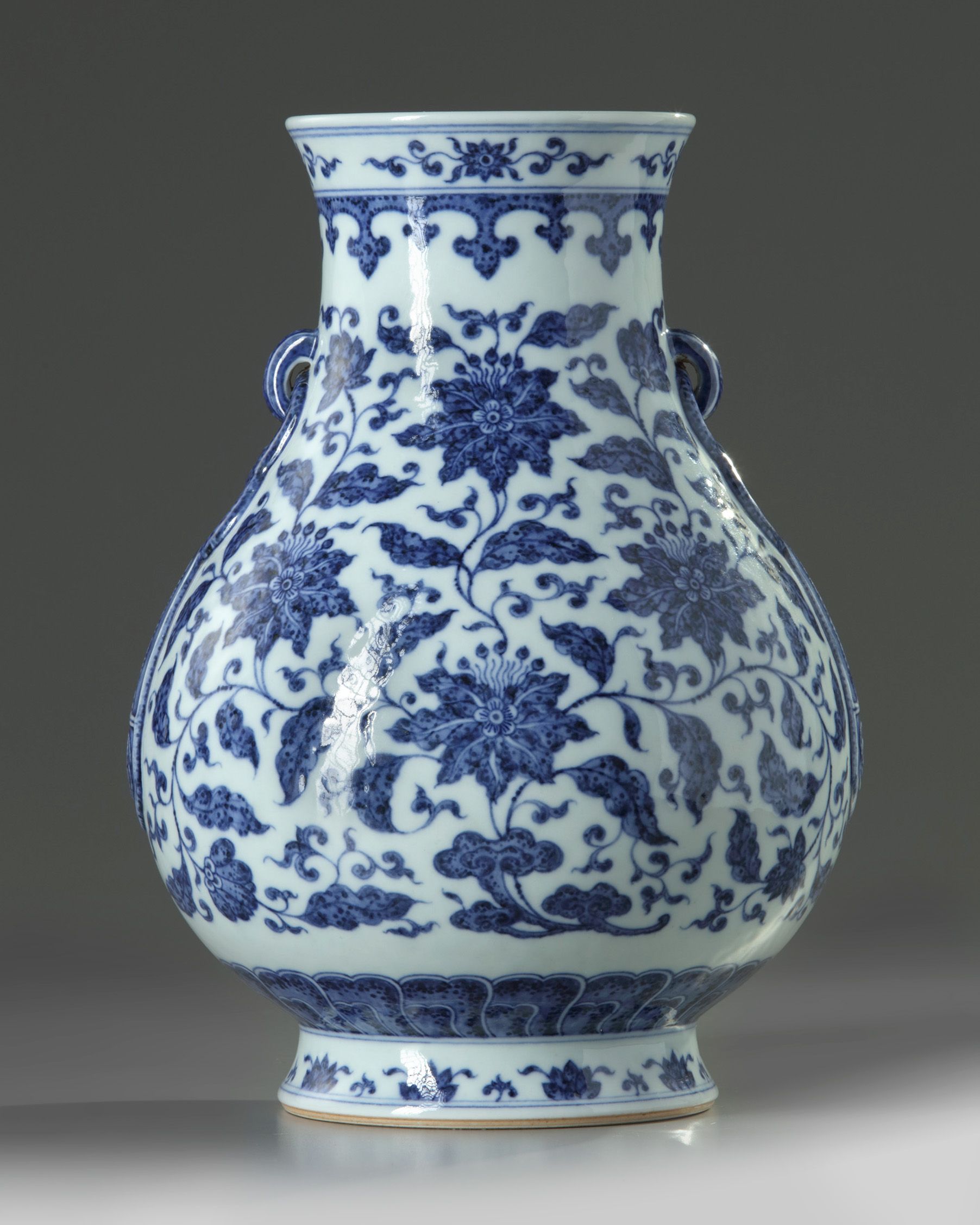 The pear-shaped vase is decorated with two loop handles which bear a double fixed ring and a moulded imitation ribbon. The body is boldly decorated to the body with scrolling lilies and lingzhi fungus, all below a spearhead band and a floral band to the rim. The base with an apocryphal Qianlong mark.