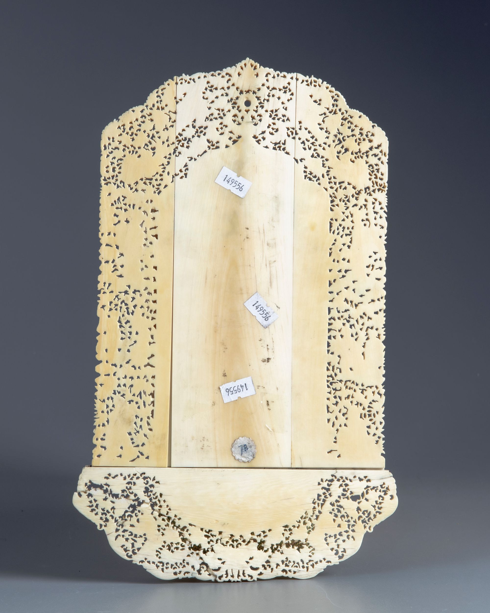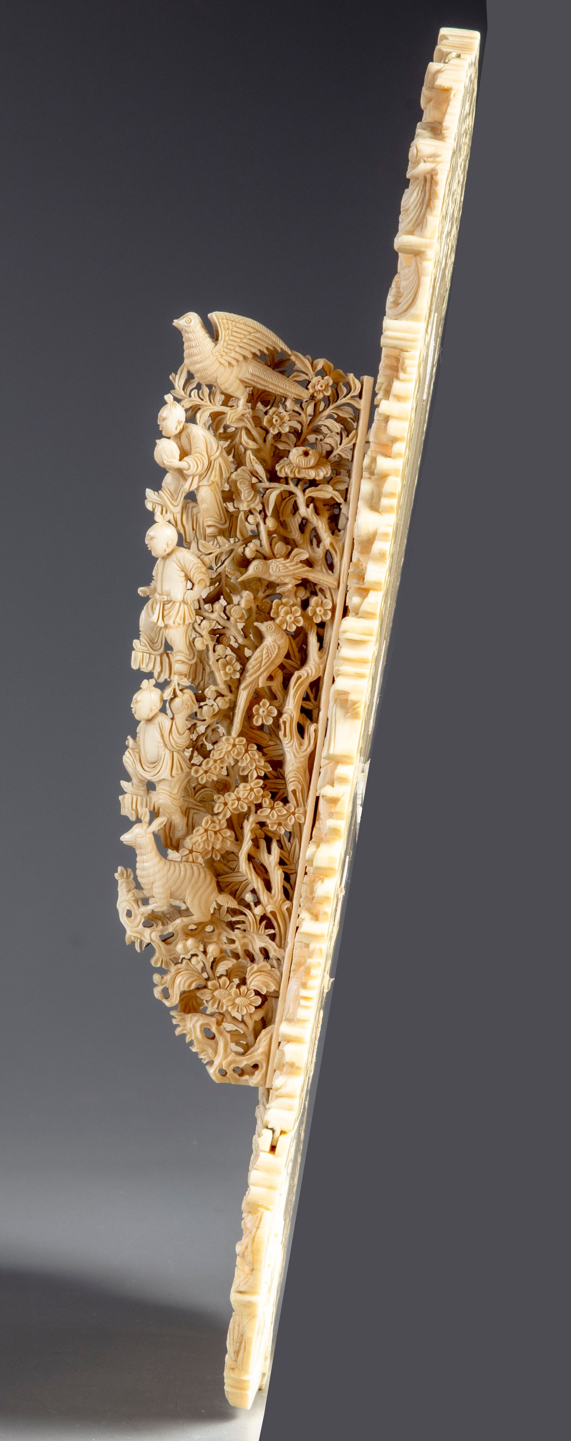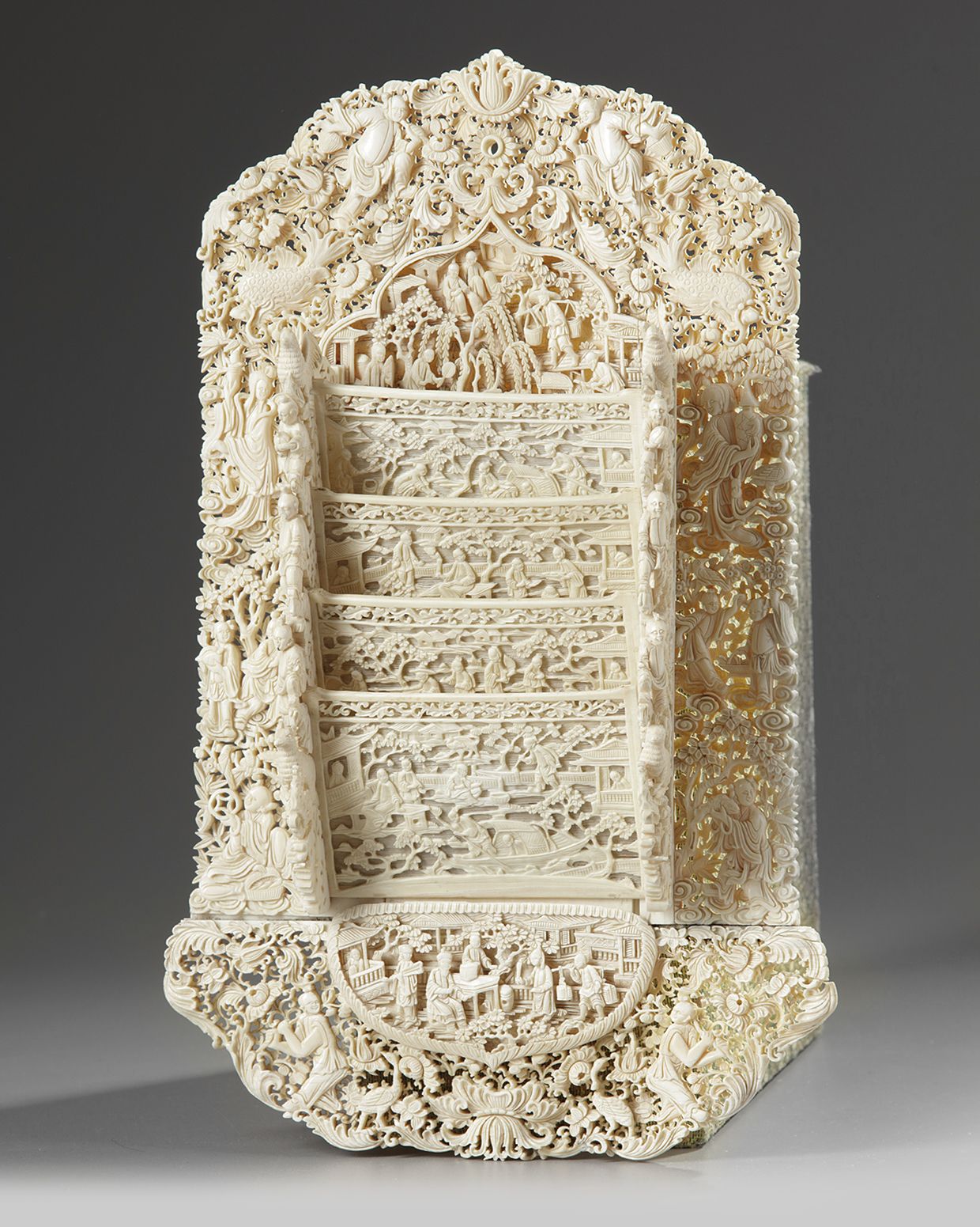 The letter rack is finely carved and pierced to the centre with multiple stacked trays for letters, the trays decorated with figures at leisure. The backboard is carved with further Immortals mirrored on both sides, all on a ground of scrolling flowers and foliage.