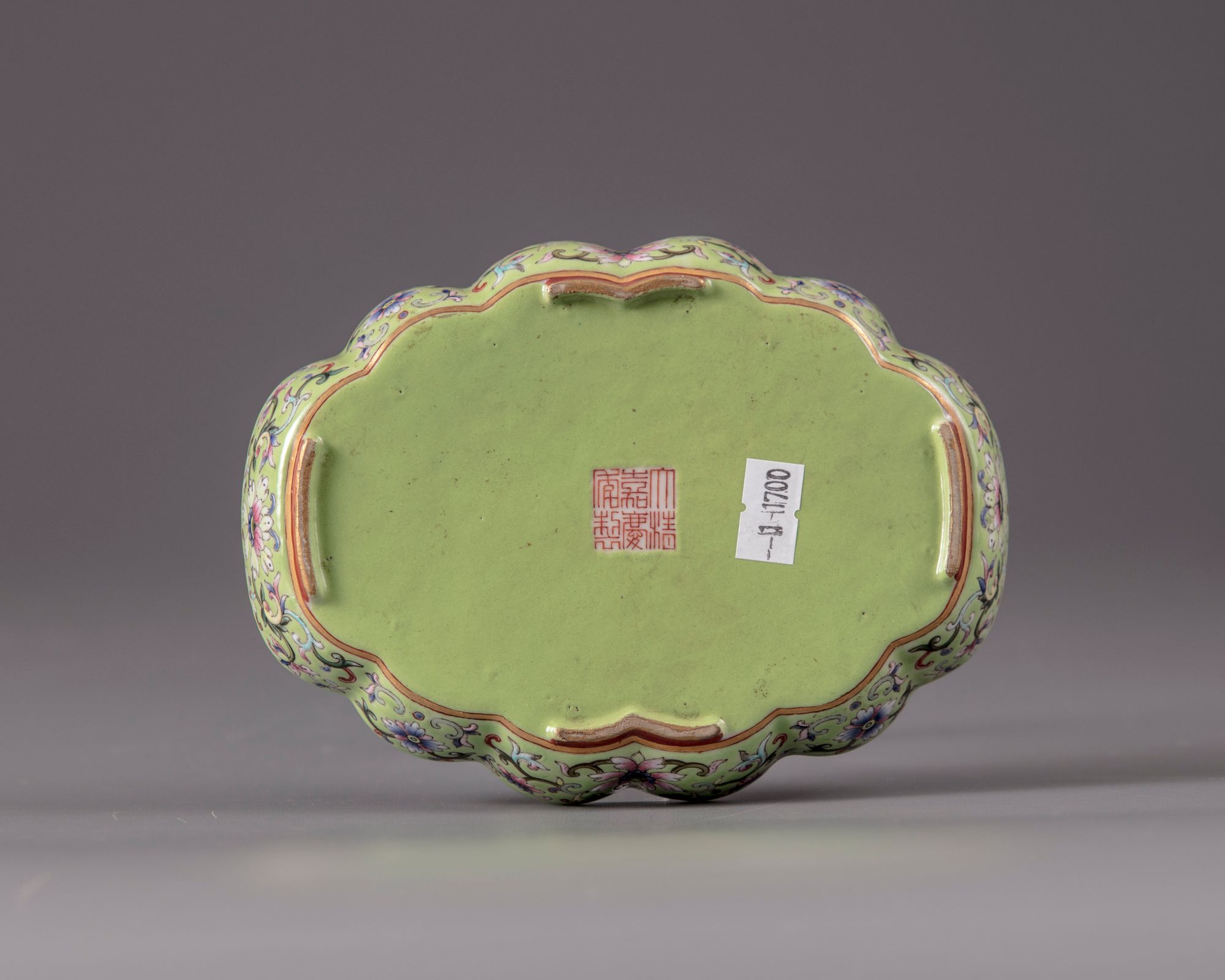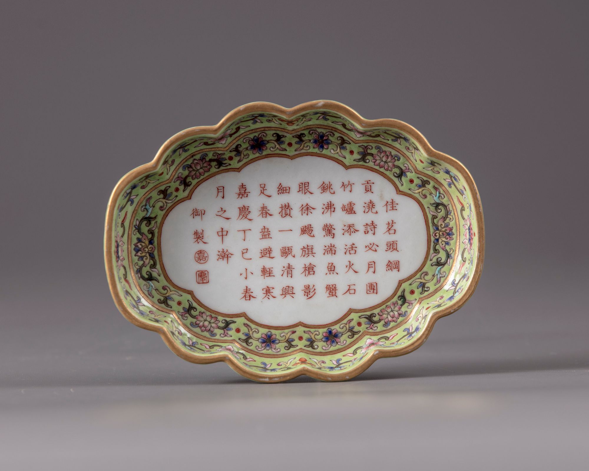 The quadrilobed tray is inscribed in iron red within a cartouche enclosing an imperial poem cyclically dated to dingsi year, and the two characters yuzhi and two seals, Jia and Qing. The panel is surrounded by a band of detached composite floral sprays, beneath a further band of floral sprays of larger size on the sides, which is repeated on the exterior. The base is covered with a lime-green enamel reserving an apocryphal Jiaqing mark.