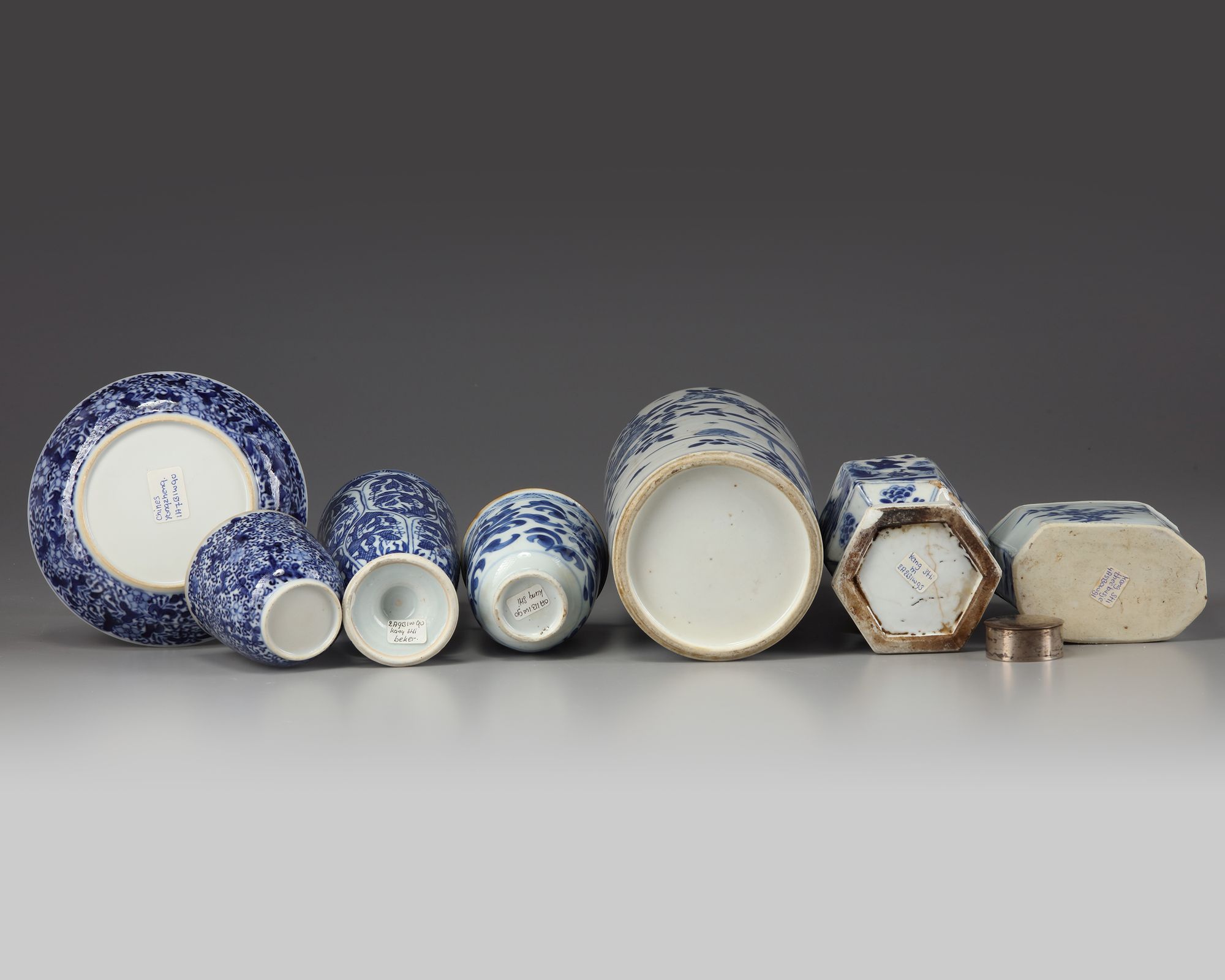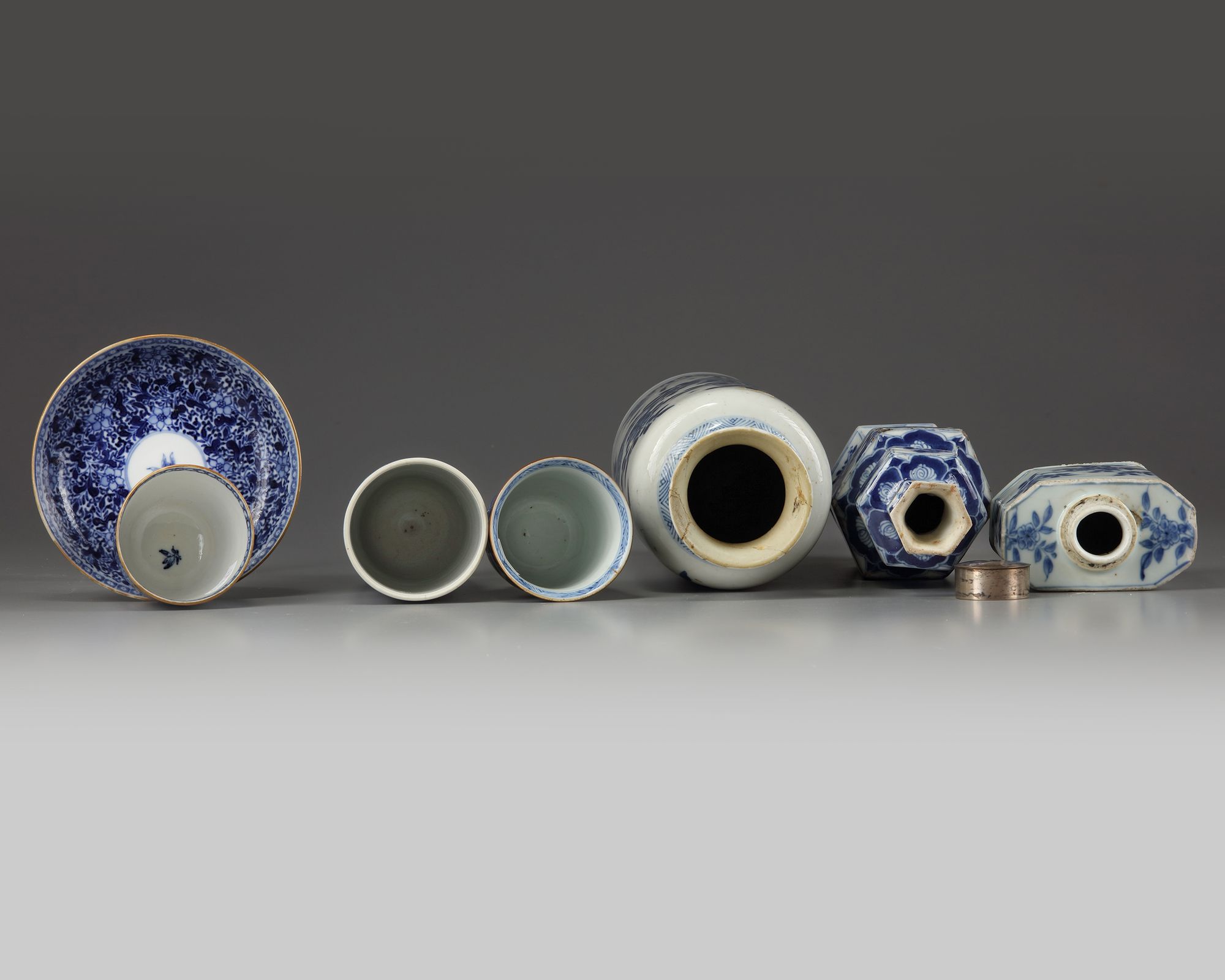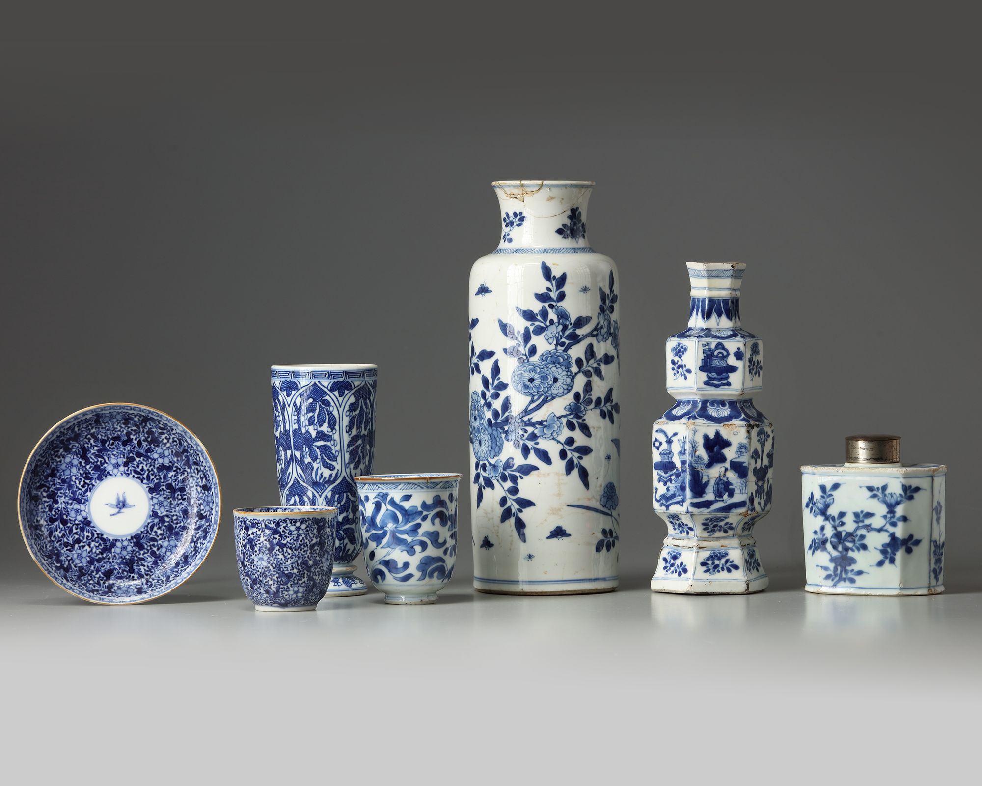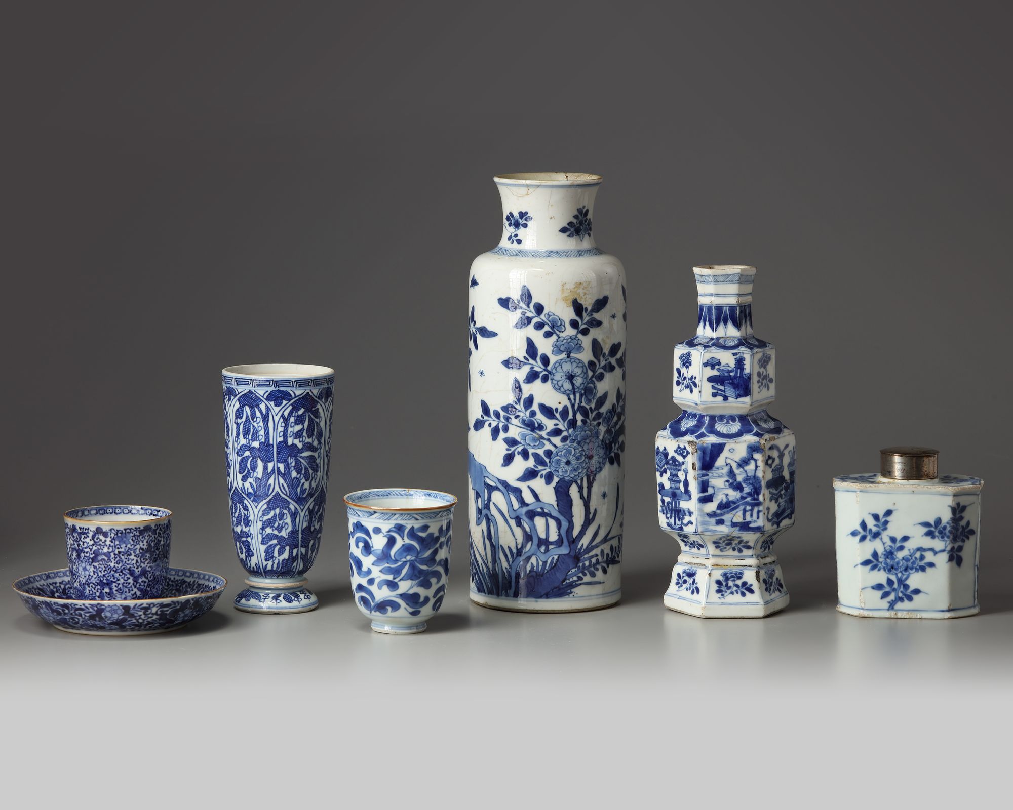 The group comprises: a tea caddy with a silver cover; cup and cover densely decorated with flower scrolls; a cup decorated with scrolling lotus; a beaker decorated with panels; a hexagonal double gourd vase decorated with figure and precious objects; and a sleeve vase decorated with apple blossoms.
