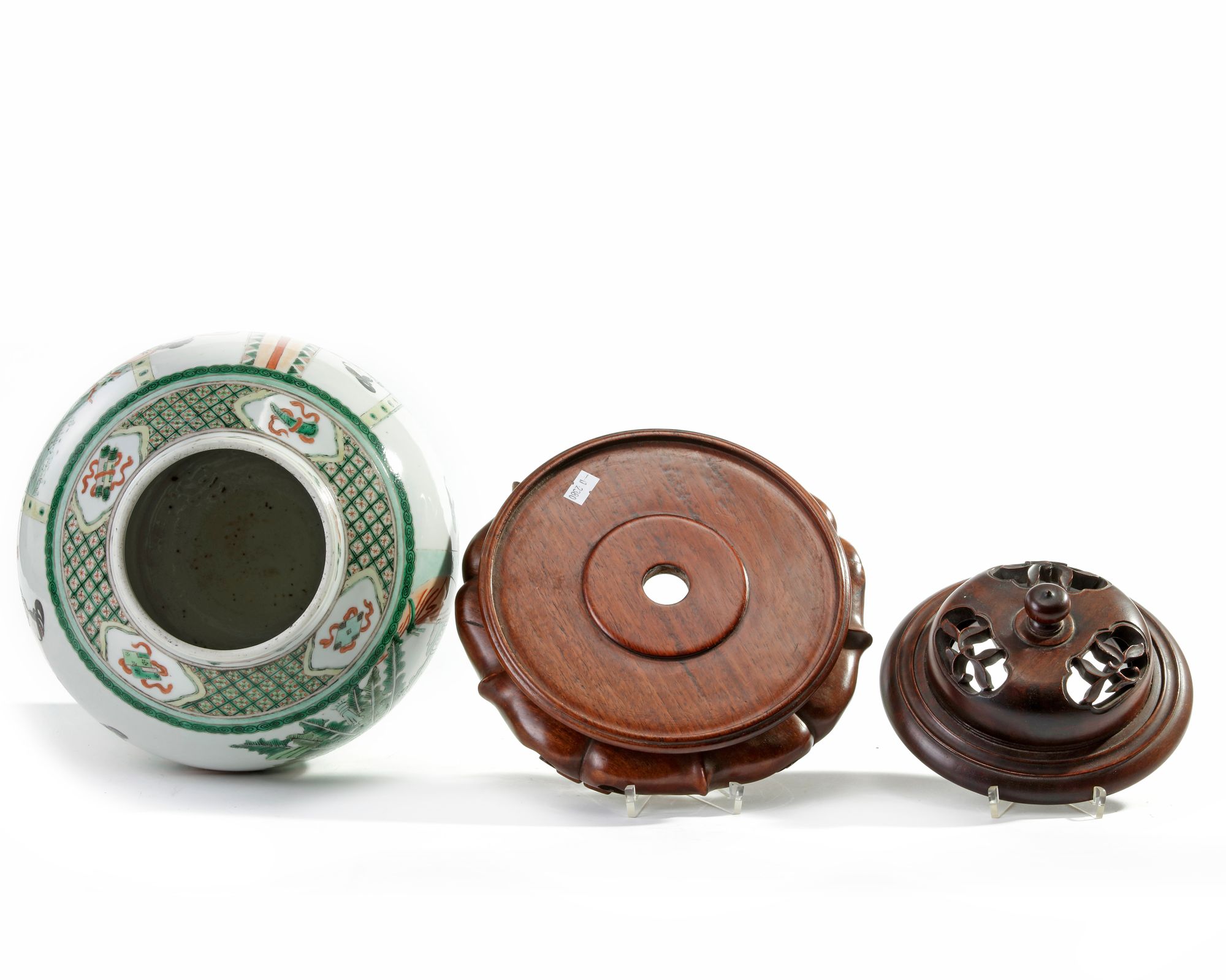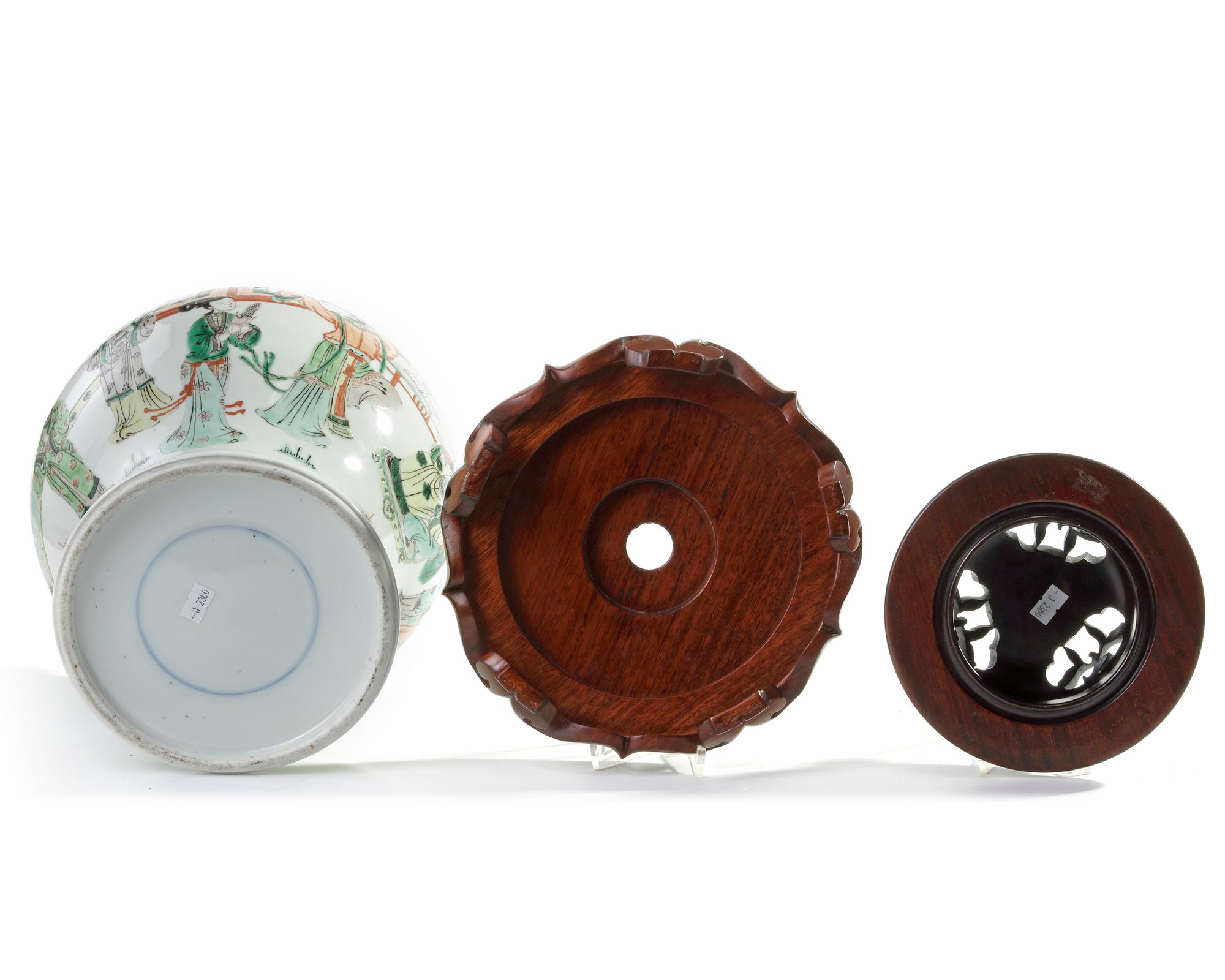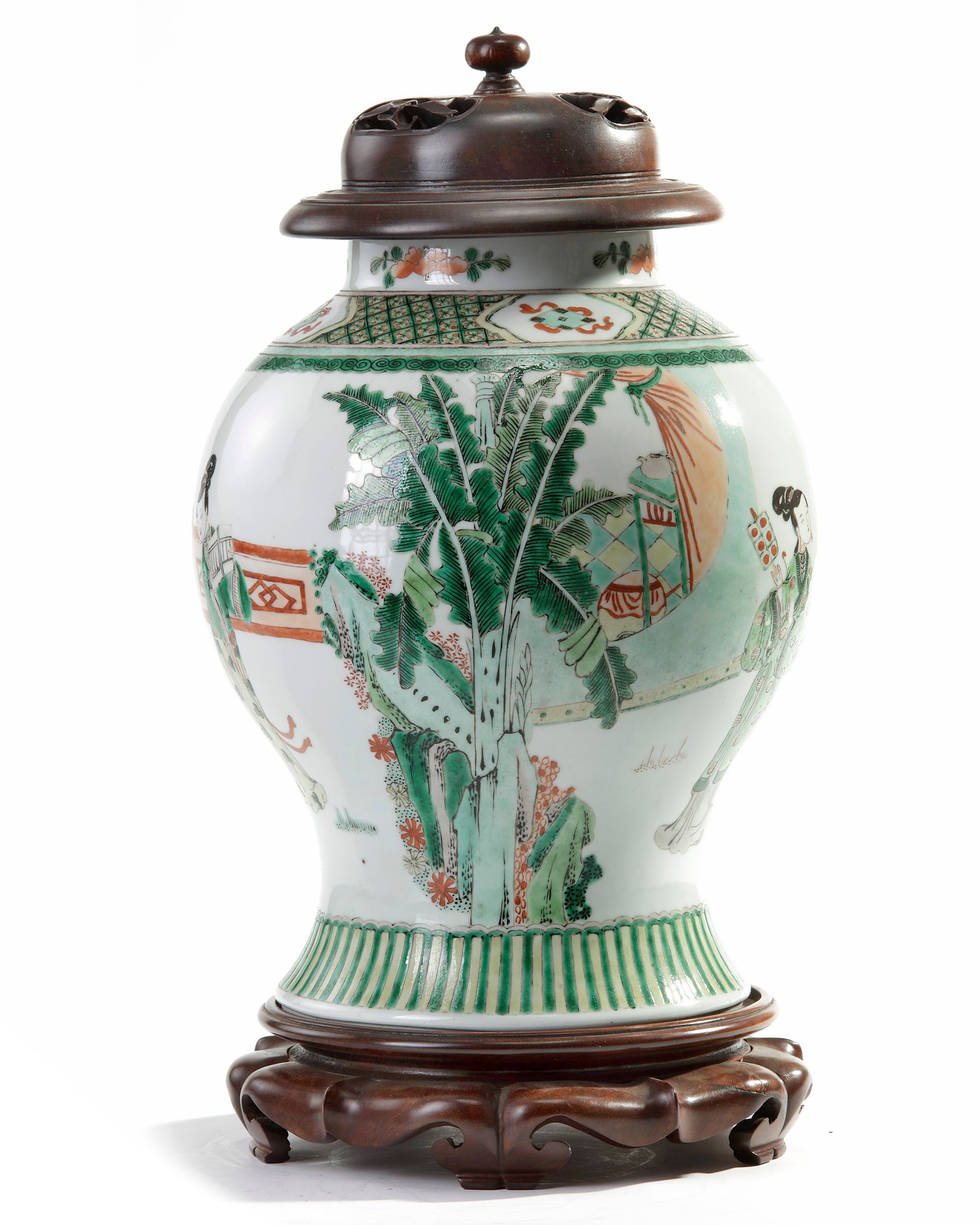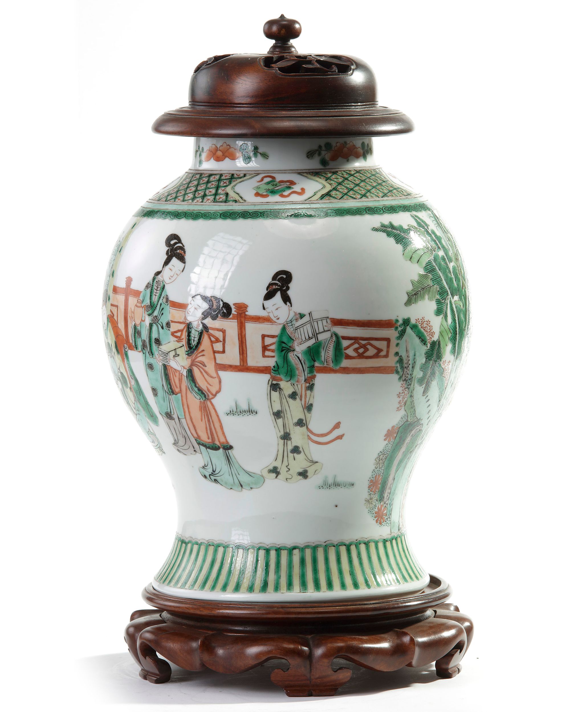 The vase is decorated with a dignitary ,surrounded by various ladies at leisure on a terrace beside a plantain tree, all set between a lappet border to the foot and a diaper band to the rim containing precious objects. The base with a double circle in underglaze blue. With wood stand and cover.