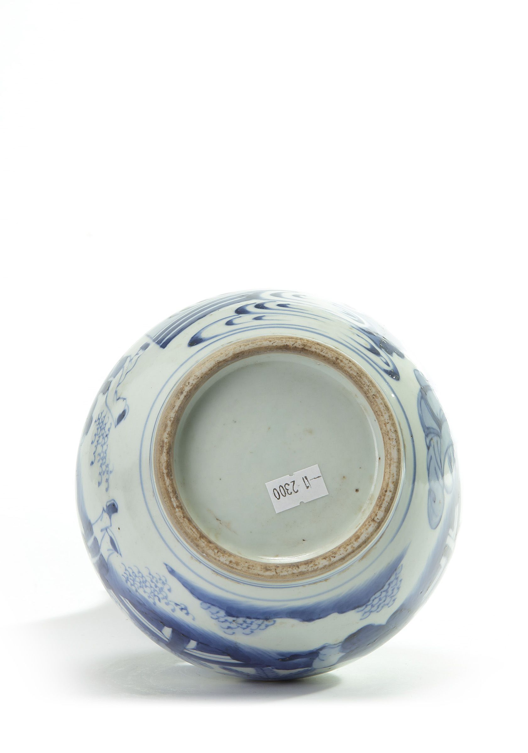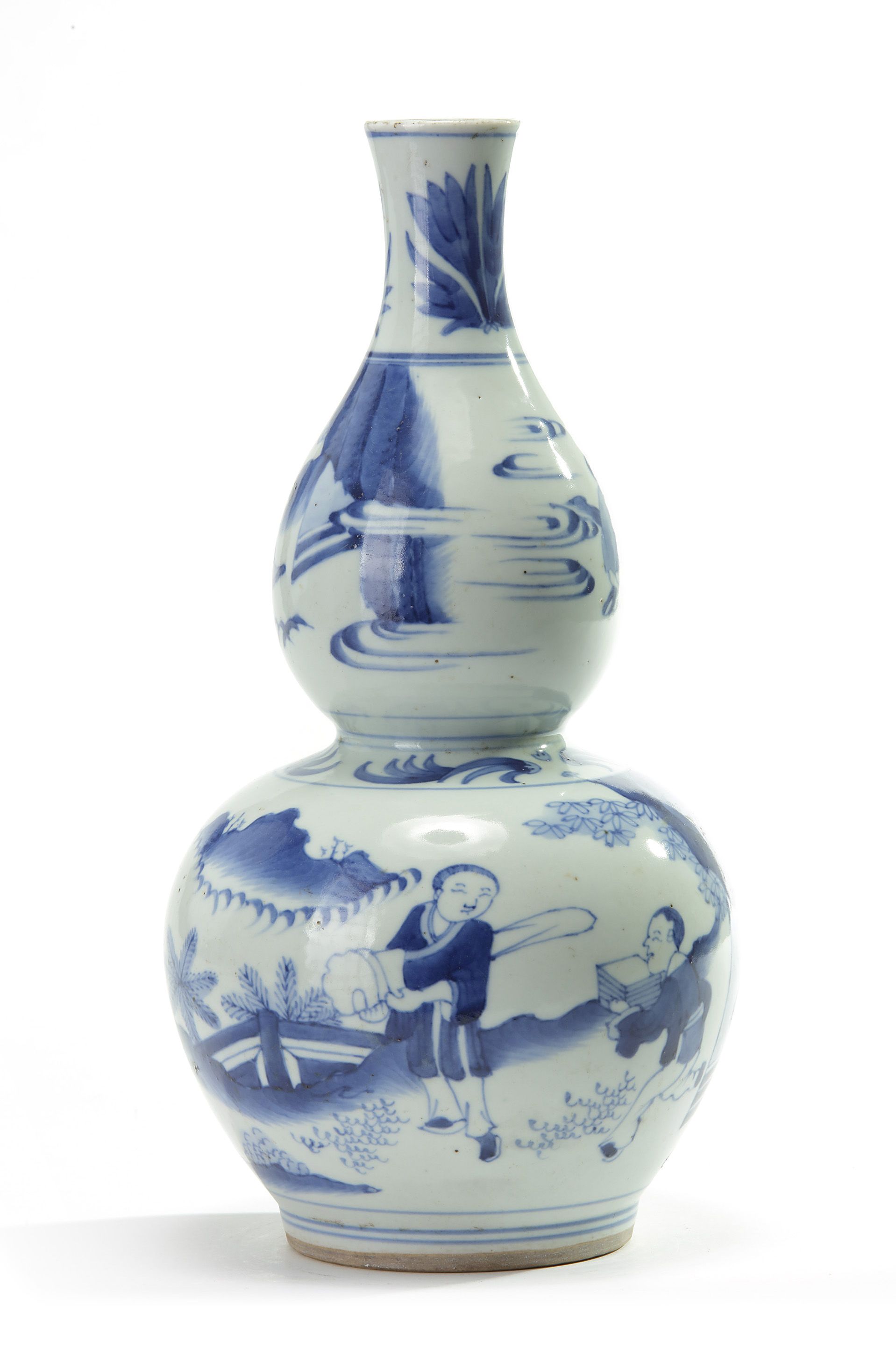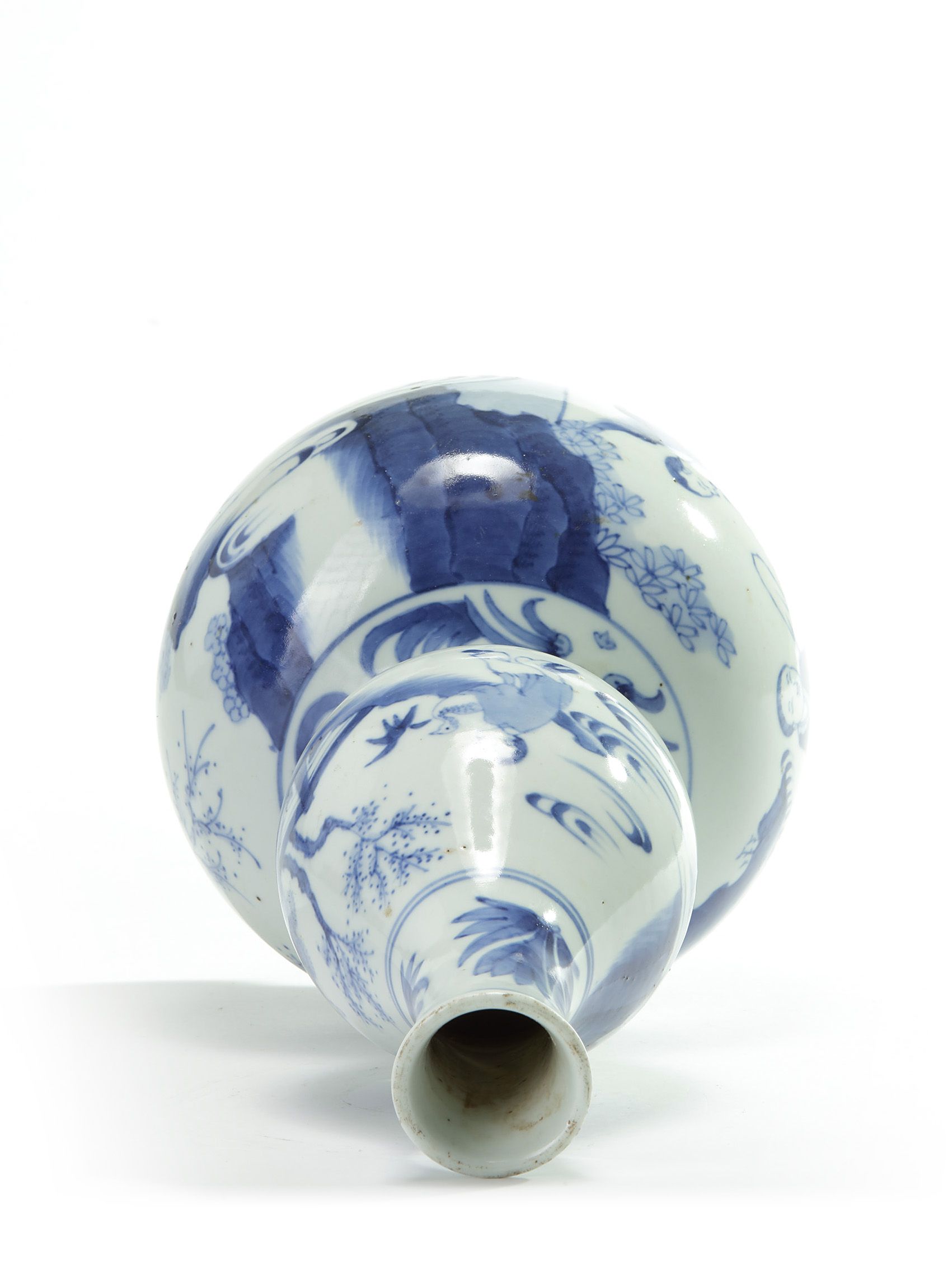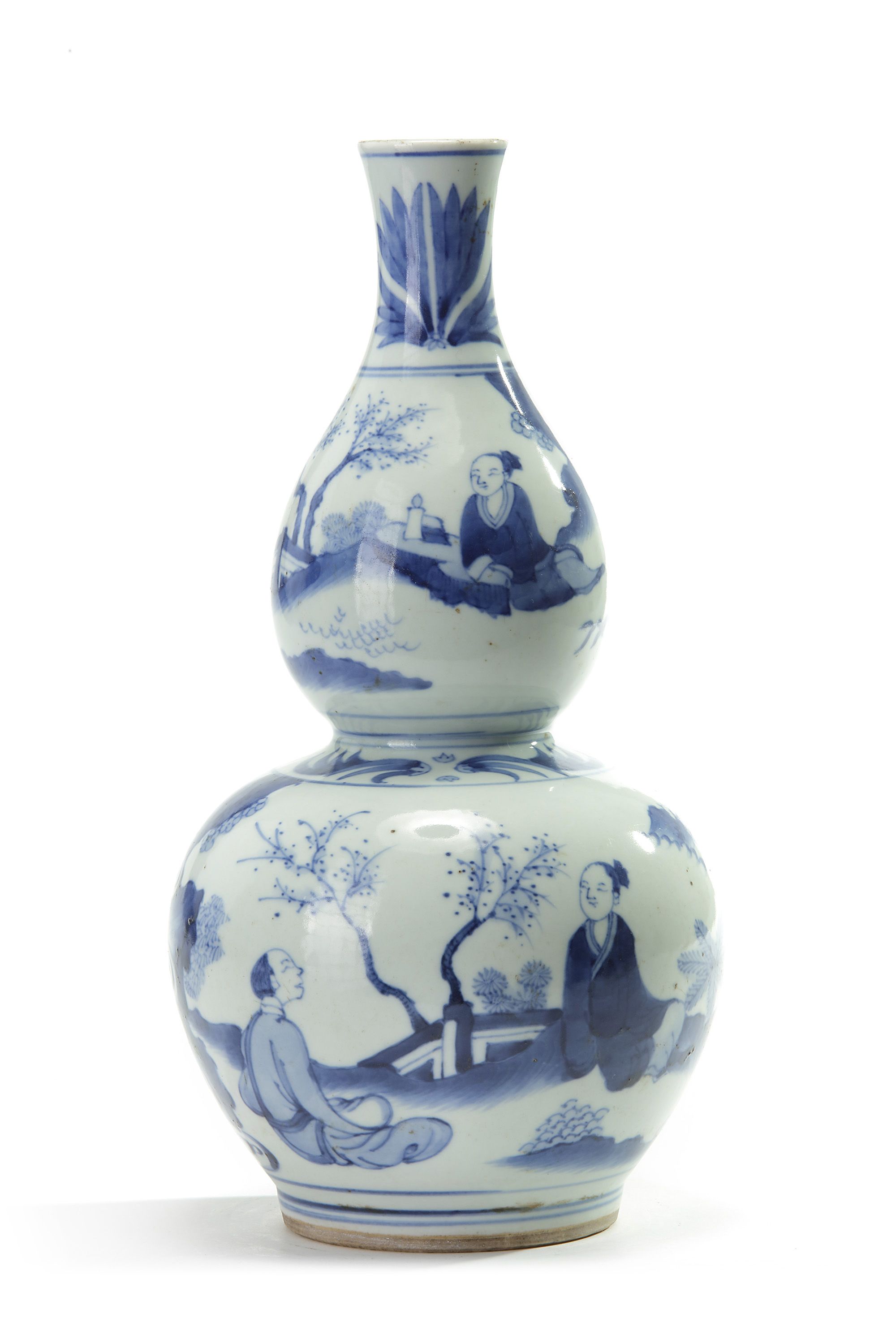 The lower compressed section is decorated with a scene depicting a scholar with an attendant seated in a garden and children at play, beneath the upper pear-form section which is decorated with a scholar an attendant below the slender neck with tulip motifs.