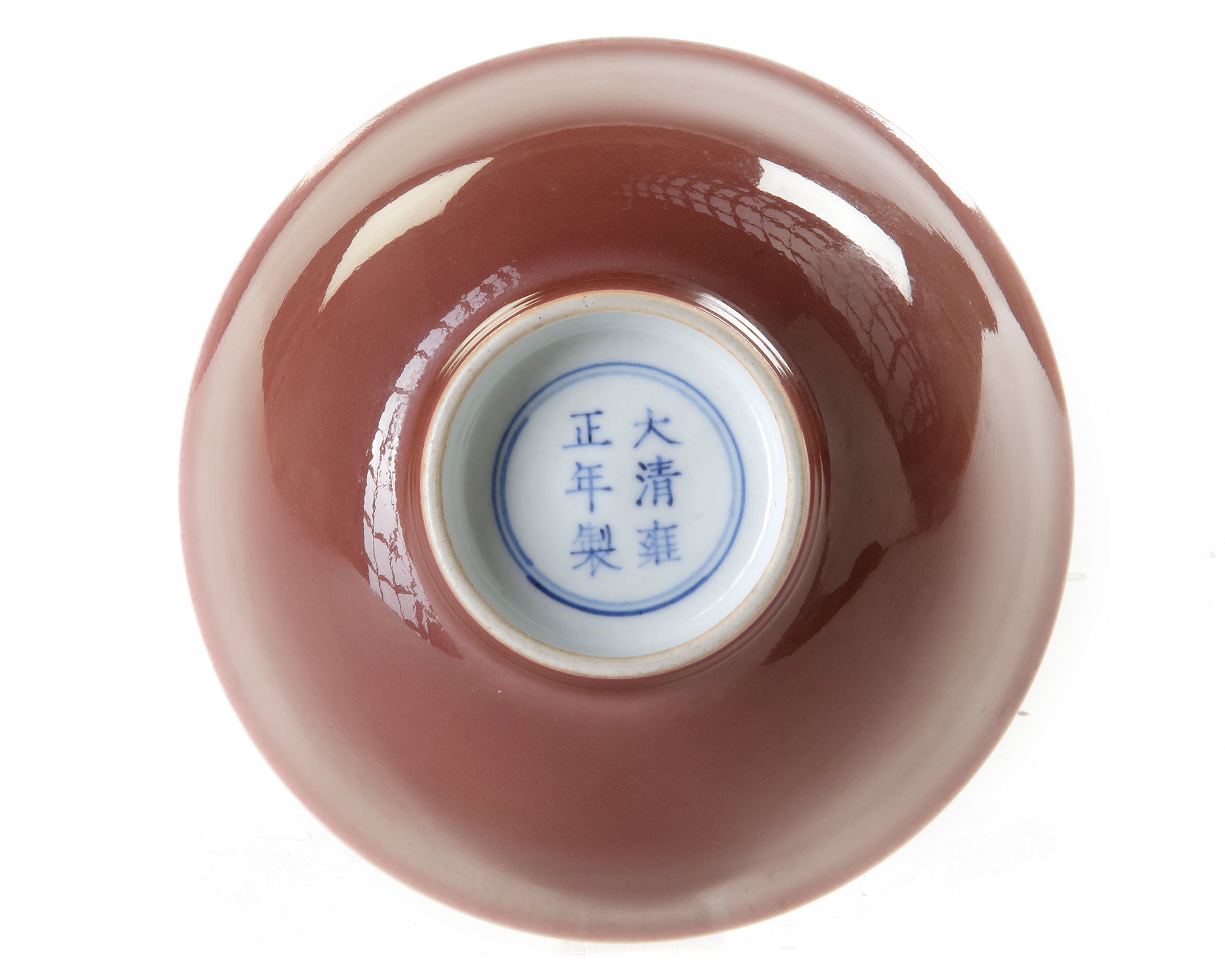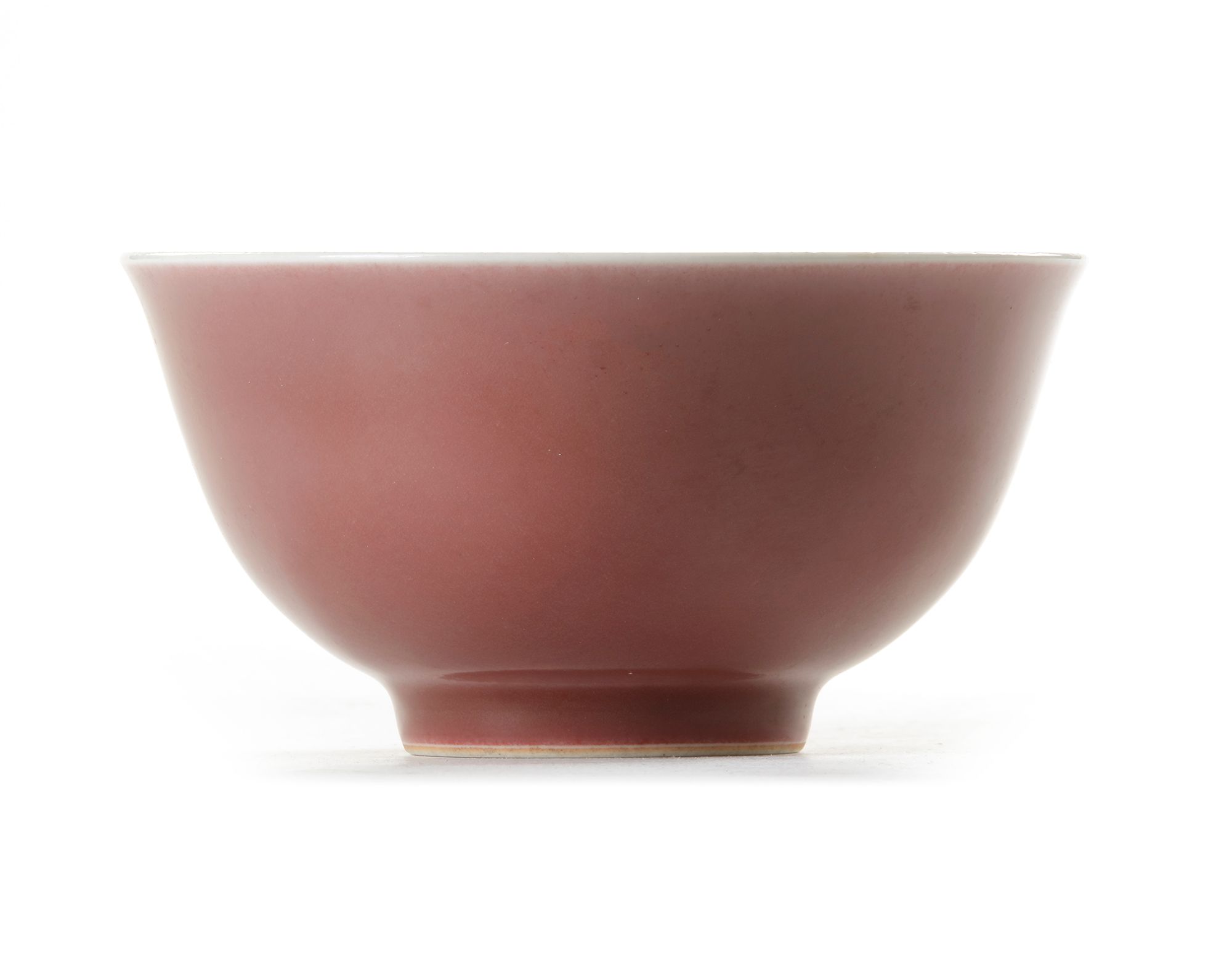 The bowl is glazed to the exterior with a peachy copper red glaze fading slightly at the rim. The interior and base are glazed white, the base with an apocryphal Yongzheng mark.