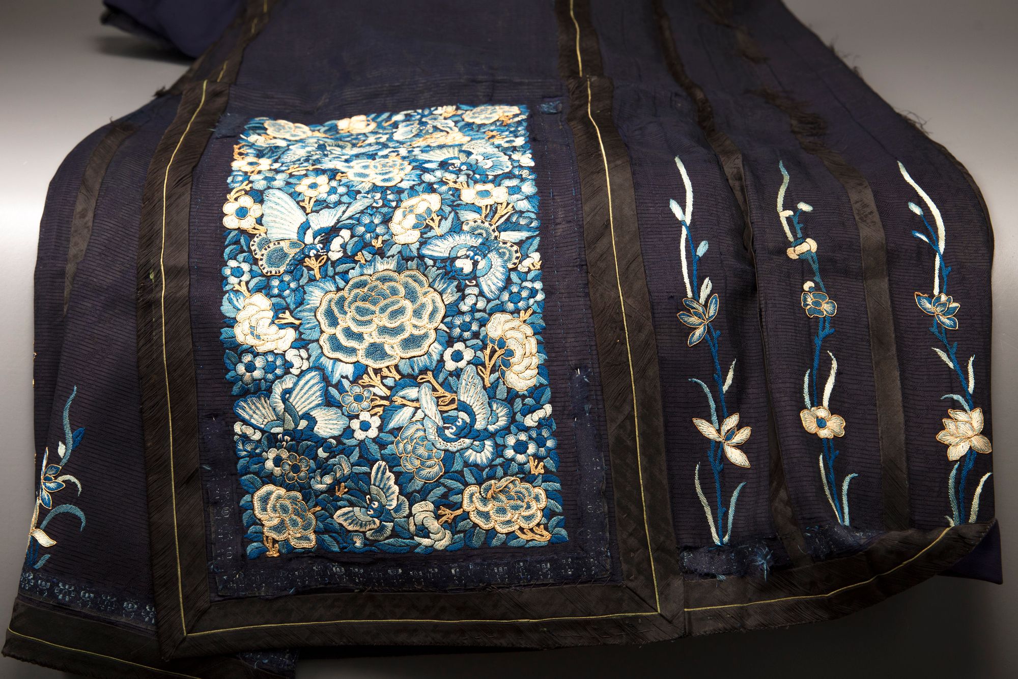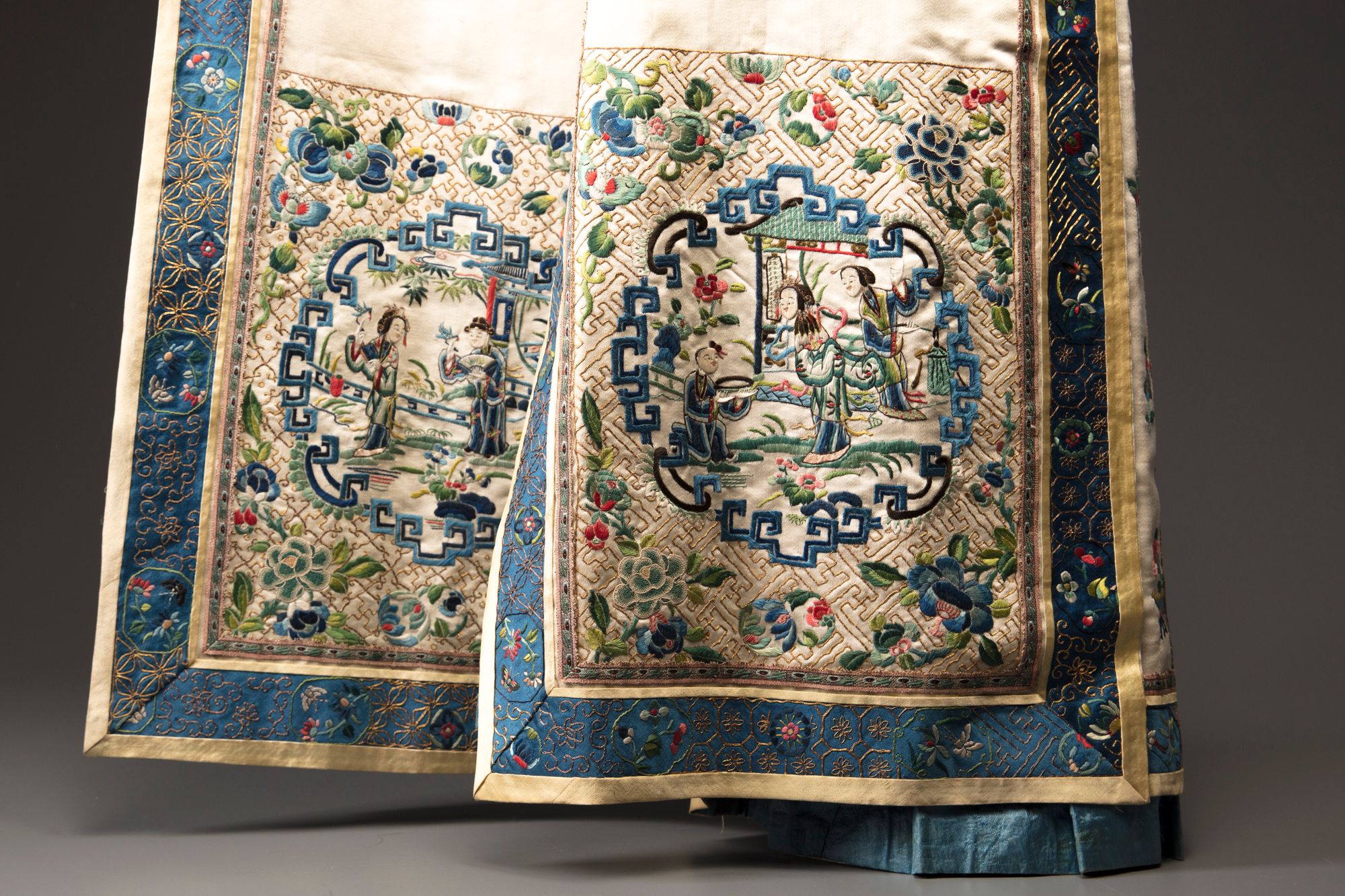 The first is an ivory-ground skirt, decorated with embroidered and couched figural panels surrounded by flower sprays on a wan-design ground. The pleats are decorated with auspicious objects and flowers. The second are two dark blue-ground gauze skirt panels decorated with flowers and butterflies in the 'three blues' palette, the pleats are embroidered with further flowers.