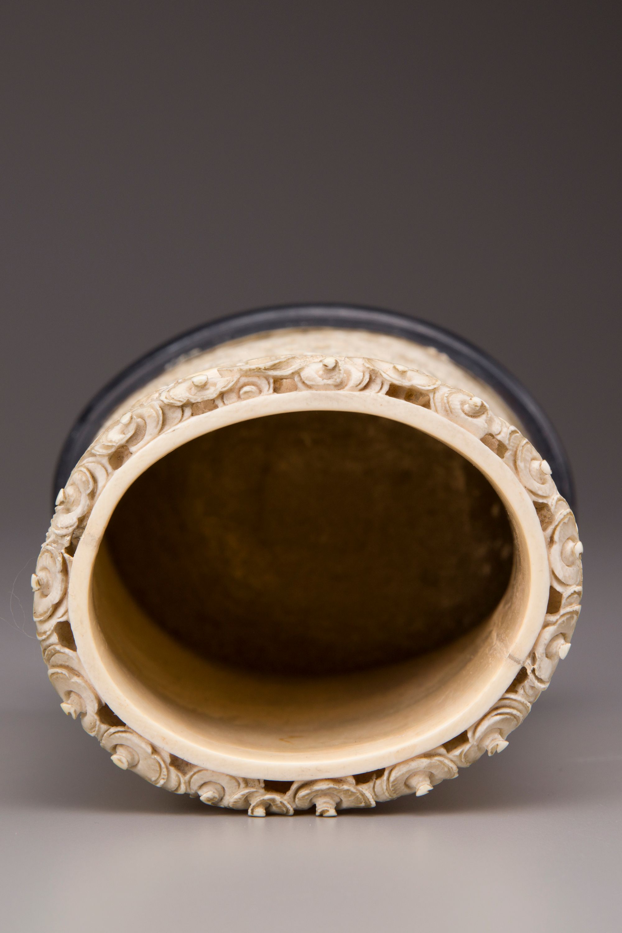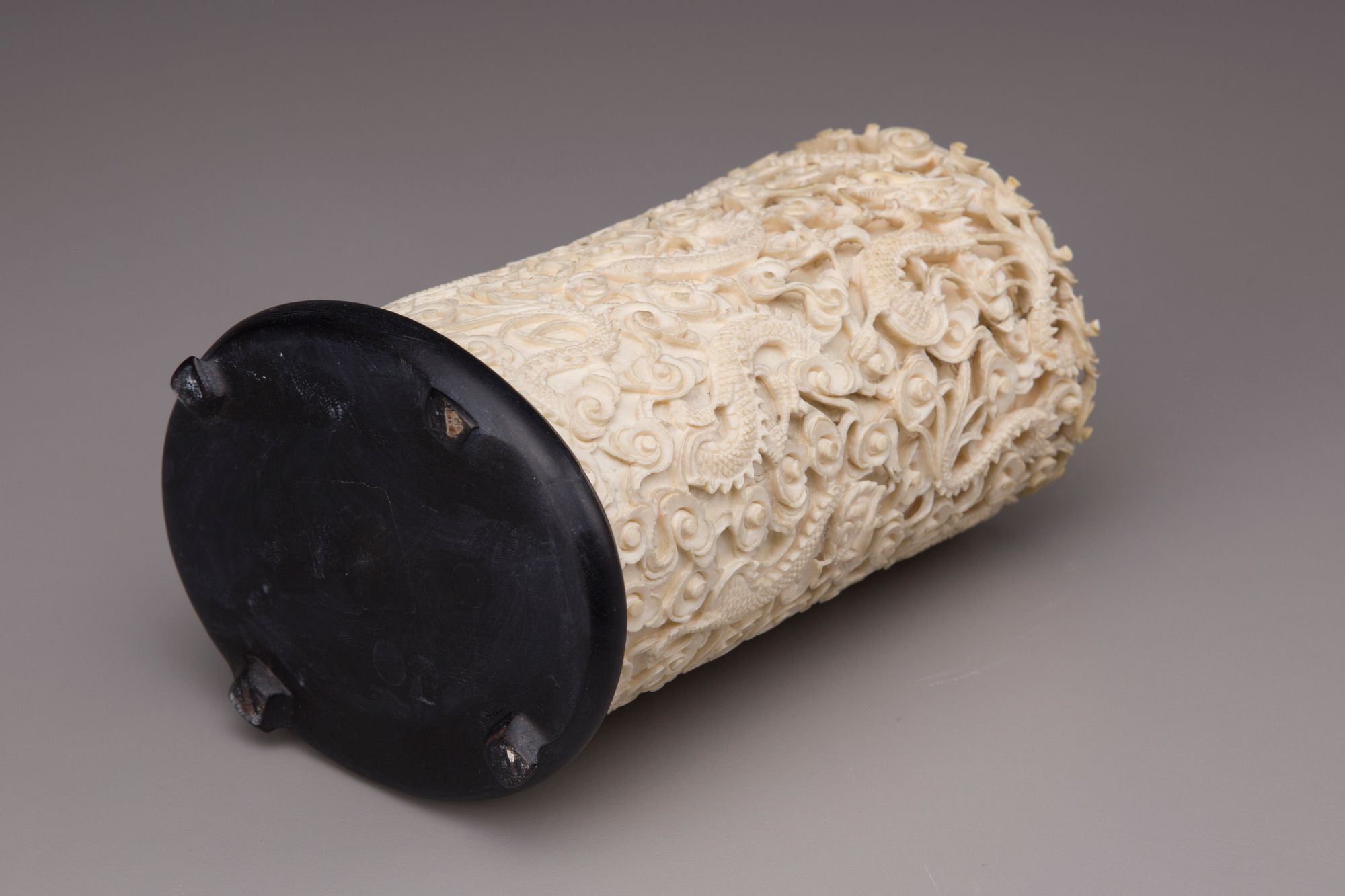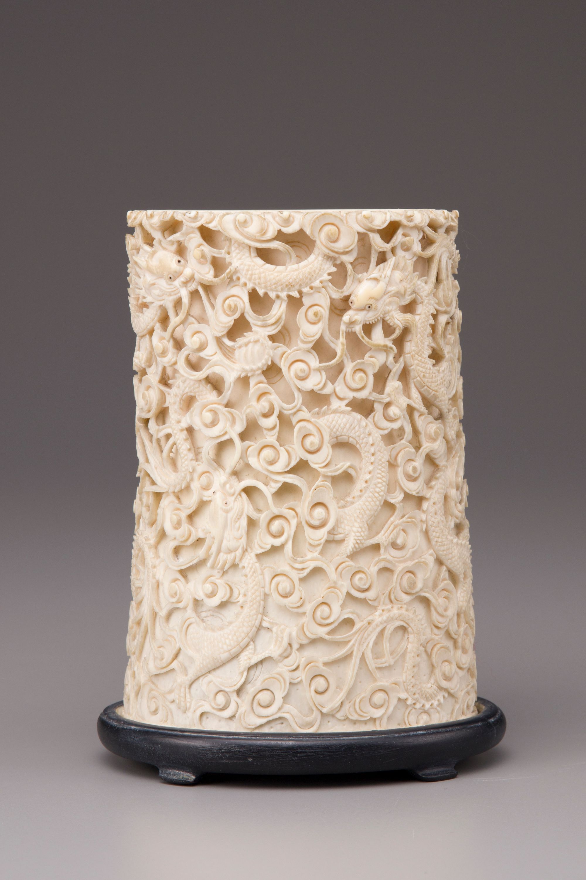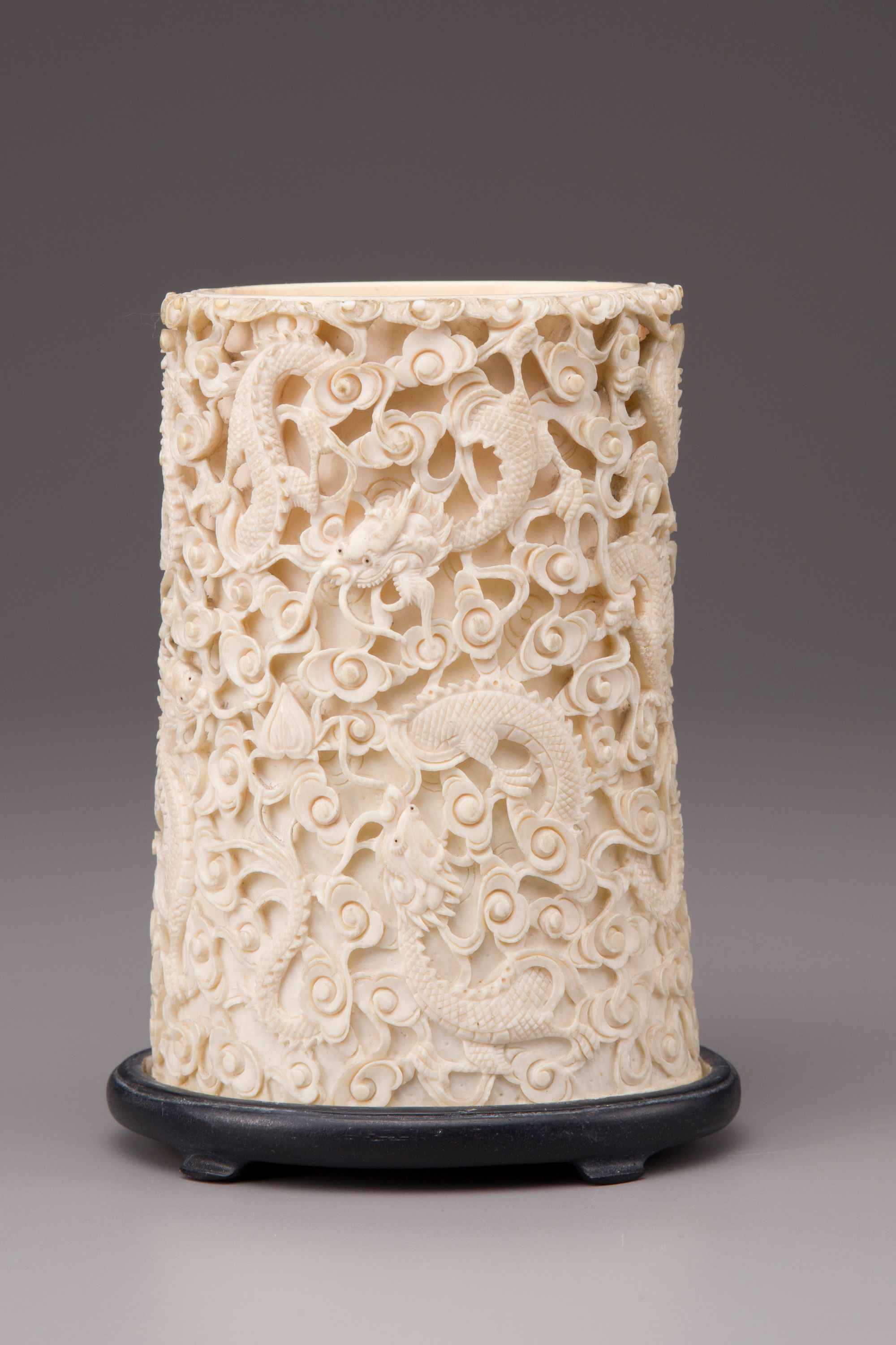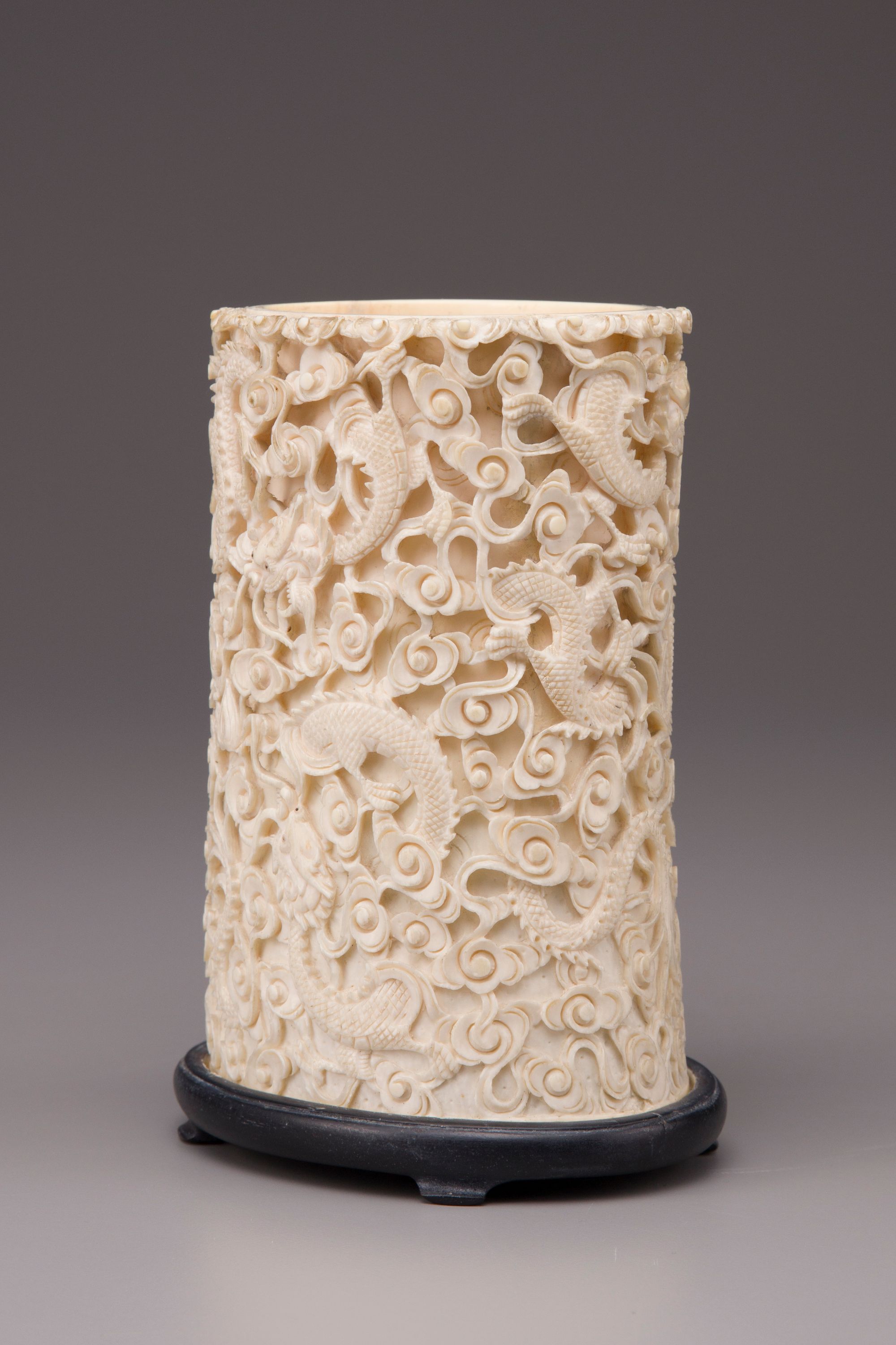 The sides are carved and pierced in high relief with six dragons in flight among scrolling clouds. With a wood stand.