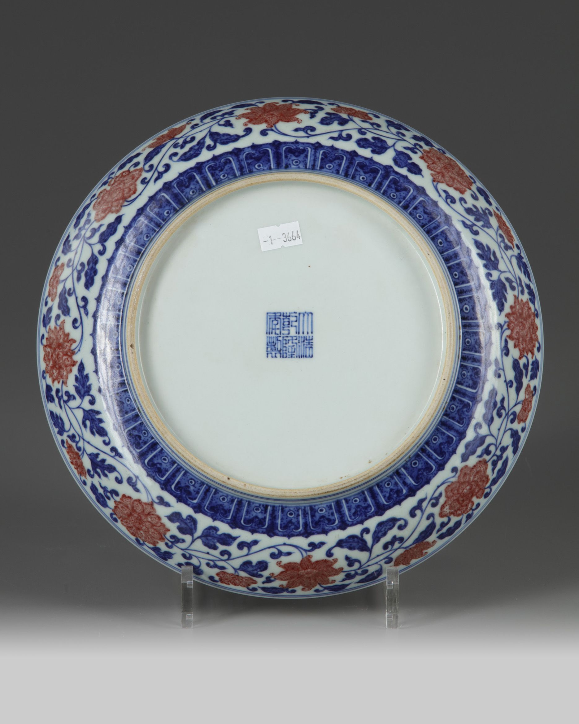 The dish is decorated to the interior with various lotus and floral blooms in underglaze copper red borne on leafy underglaze blue vines, all below a scroll band to the rim. The exterior is similarly decorated and the base with an apocryphal Qianlong mark.
