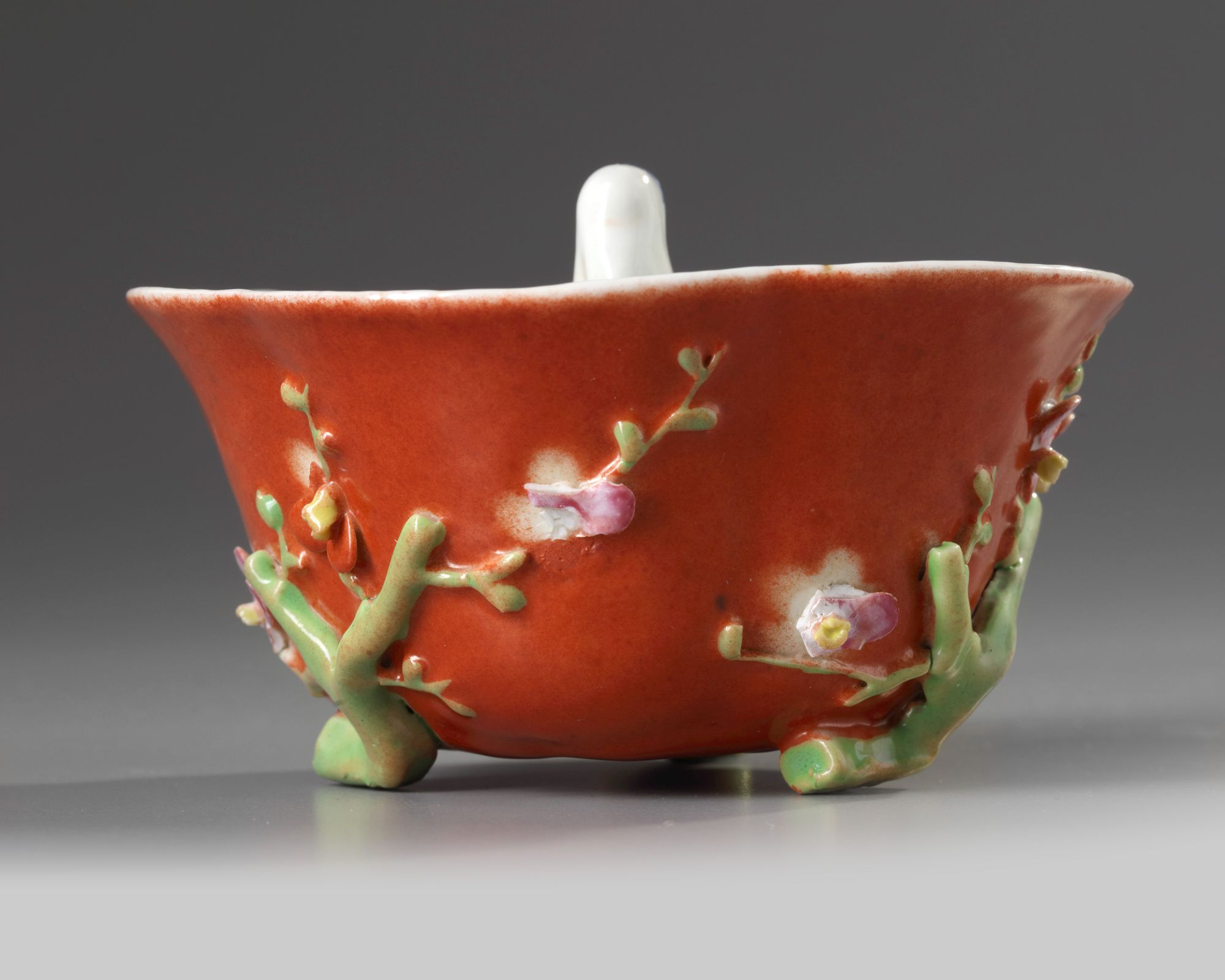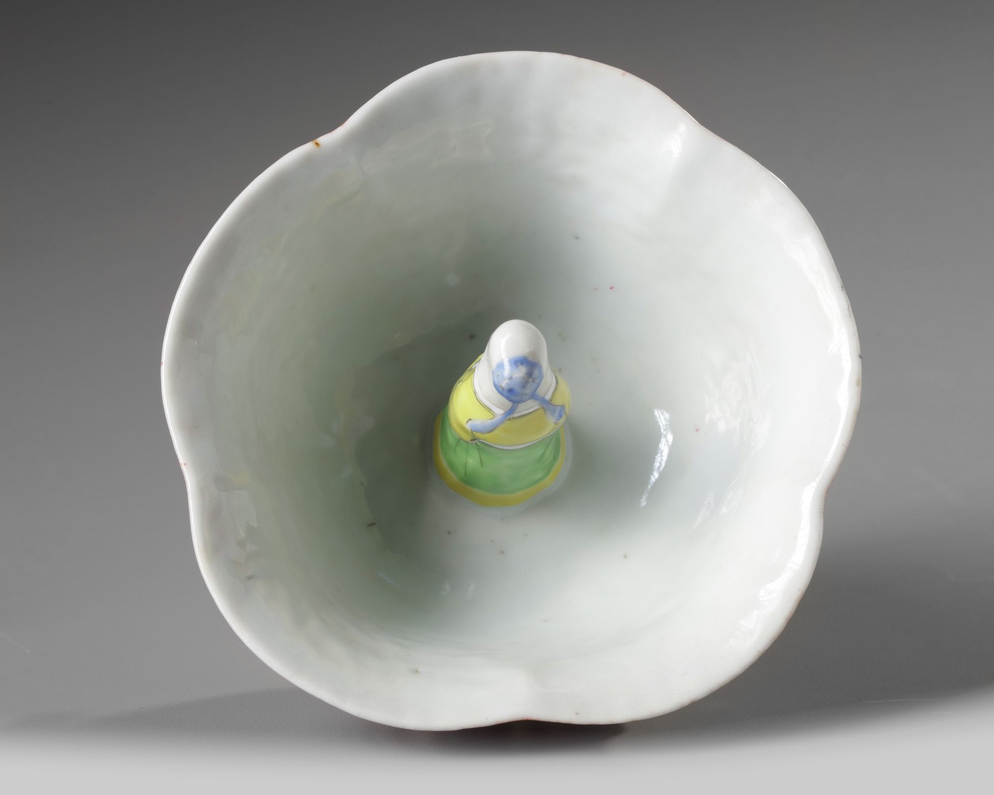 The prunus-shaped cup is decorated to the exterior with applique prunus flowers on three branches which also form the stand for the cup. The interior of the cup is modeled with a standing scholar. The exterior of the cup and the scholar are possibly later enameled.