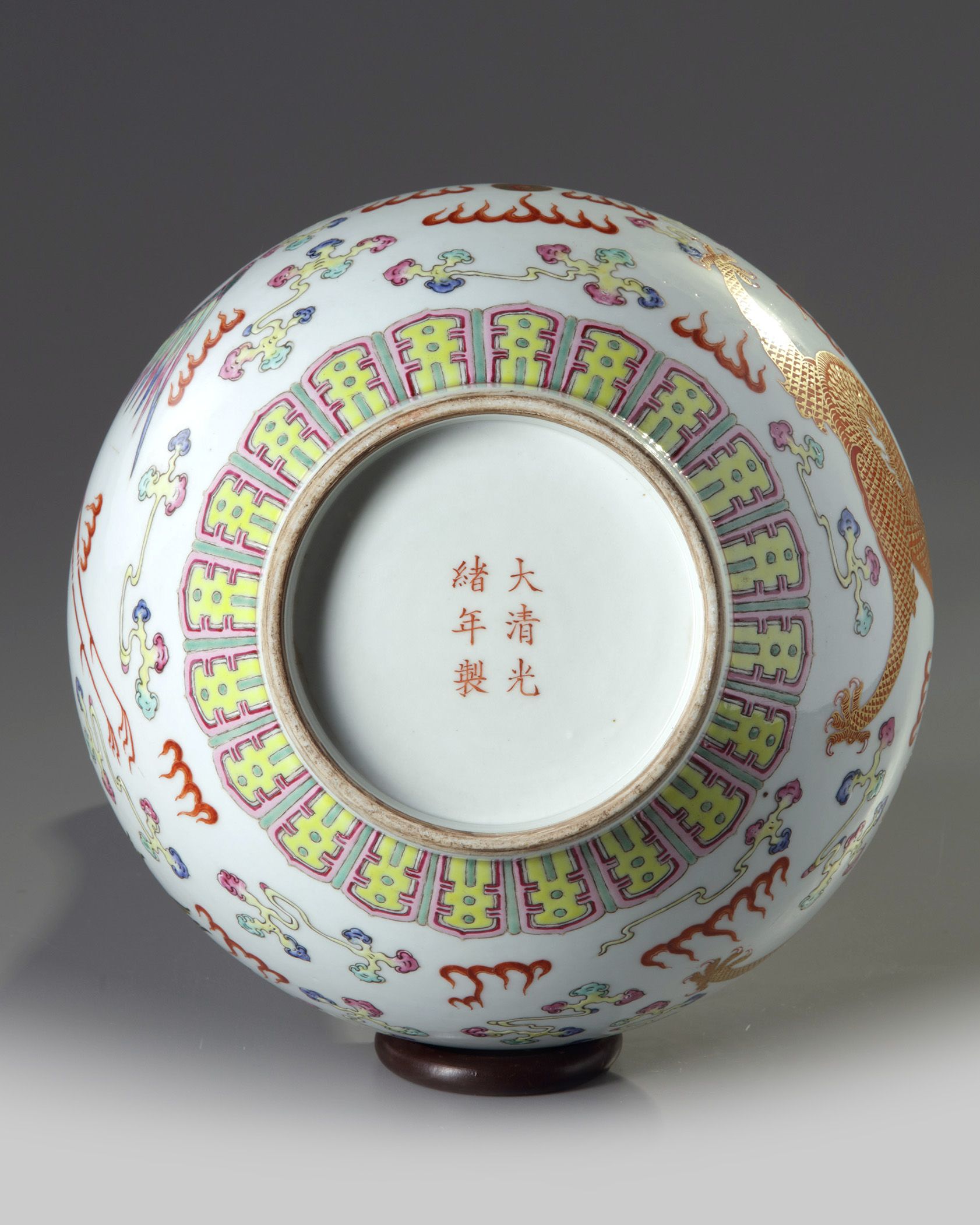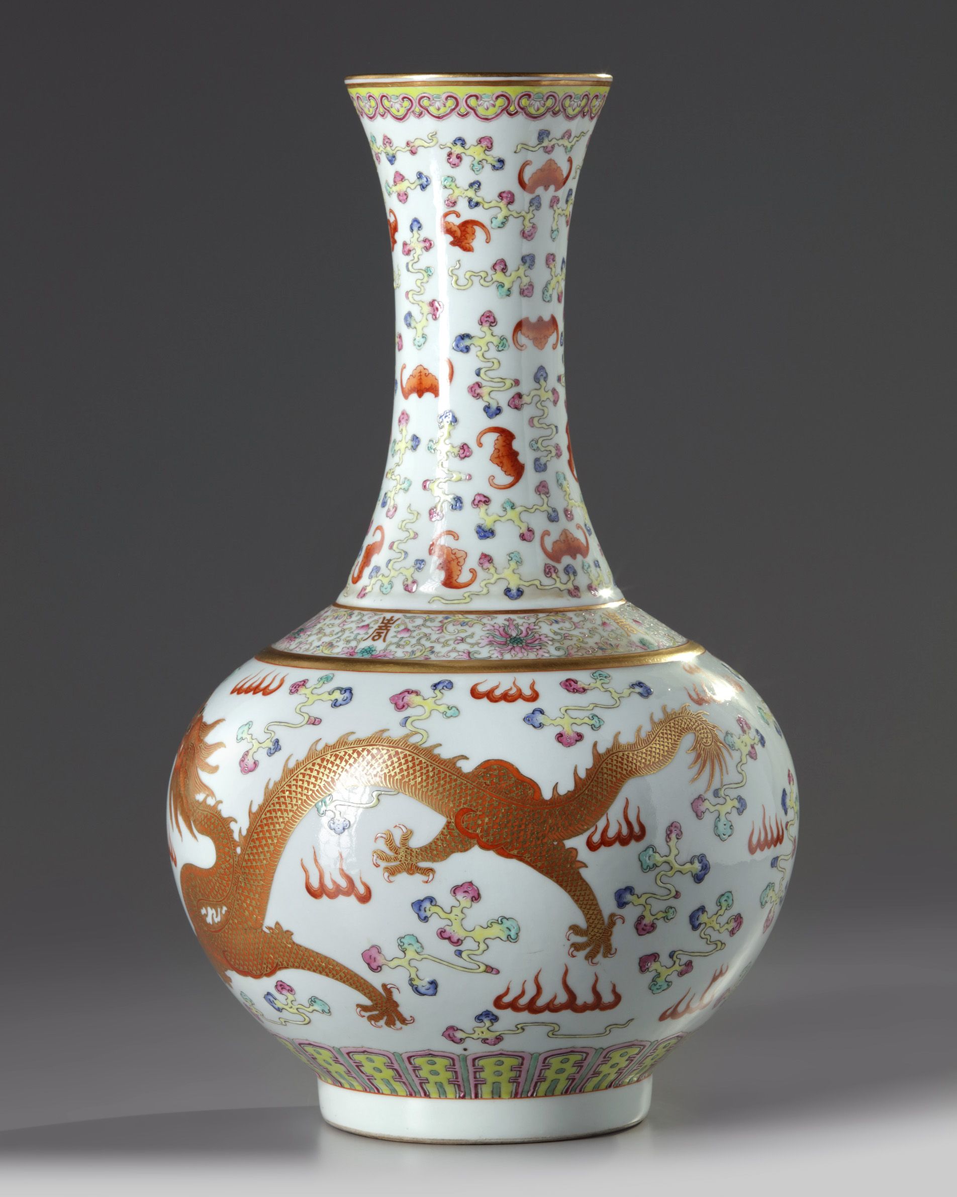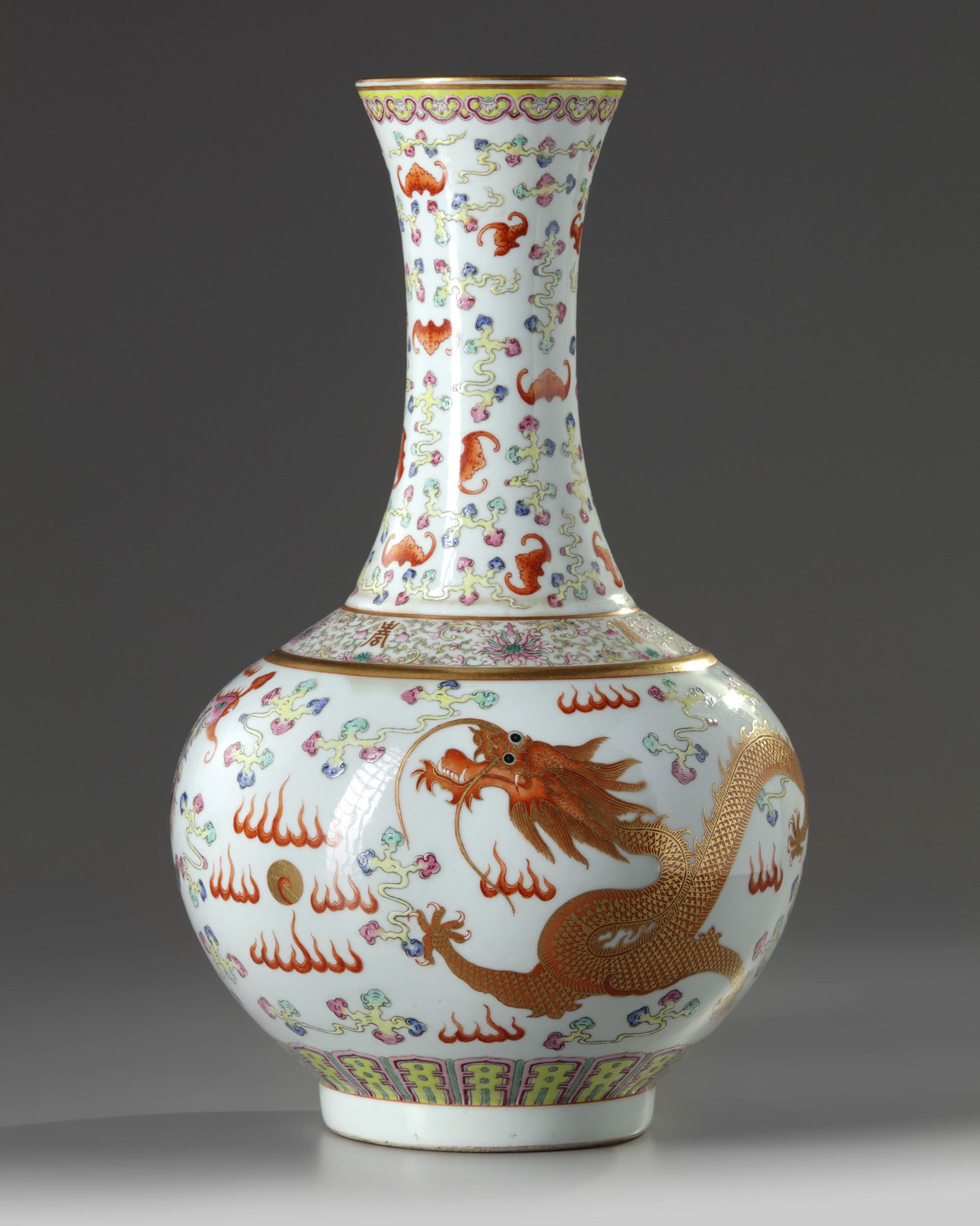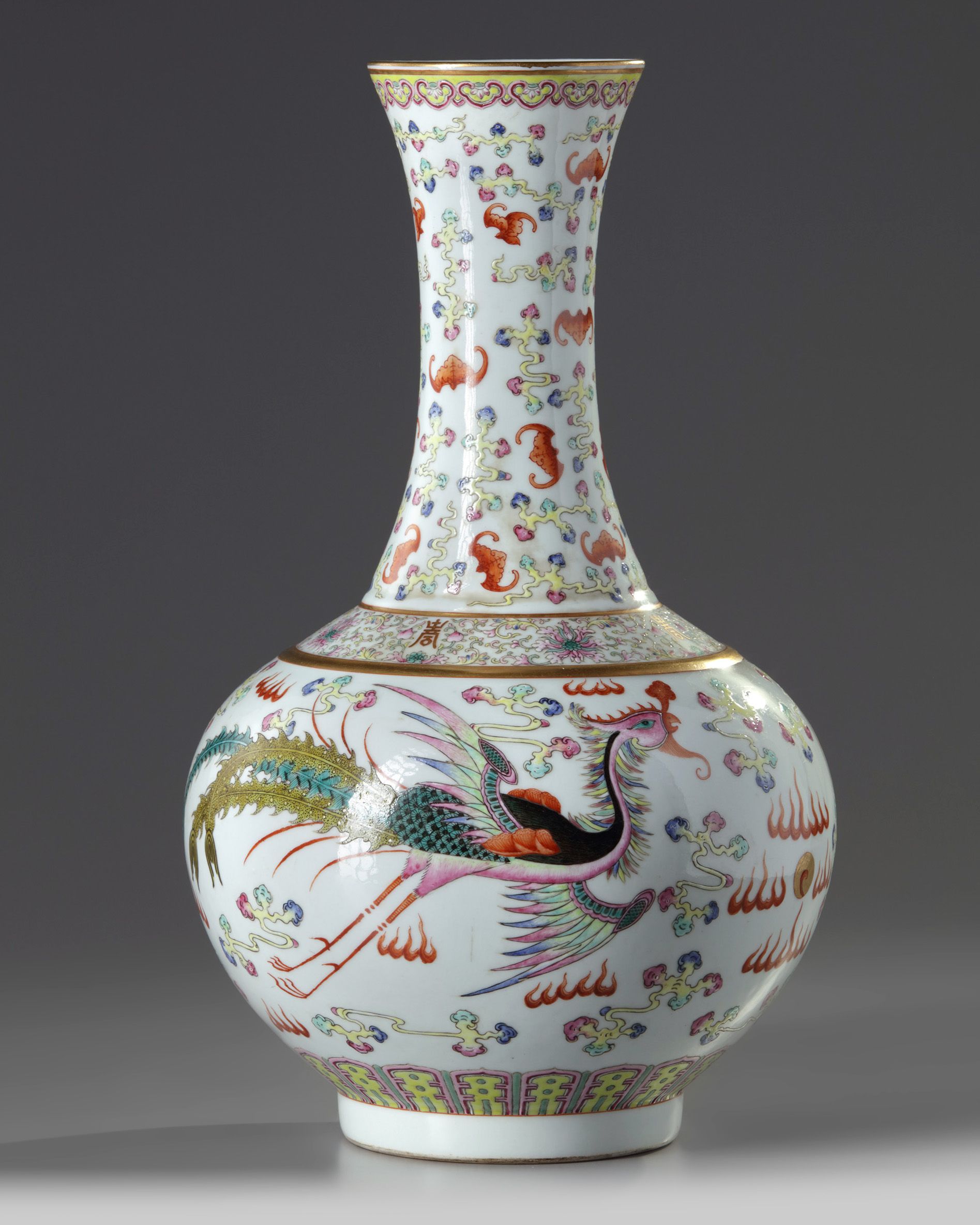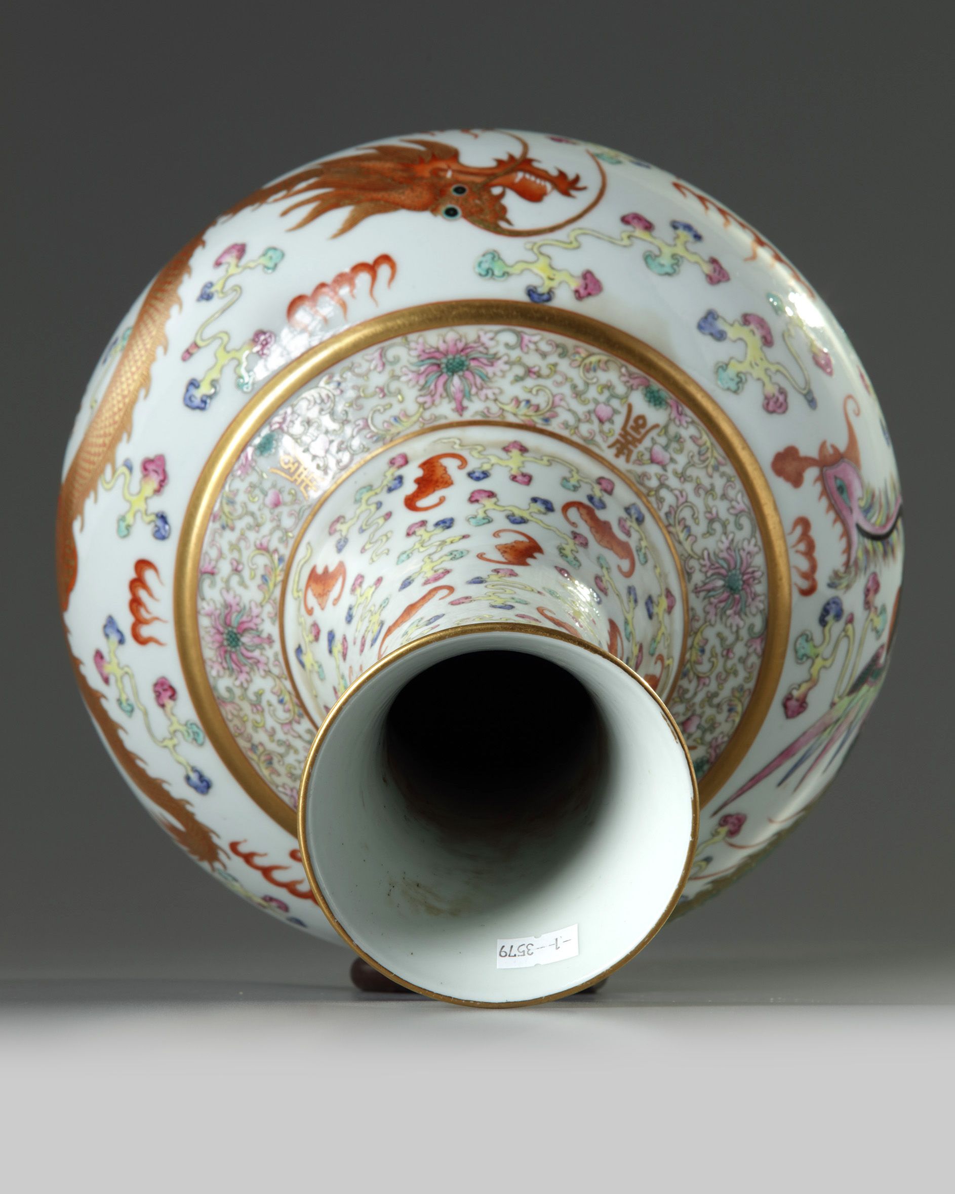 The vase is decorated to the globular body with a dragon chasing the flaming pearl and a phoenix in flight, all amongst coloured cloud scrolls. The shoulder is decorated with a shou character and scrolling lotus band, and the slender neck is decorated with bats amongst clouds. The base with an apocryphal Guangxu mark.