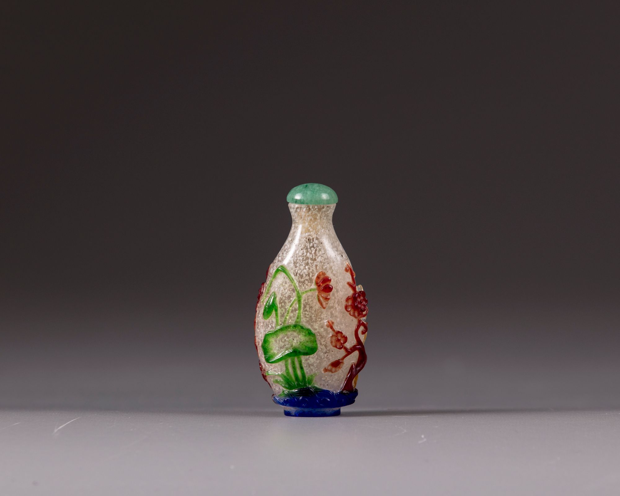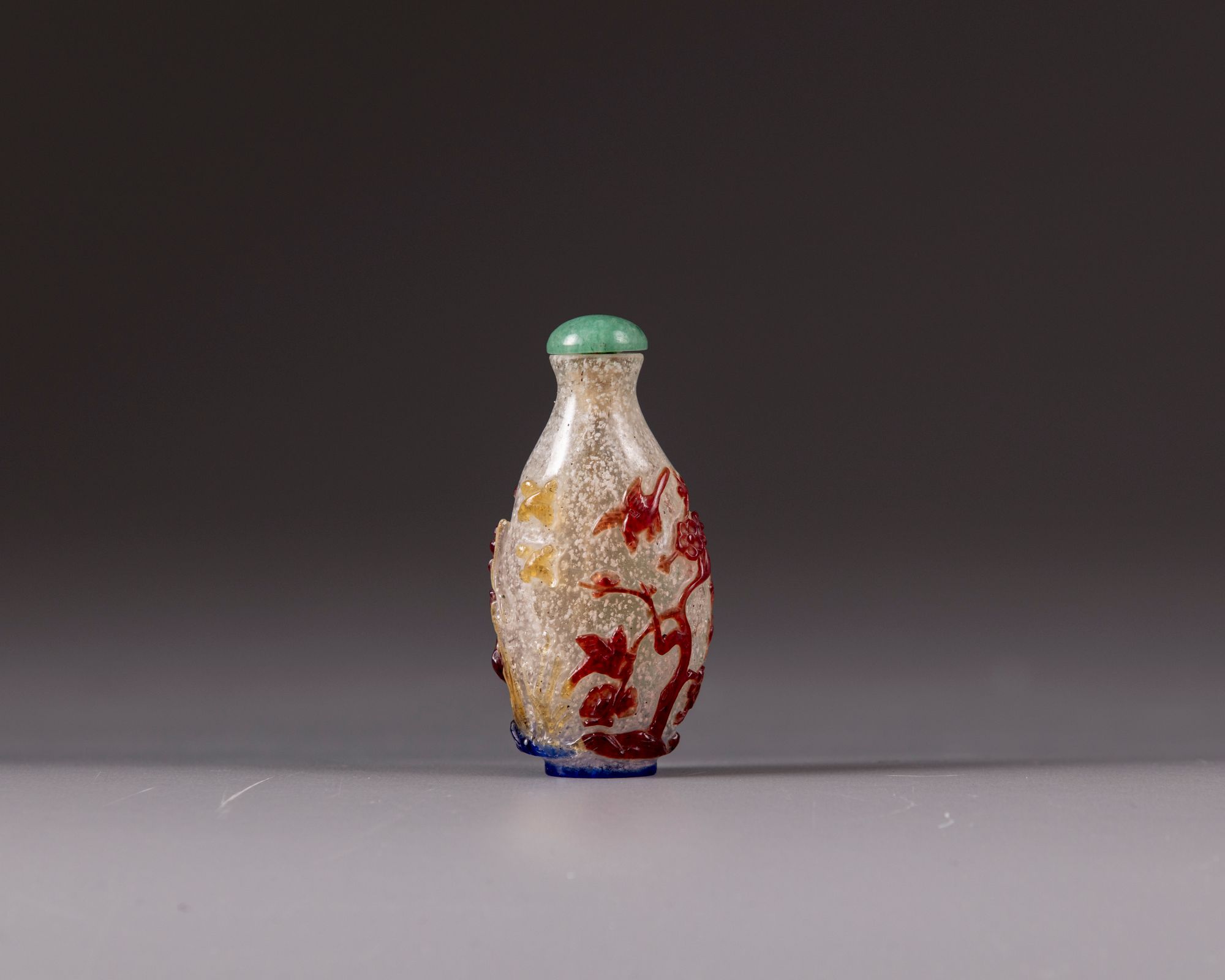 The snuff bottle is carved through the overlay to the 'snowstorm' bubble-suffused, clear ground with a continuous scene of two birds on a flowering tree and flowers in yellow, green and brown.