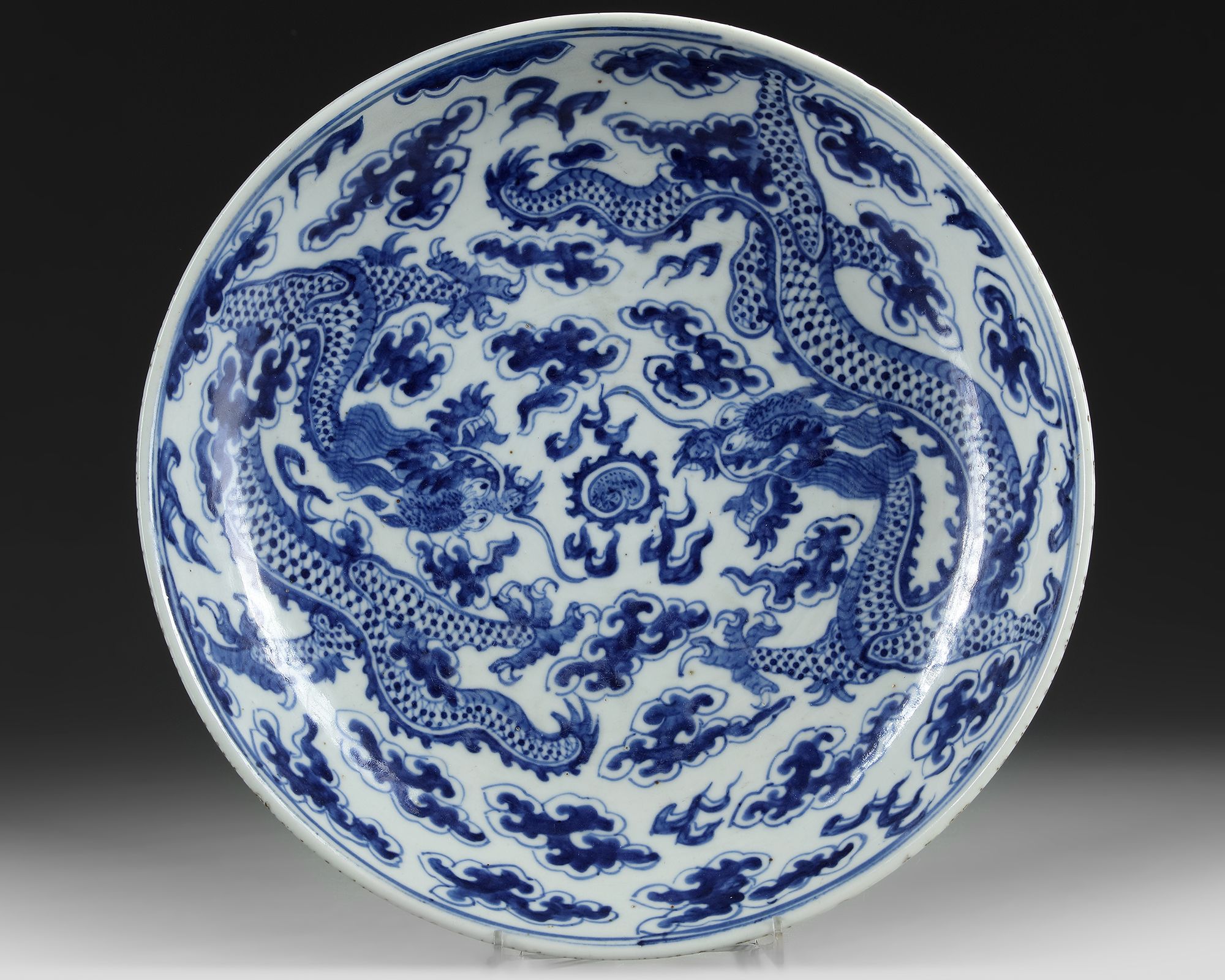 The interior of the dish is decorated with two dragons chasing a flaming pearl amongst clouds within a blue double ring. The outside decorated with clouds and bats. The base unmarked.