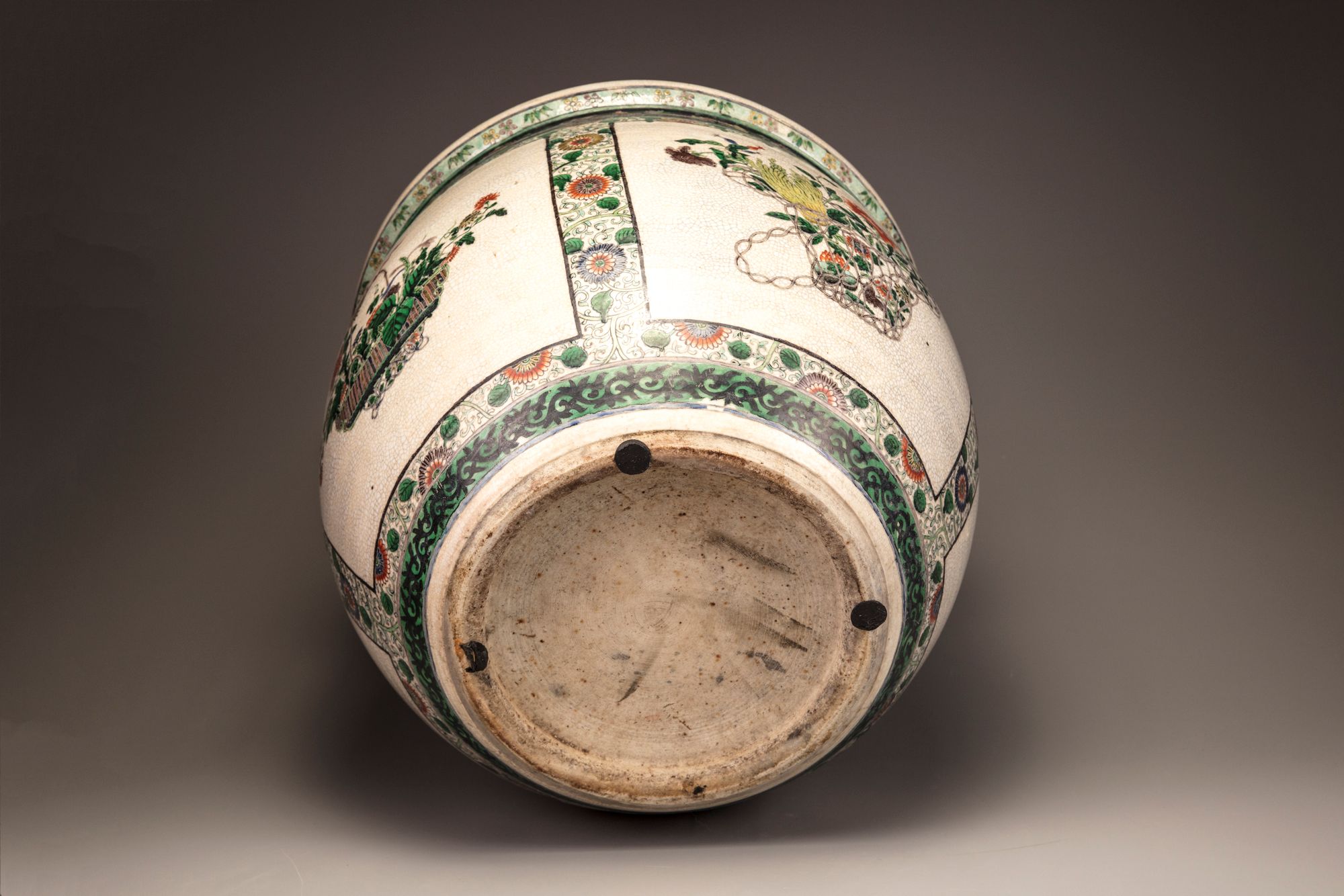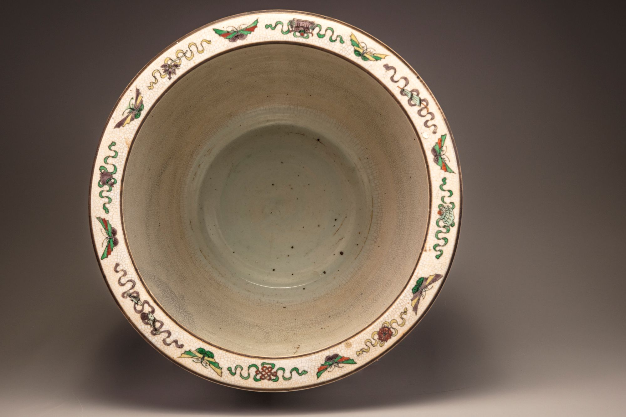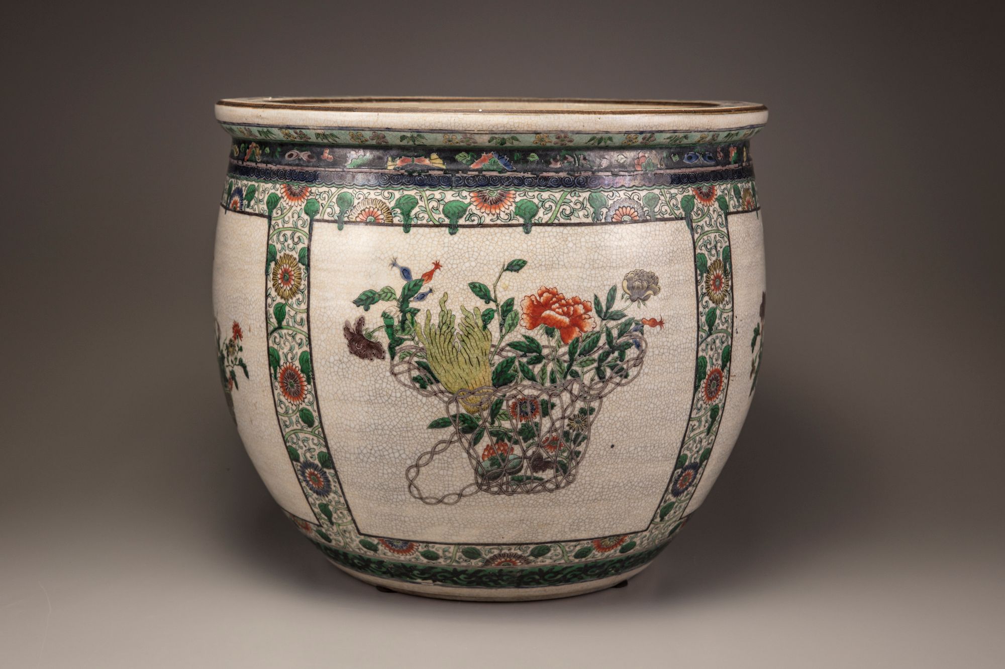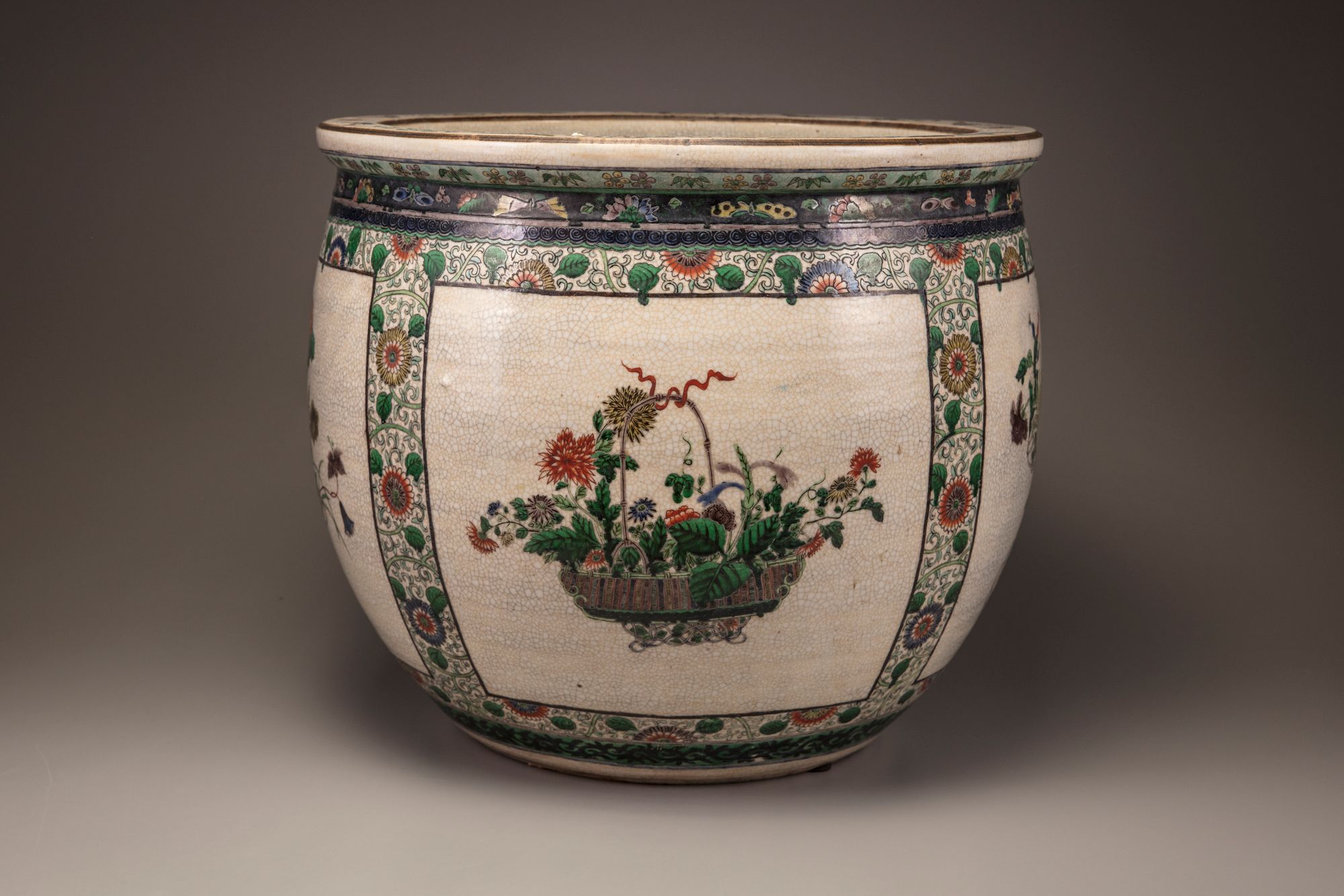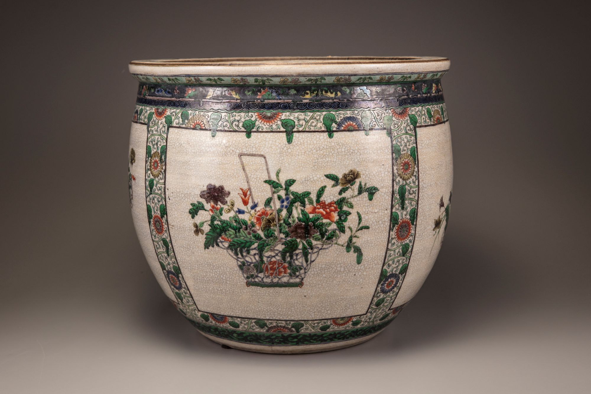 Decorated with various coloured enamels, showing four panels with flower baskets separated by floral borders, all on a crackle glaze ground, the rim decorated with butterflies and buddhist symbols.