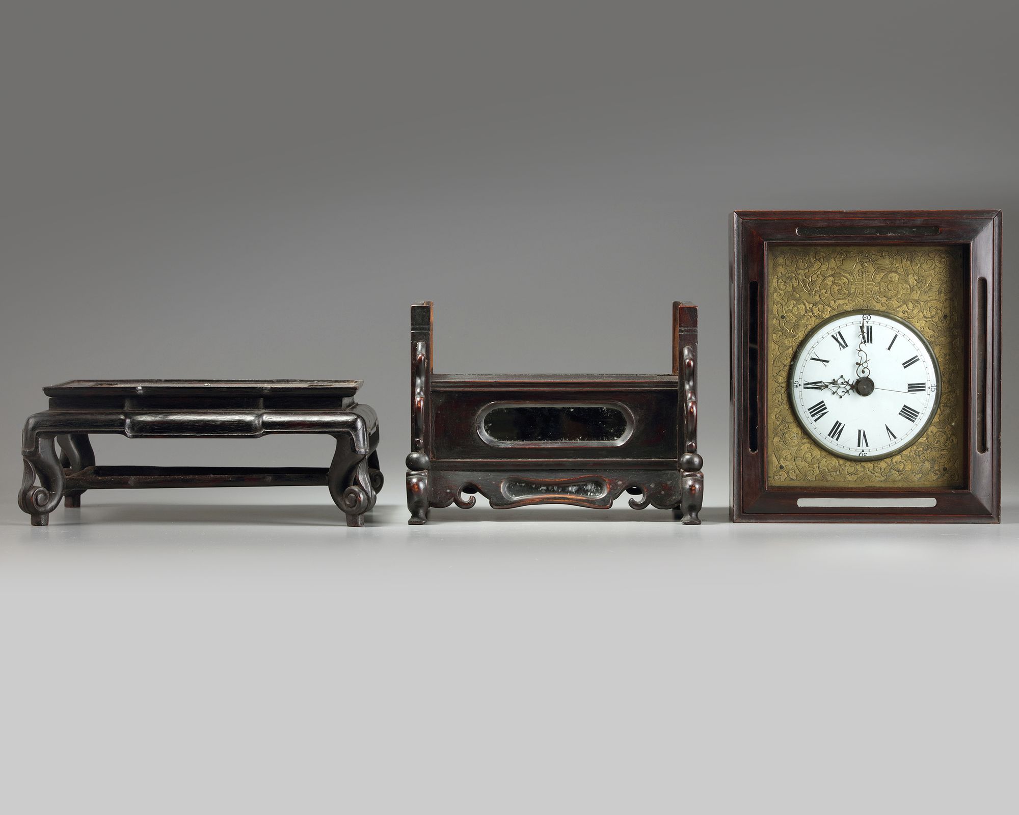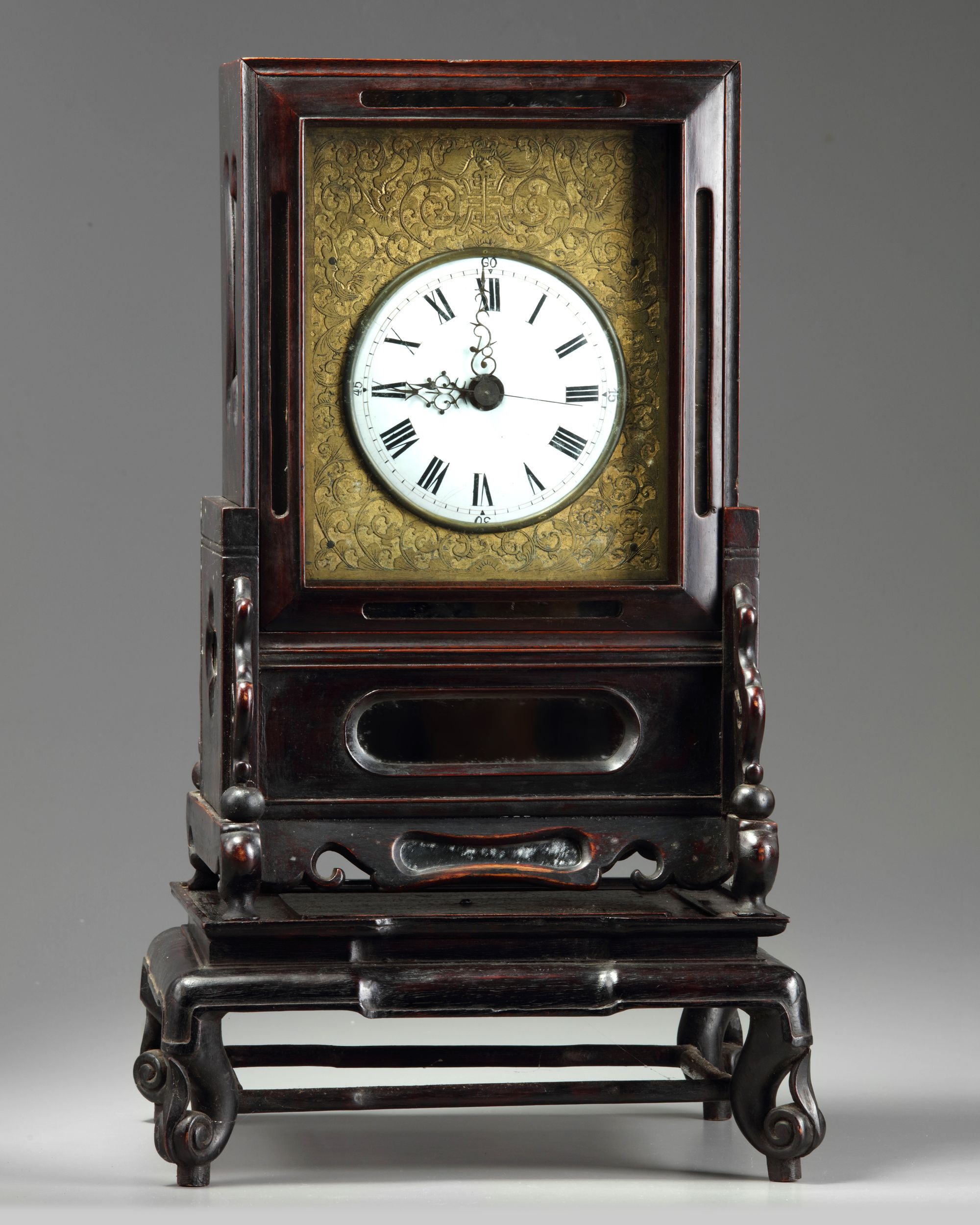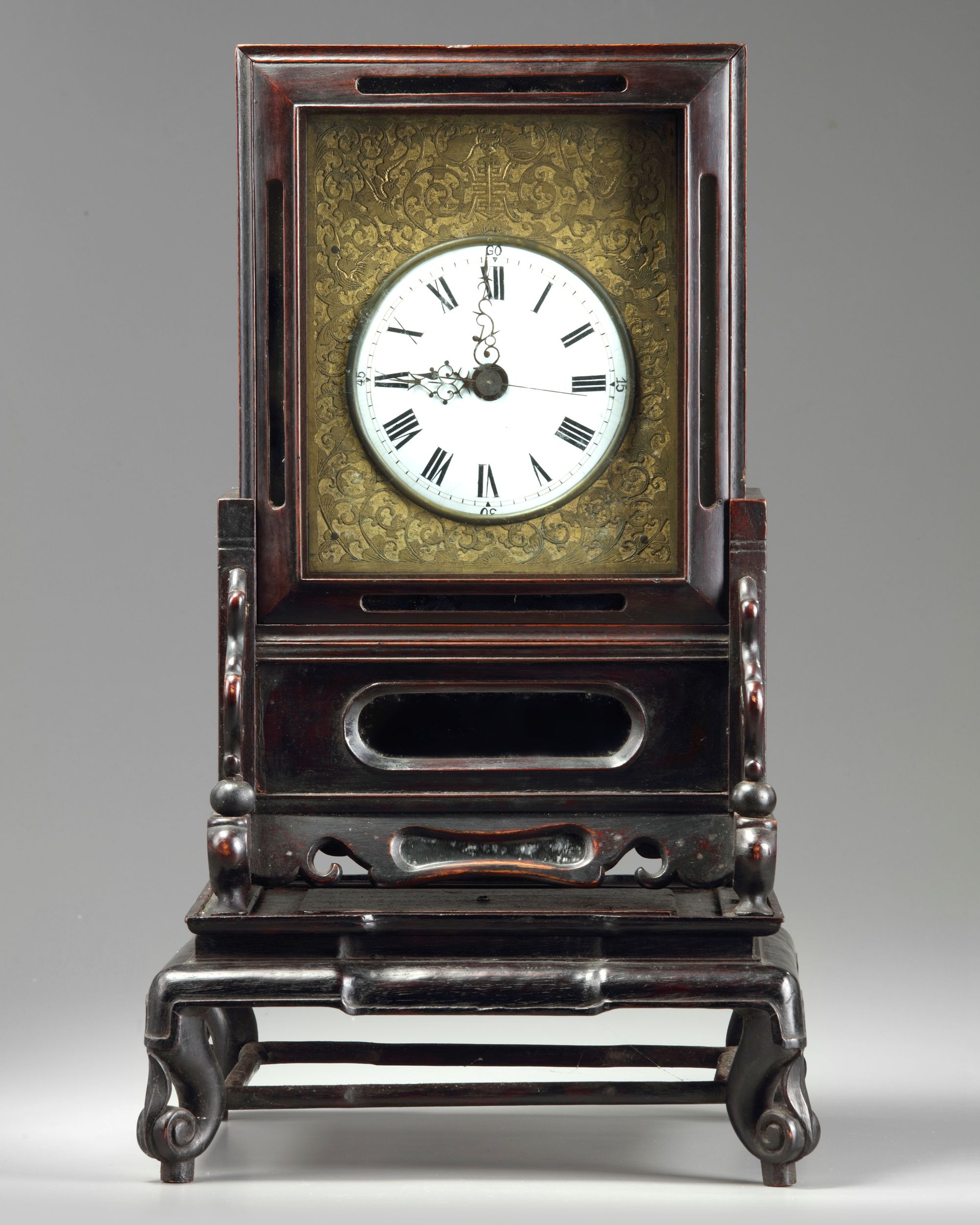 The painted enamel clock dial with a Arabic quarters and Roman numerals, pierced hand and sweep centre seconds. The clock face is surrounded by a gilt bronze front plate decorated in relief with a ‘shou’ character, bats and scrolling leaves. The clock is set in a hongmu box with a sliding front and rear door, and glass-backed openwork decoration to the sides. The clock is set on an openwork sectional stand.