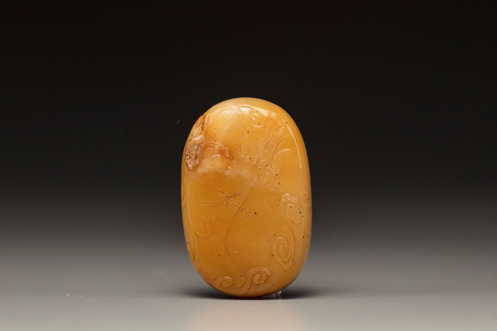 The buckle is of oval form and is carved with a dragon rising from waves and spewing scrolled clouds. The stone is of a caramel tone with russet and speckled inclusions.