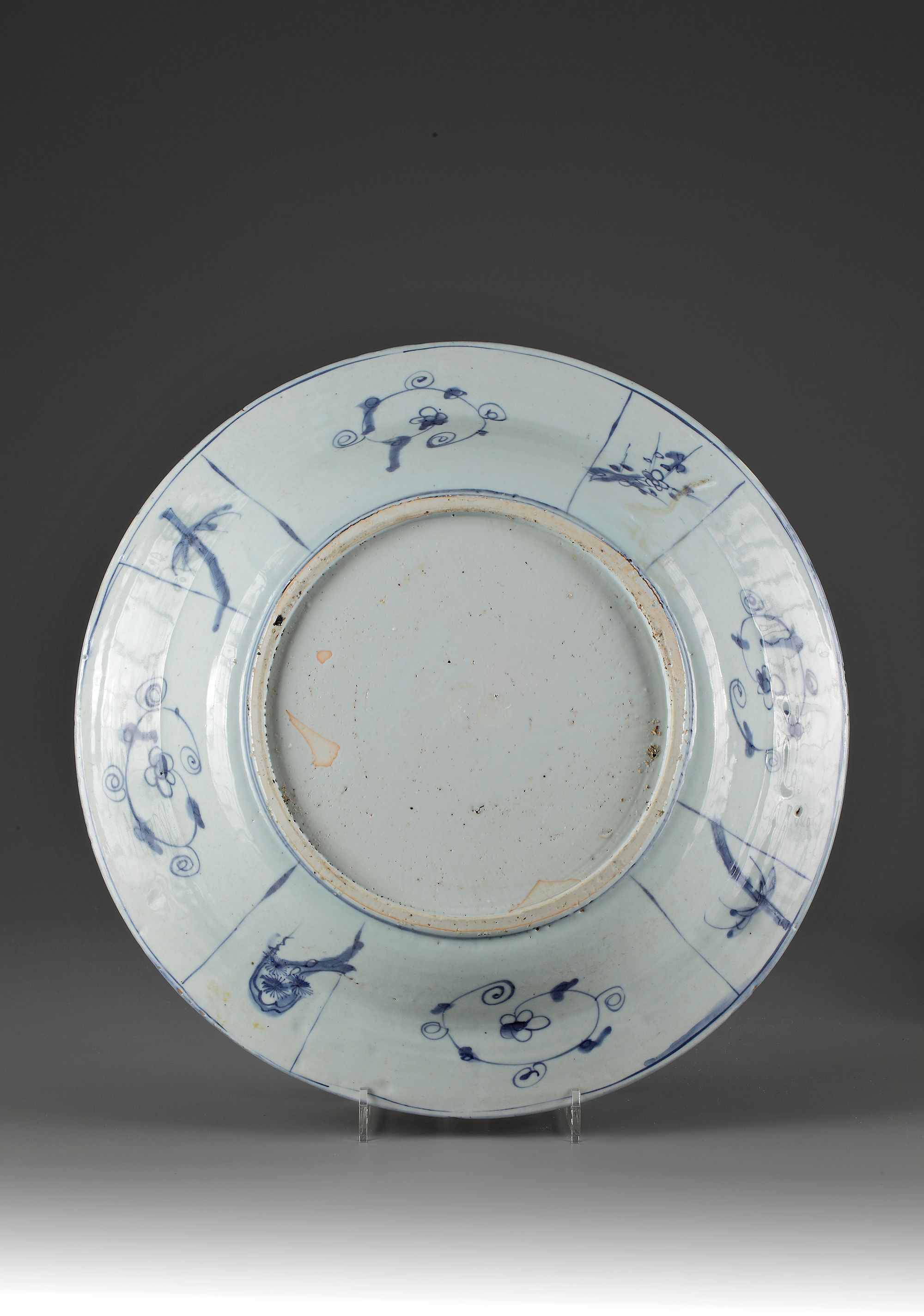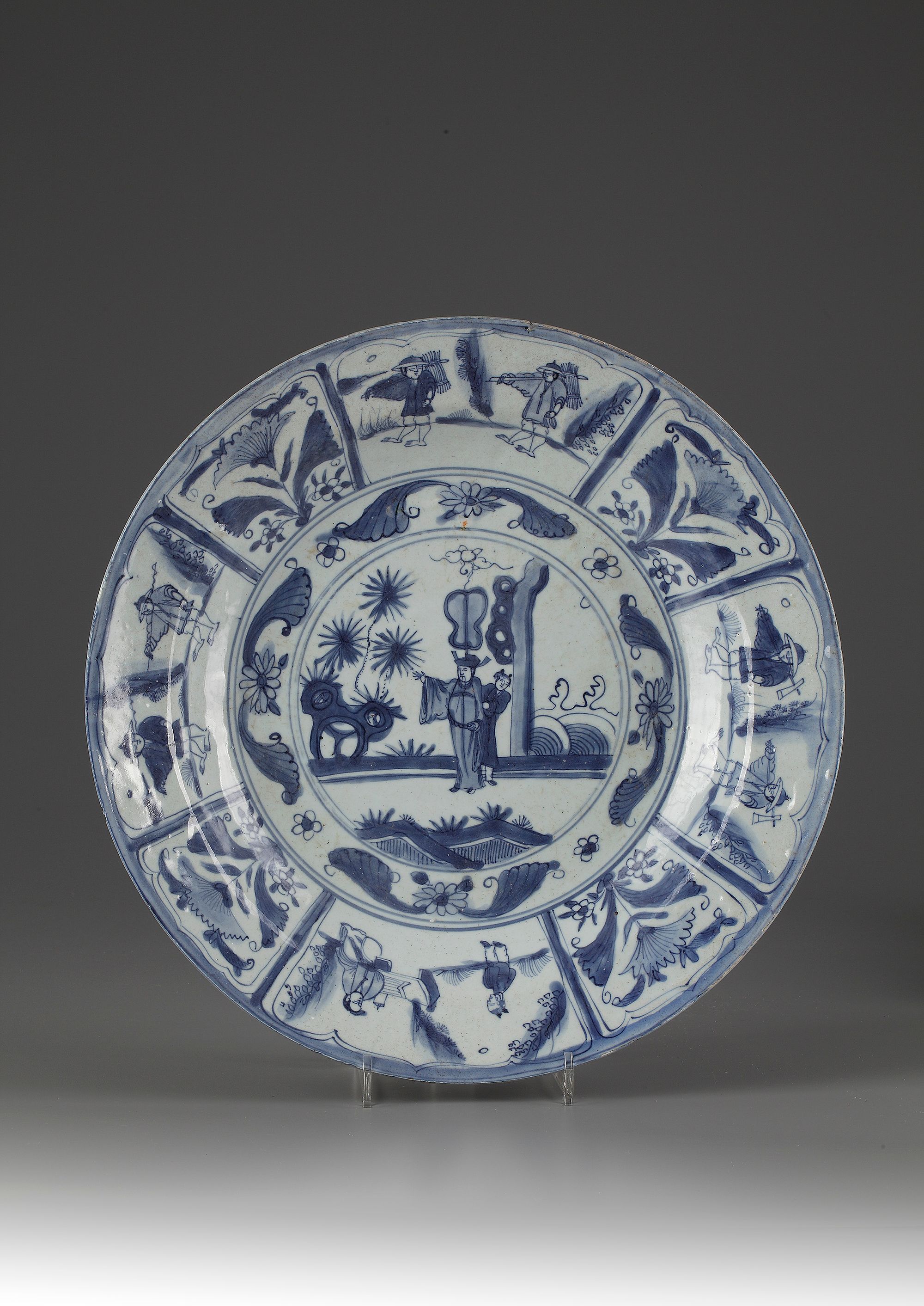 The dish is decorated with a central medallion enclosing a dignitary with an attendant in a garden, surrounded by a floral border. The rim is decorated with eight panels, four with various figural landscape scenes and four with flowers.