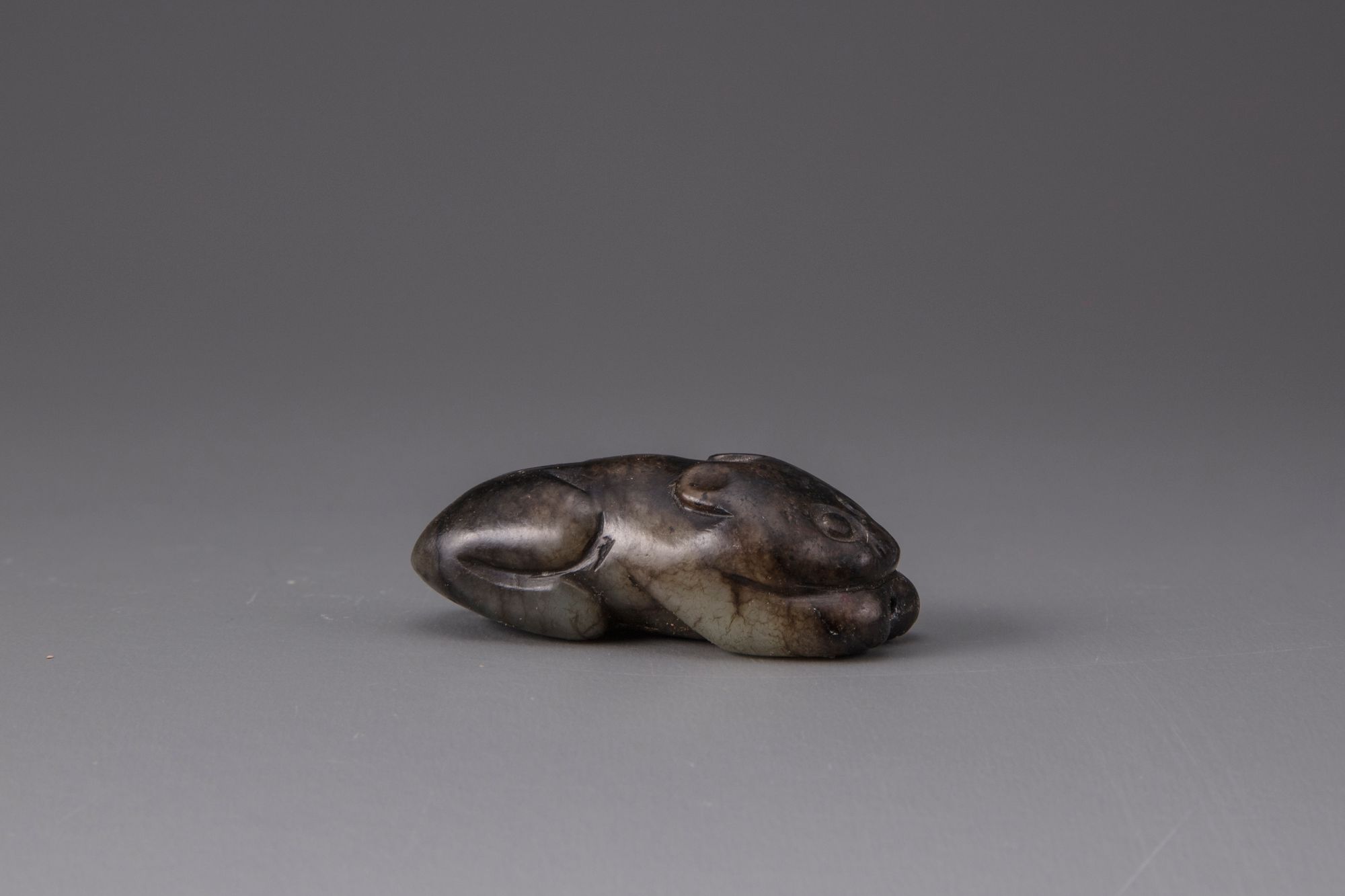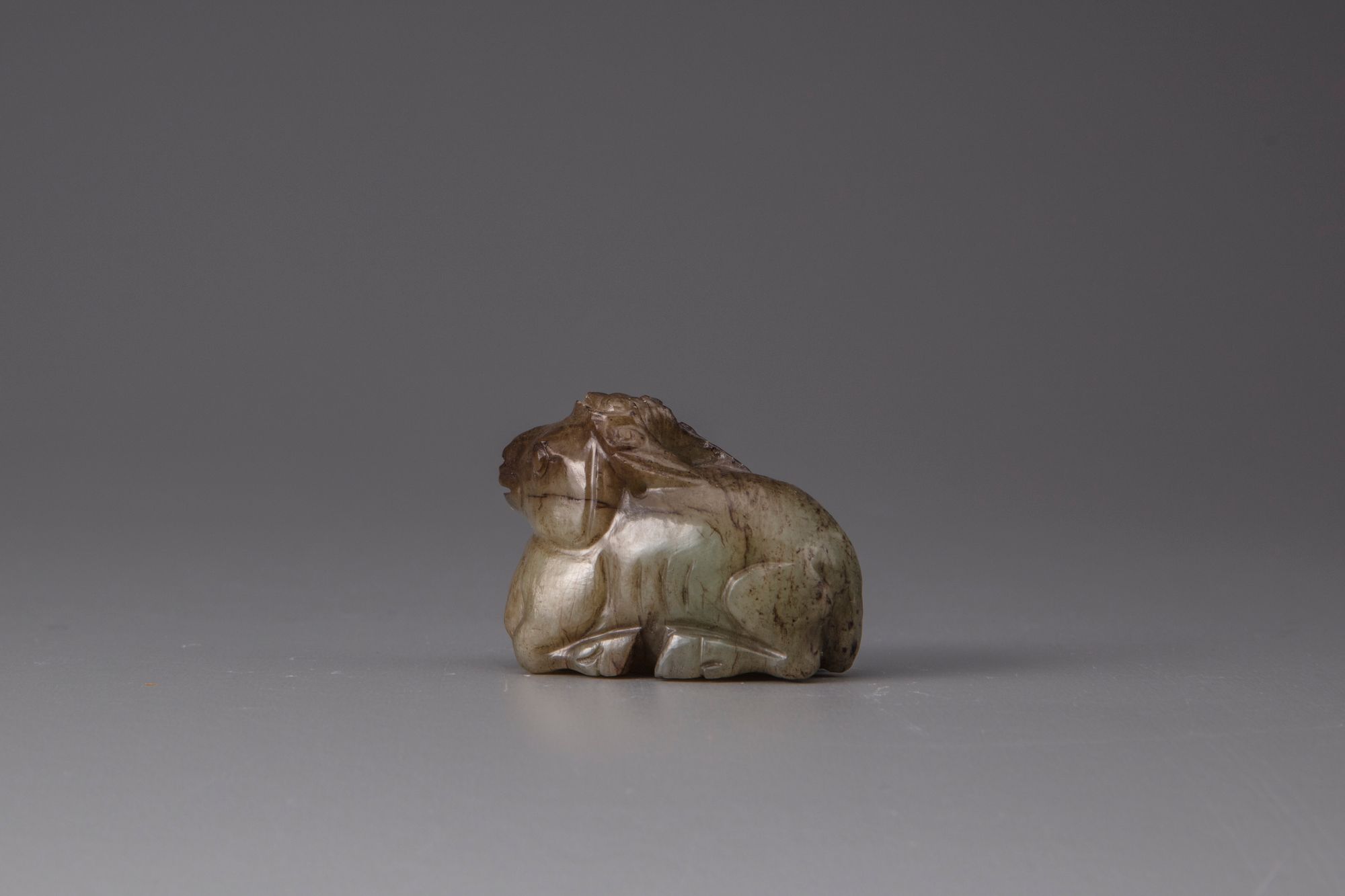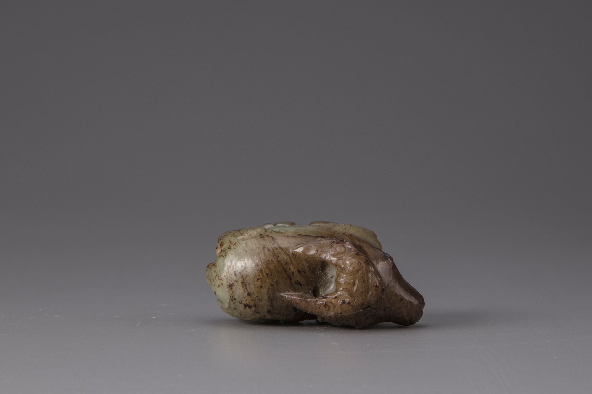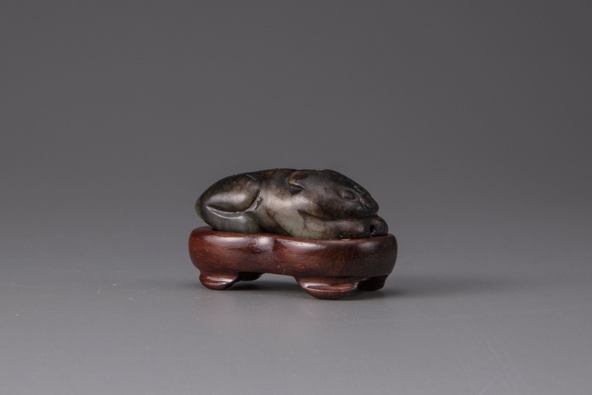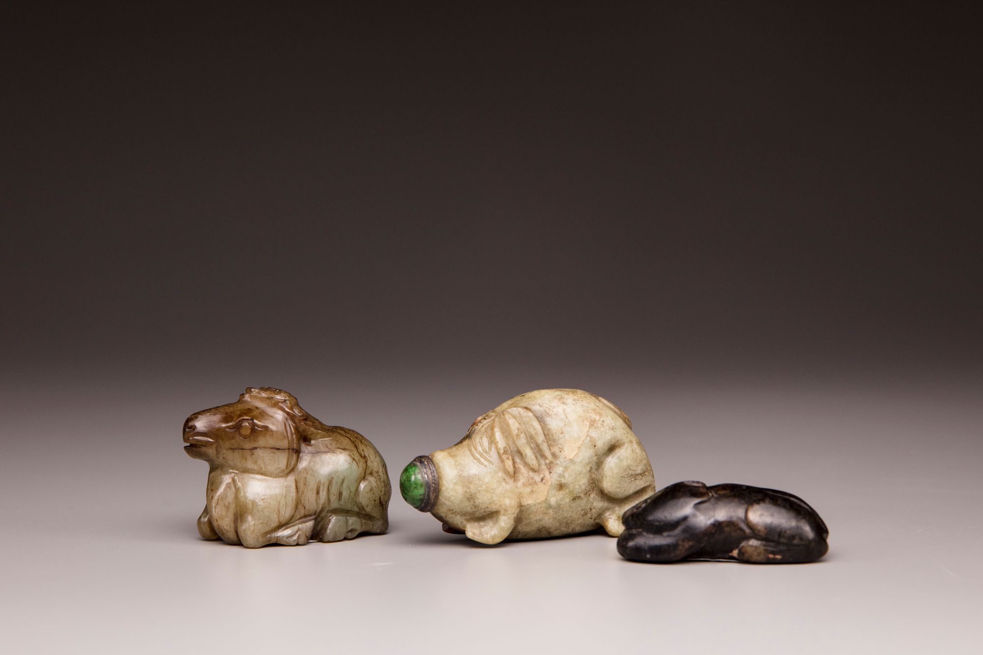 The group comprises a celadon and dark jade cat, carved crouched, with a wood stand; a celadon and russet jade water buffalo carved recumbent with its head looking slightly to one side; and a celadon and russet jade flattened snuff bottle carved as a crouching pig.