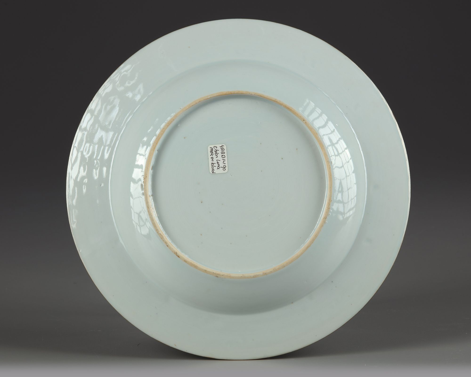 The dish is finely enamelled in gilt, iron-red and black enamel, the centre is finely enamelled with a scroll-form panel enclosing a mountain scene en grisaille surrounded by flower sprays, all encircled by a gilt spearhead border, the flattened rim is decorated with grapes, bamboo, lingzhi, and leaf sprays. 22.8 cm. diam.
