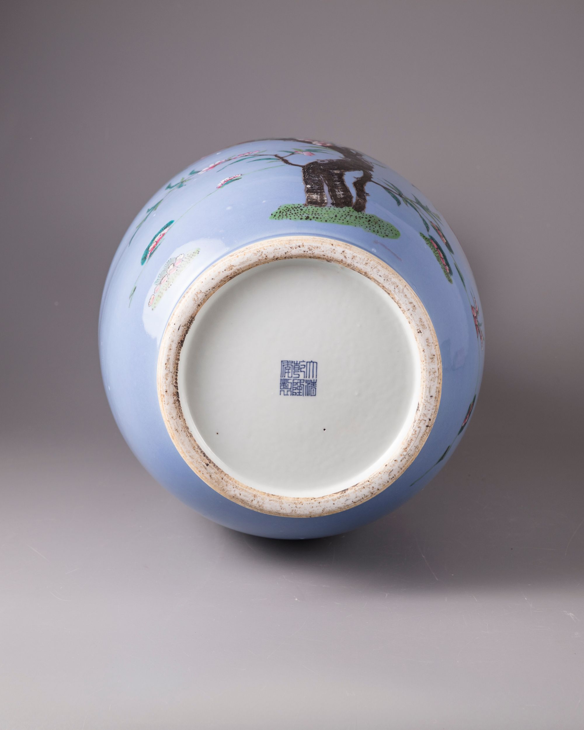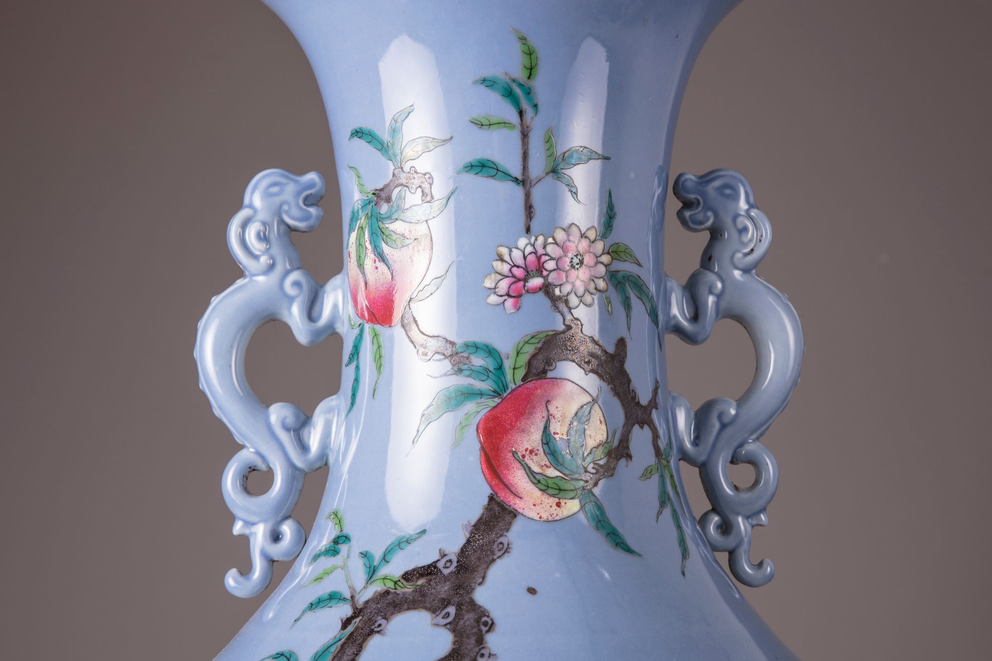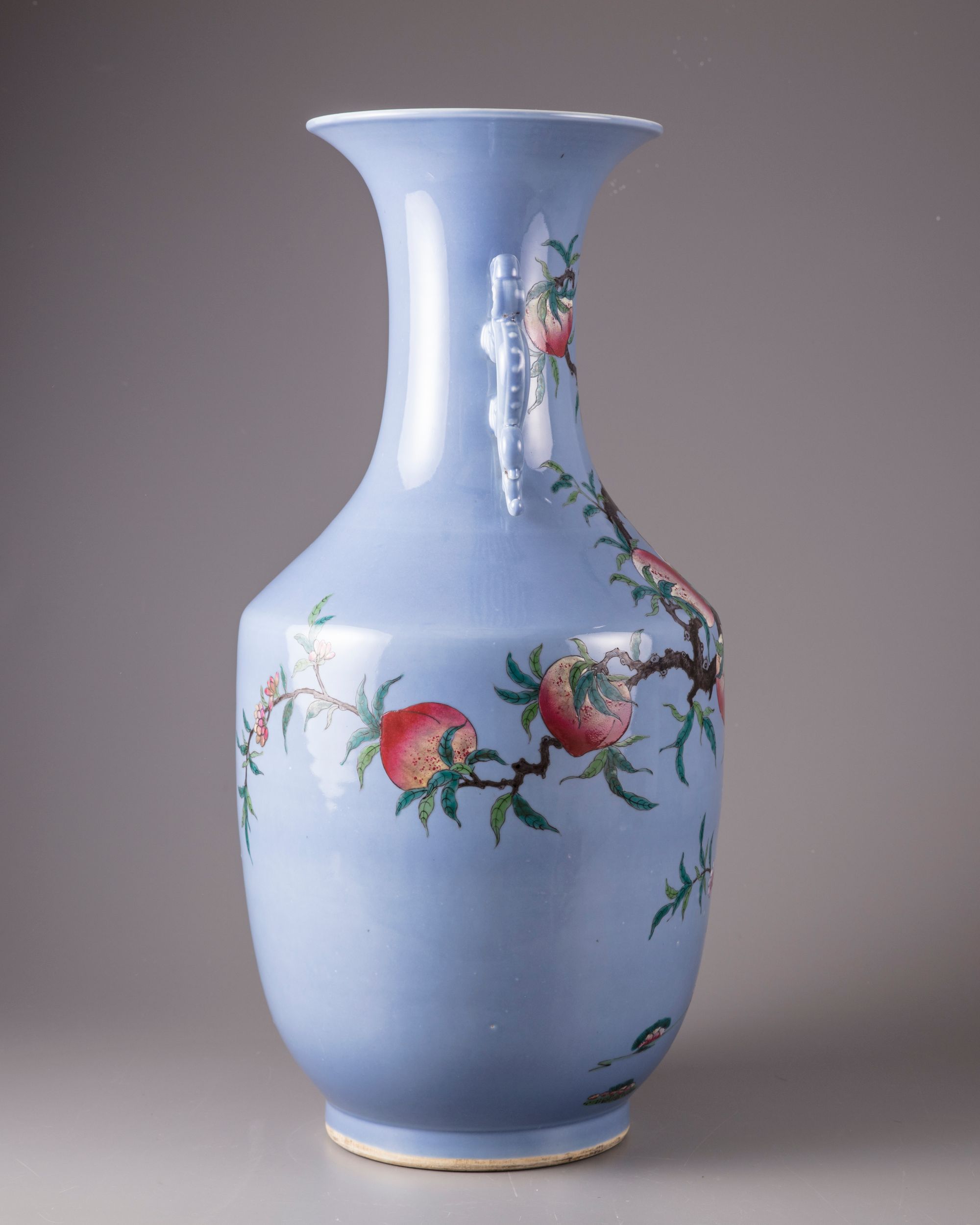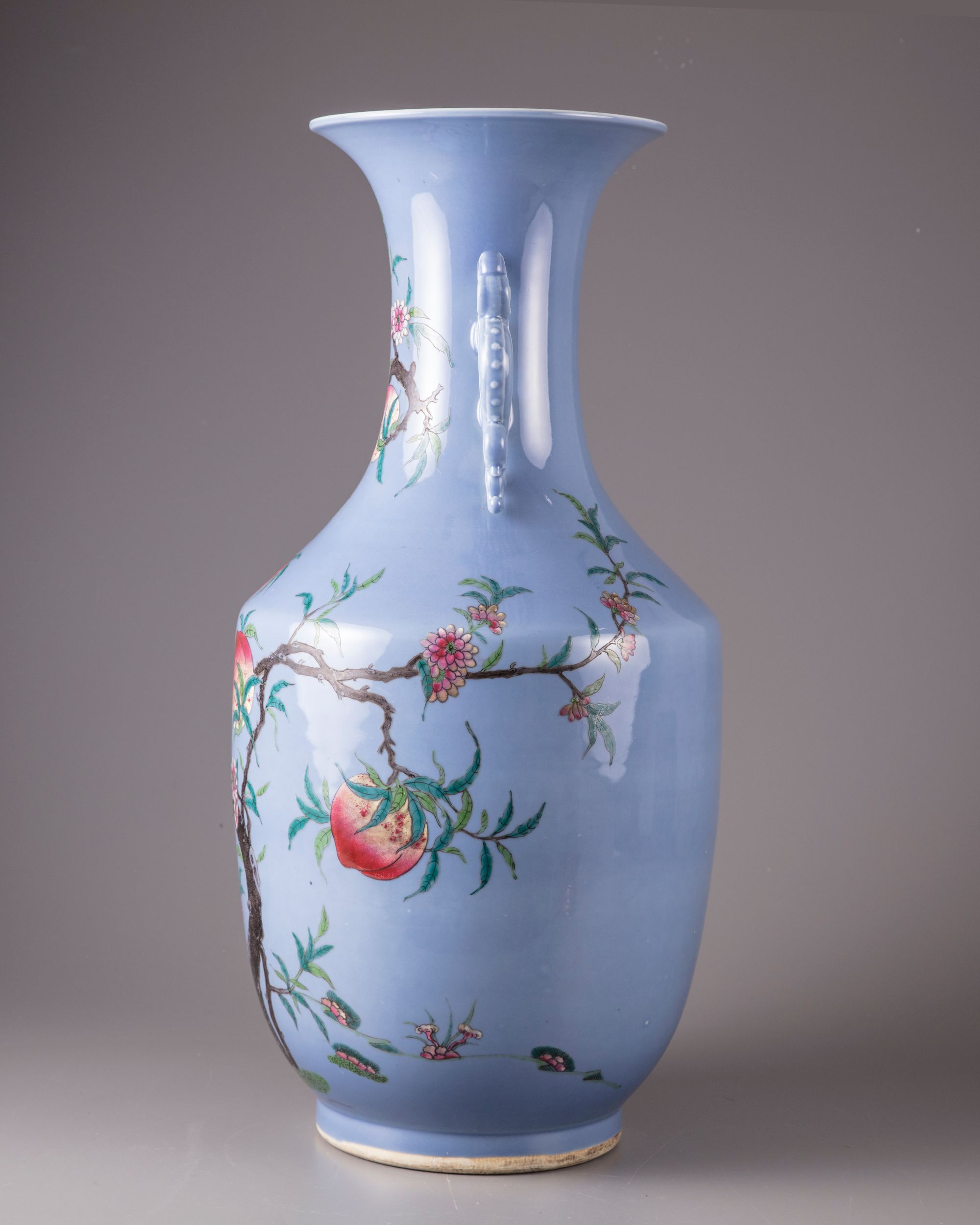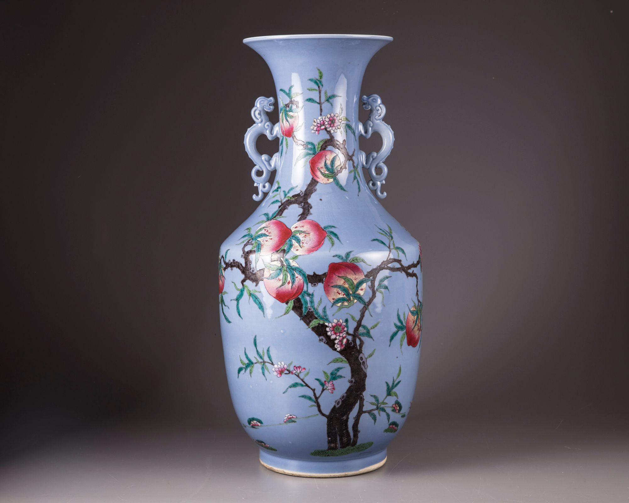 The vase is decorated with two openwork kui-dragon handles to the neck, decorated with nine fruiting peach branches on a blue ground. The base with an apocryphal Qianlong seal mark.