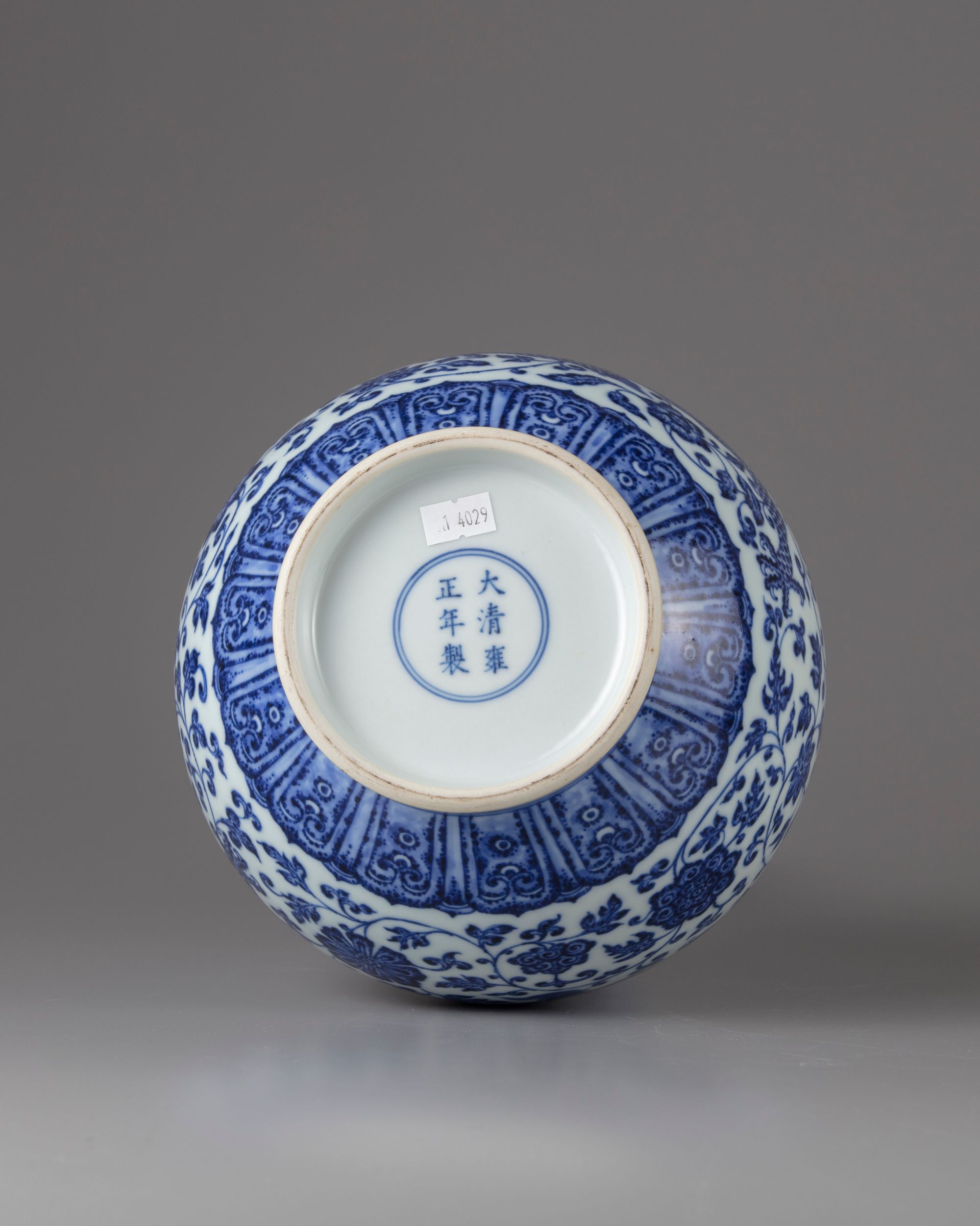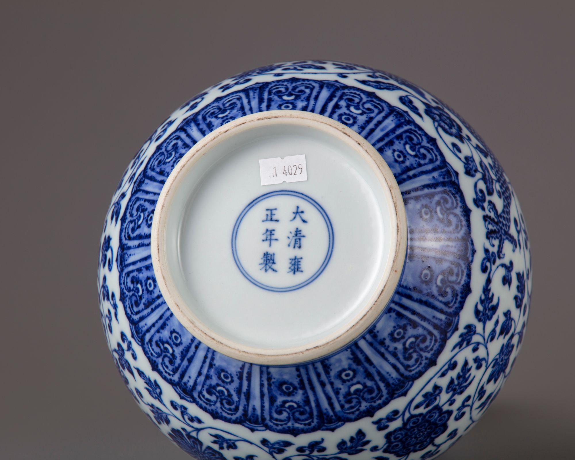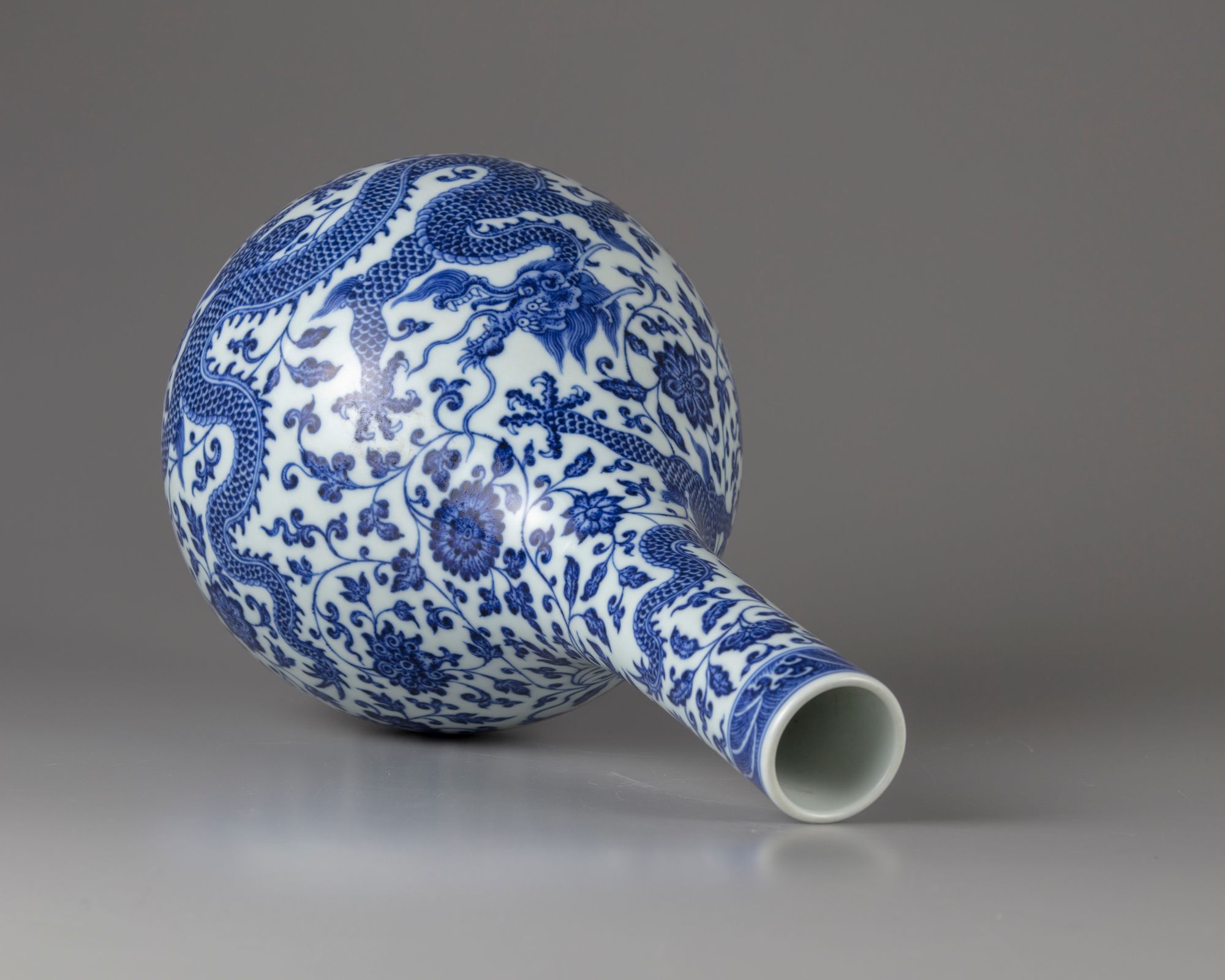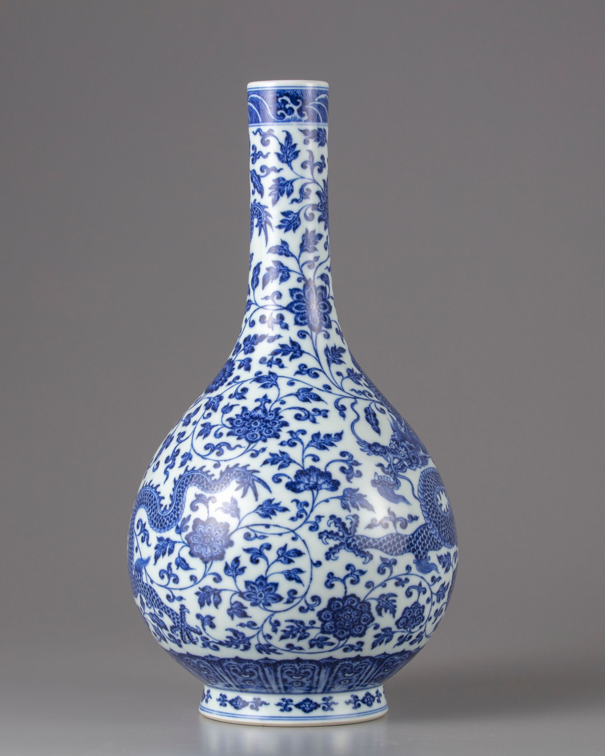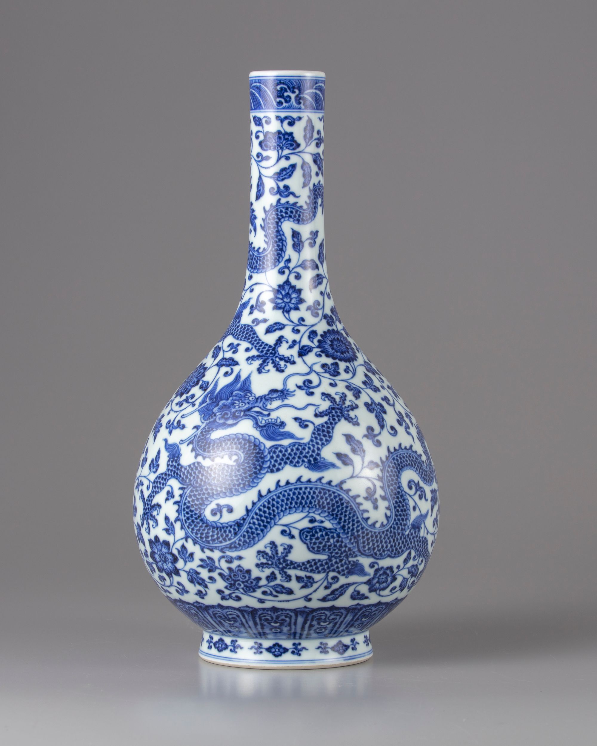 The bottle vase is decorated in cobalt-blue with two five-clawed dragons amongst peony and lotus scrolls, All below a band of waves to the rim and and a lappet border to the base. The The bottom with a Yongzheng Chinese six character mark with a double circle.