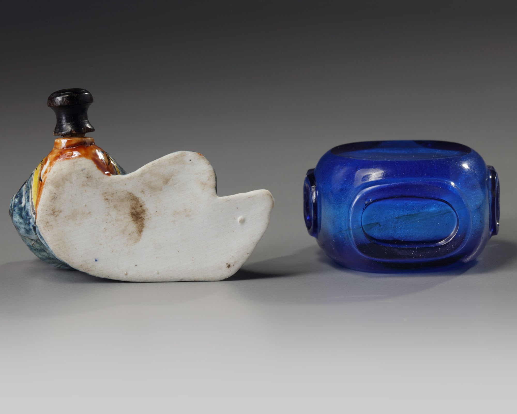 The first is a translucent blue-glass flattened circular snuff bottle decorated with two fixed-ring Buddhist lion head handles to the sides. The second is a porcelain snuff bottle modelled as the drunken poet, Li Bai, reclining on a wine jar.