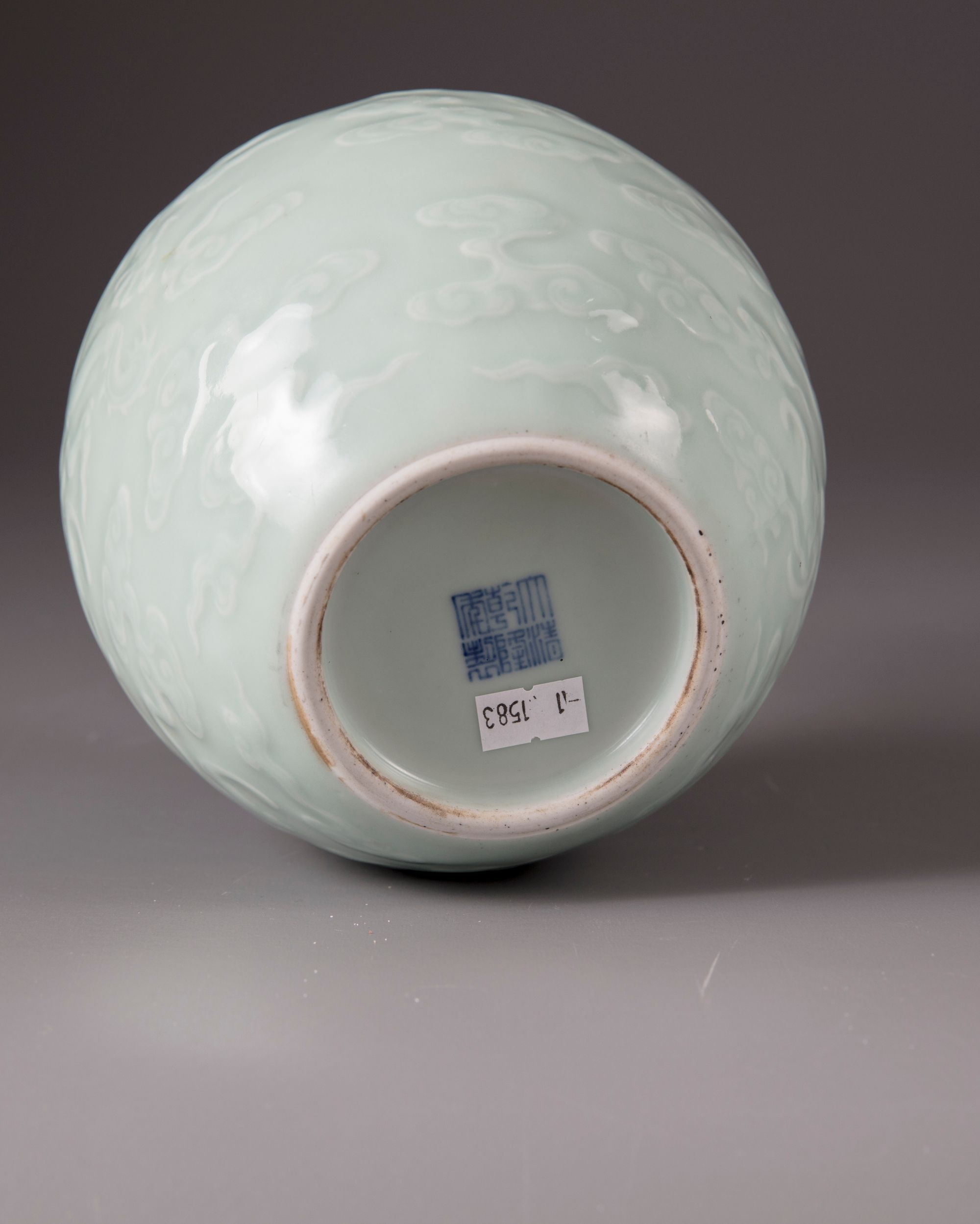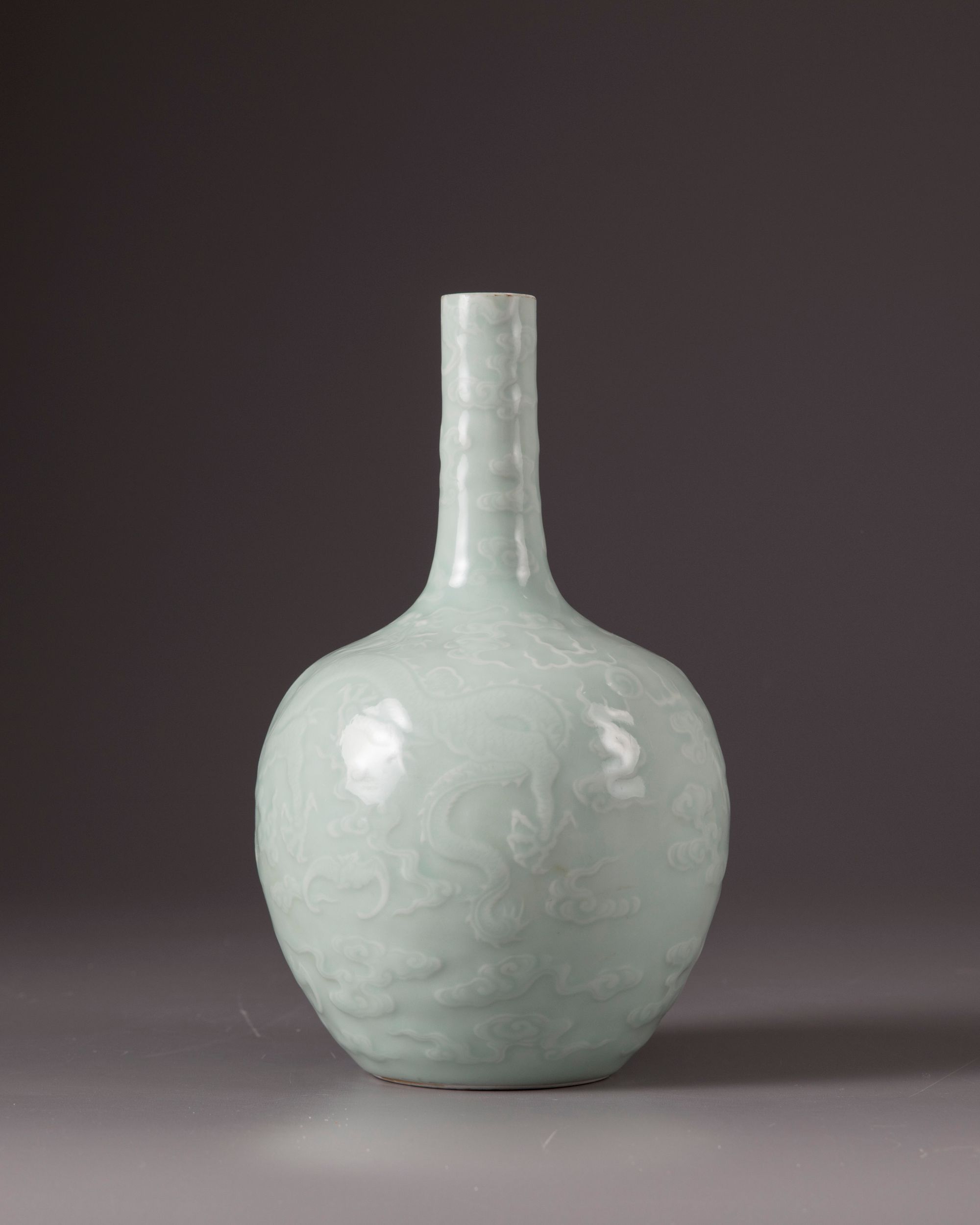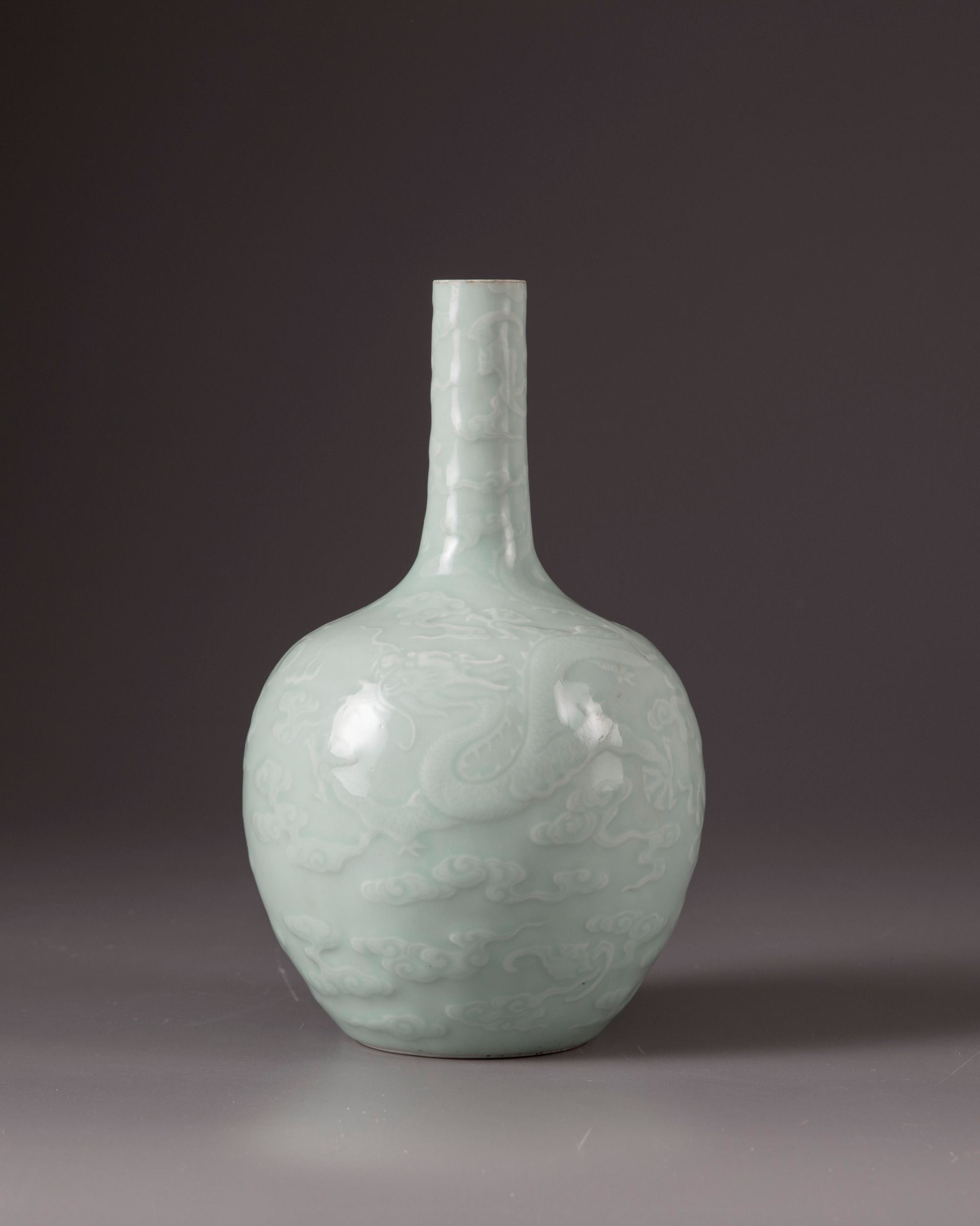 The celadon glazed vase is decorated with two dragons chasing a flaming pearl amongst bats and clouds. The base marked with a Qianlong seal mark.