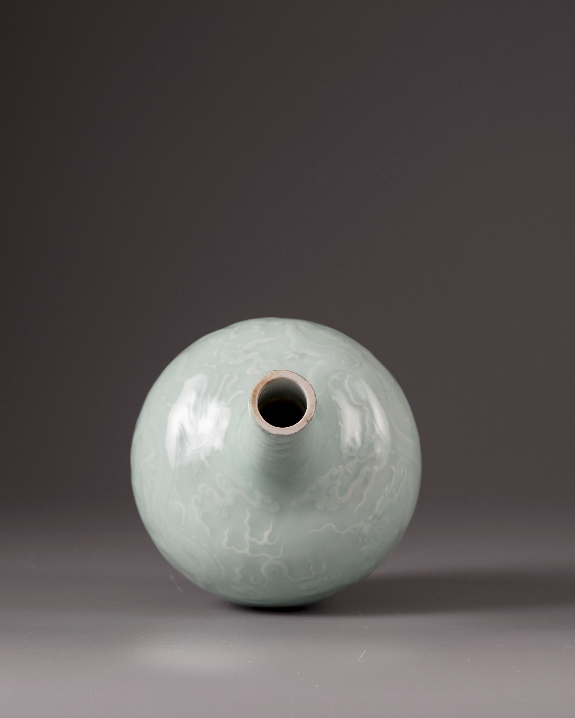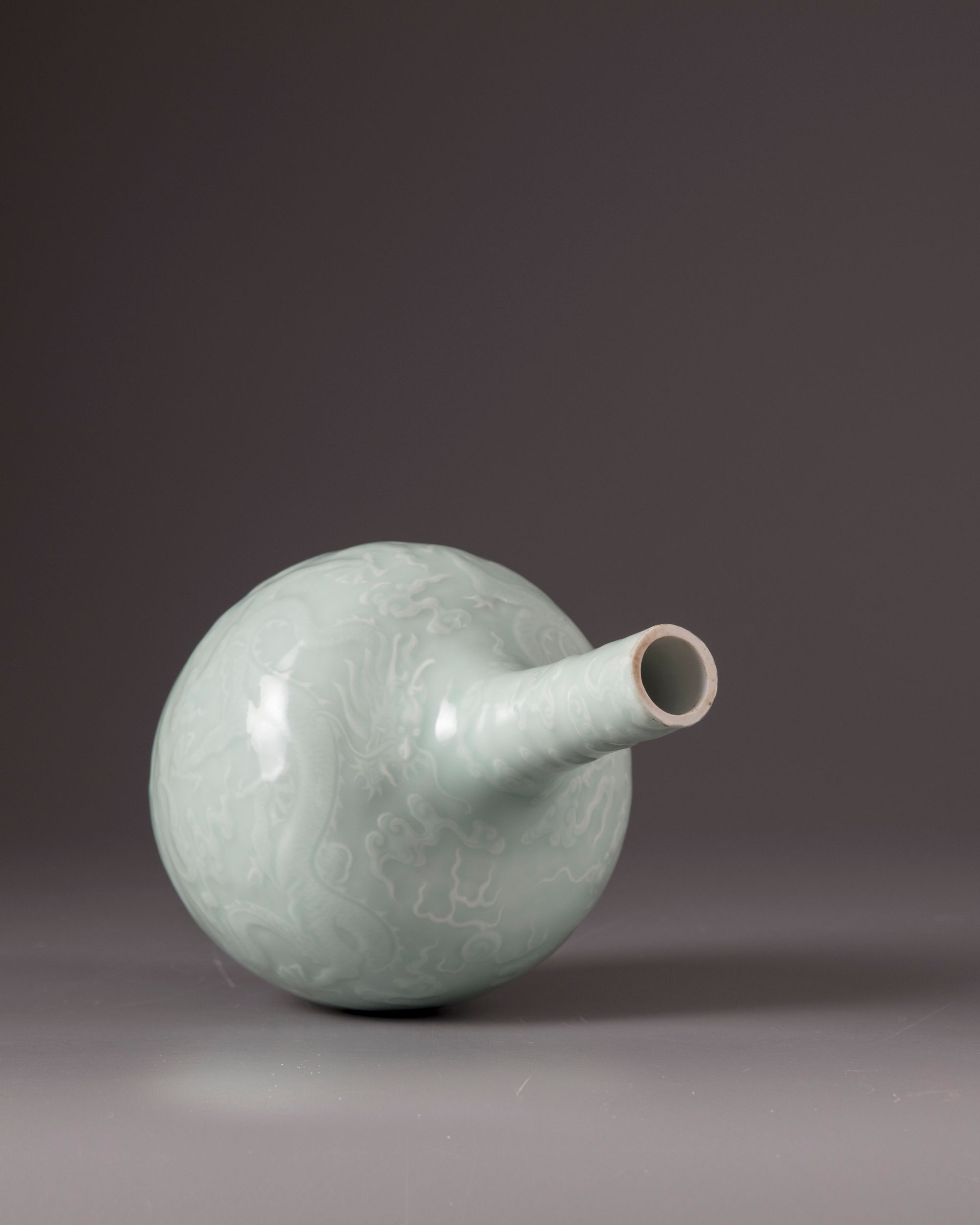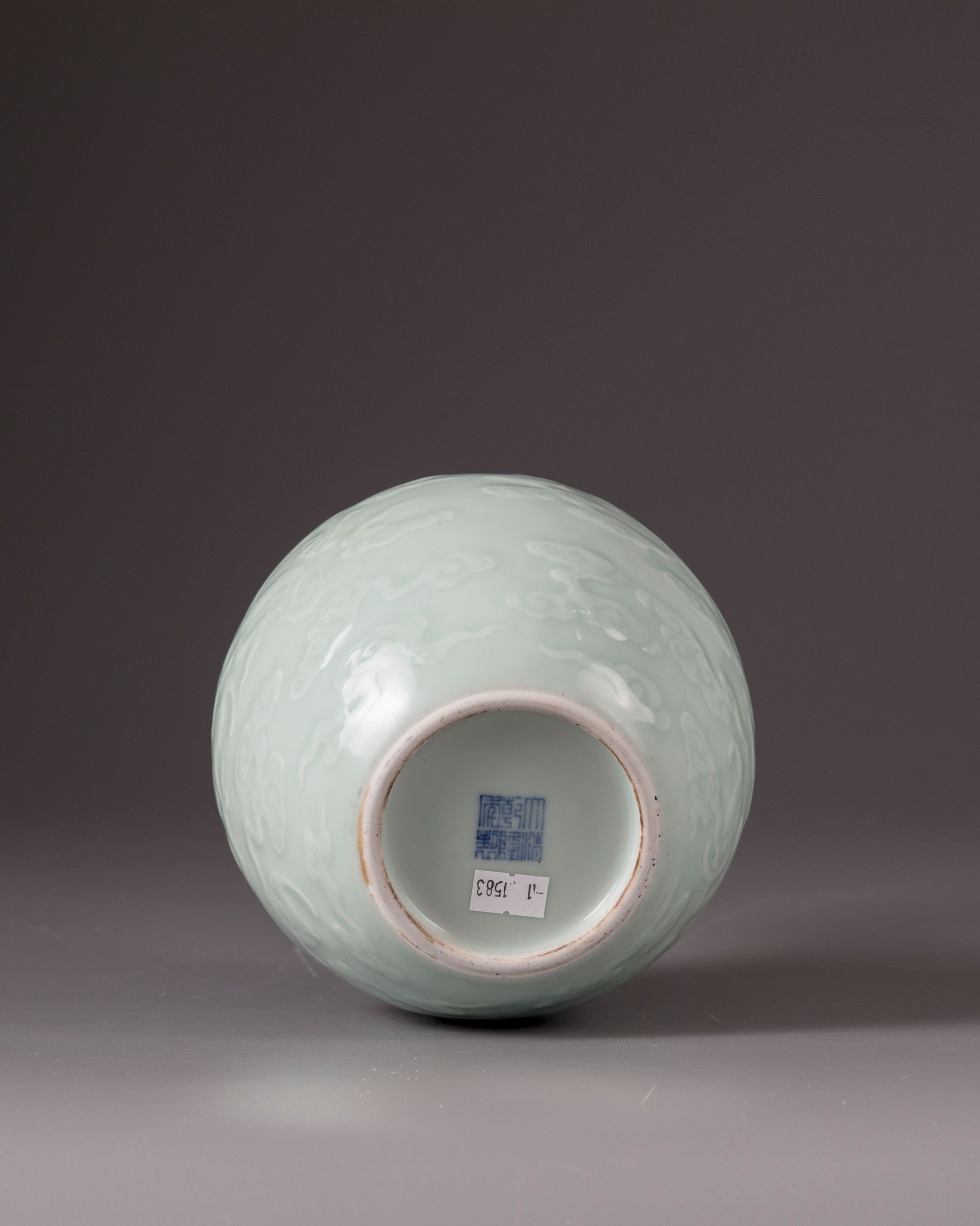 The celadon glazed vase is decorated with two dragons chasing a flaming pearl amongst bats and clouds. The base marked with a Qianlong seal mark.