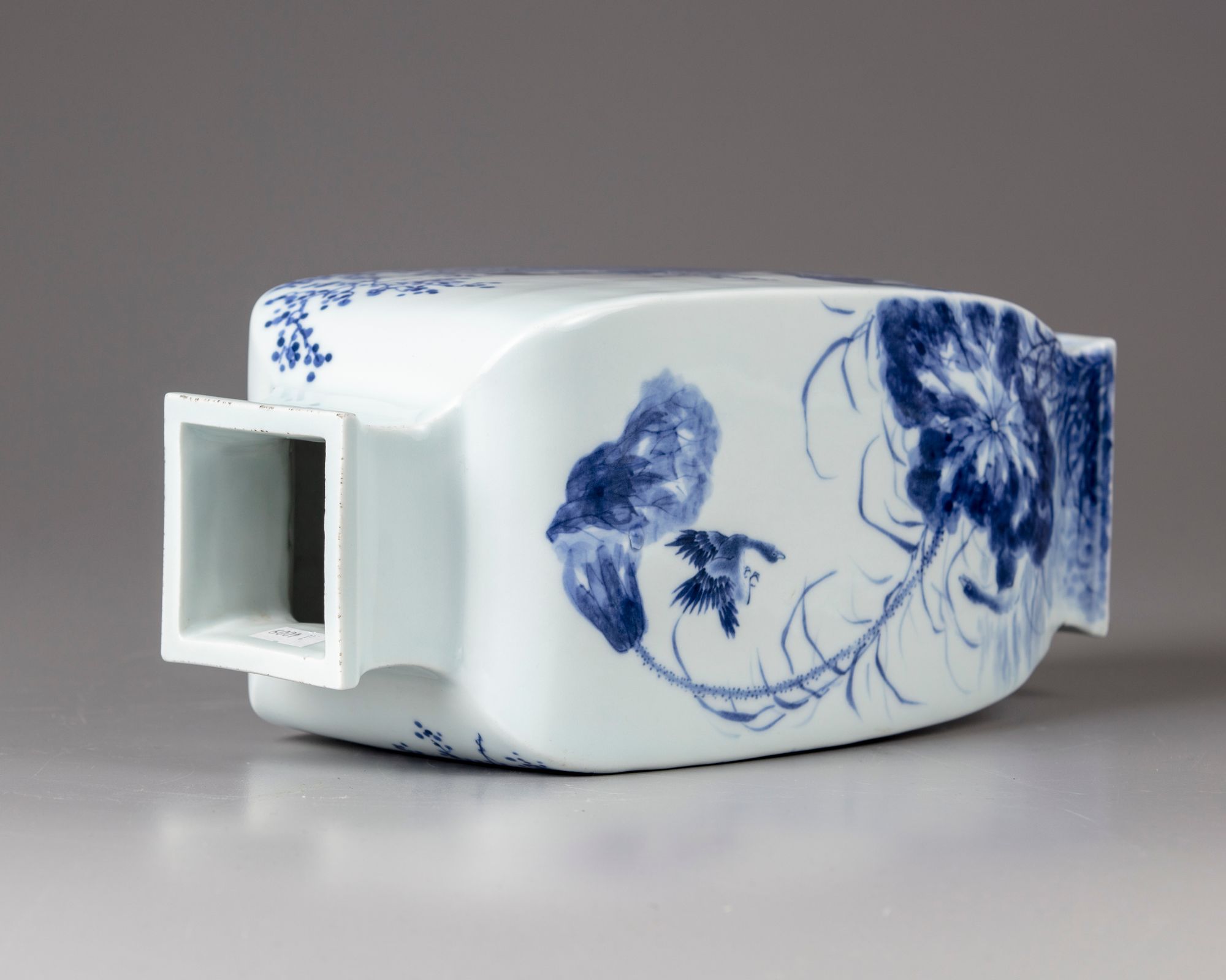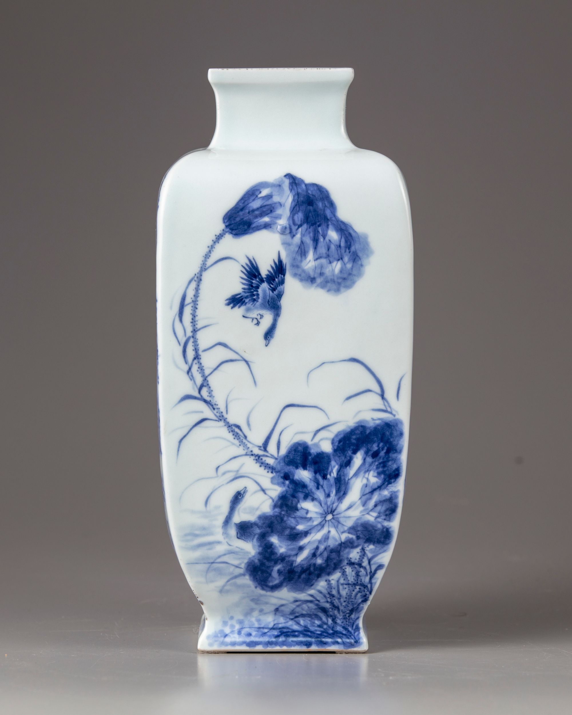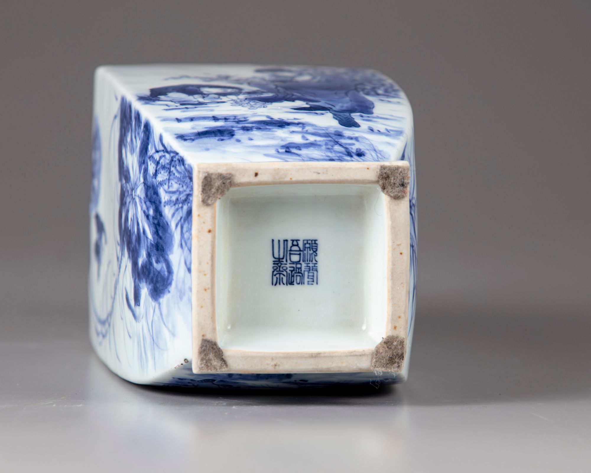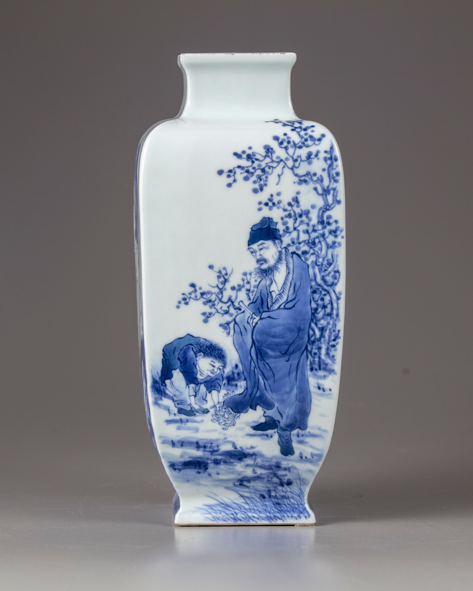 The square -sectioned vase is decorated to both sides fishermen and with a boy beside a large pine tree.
