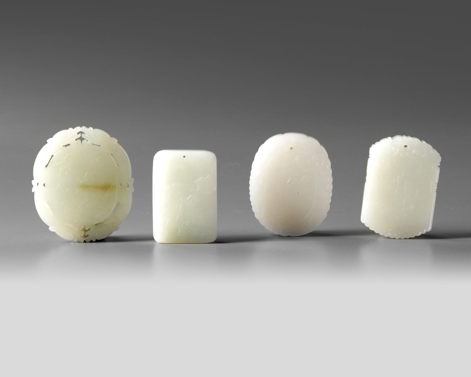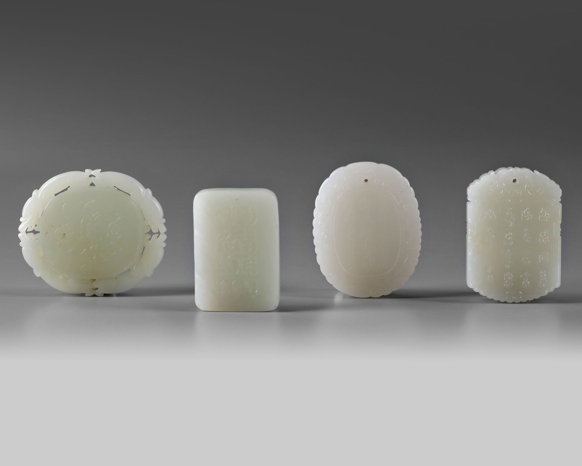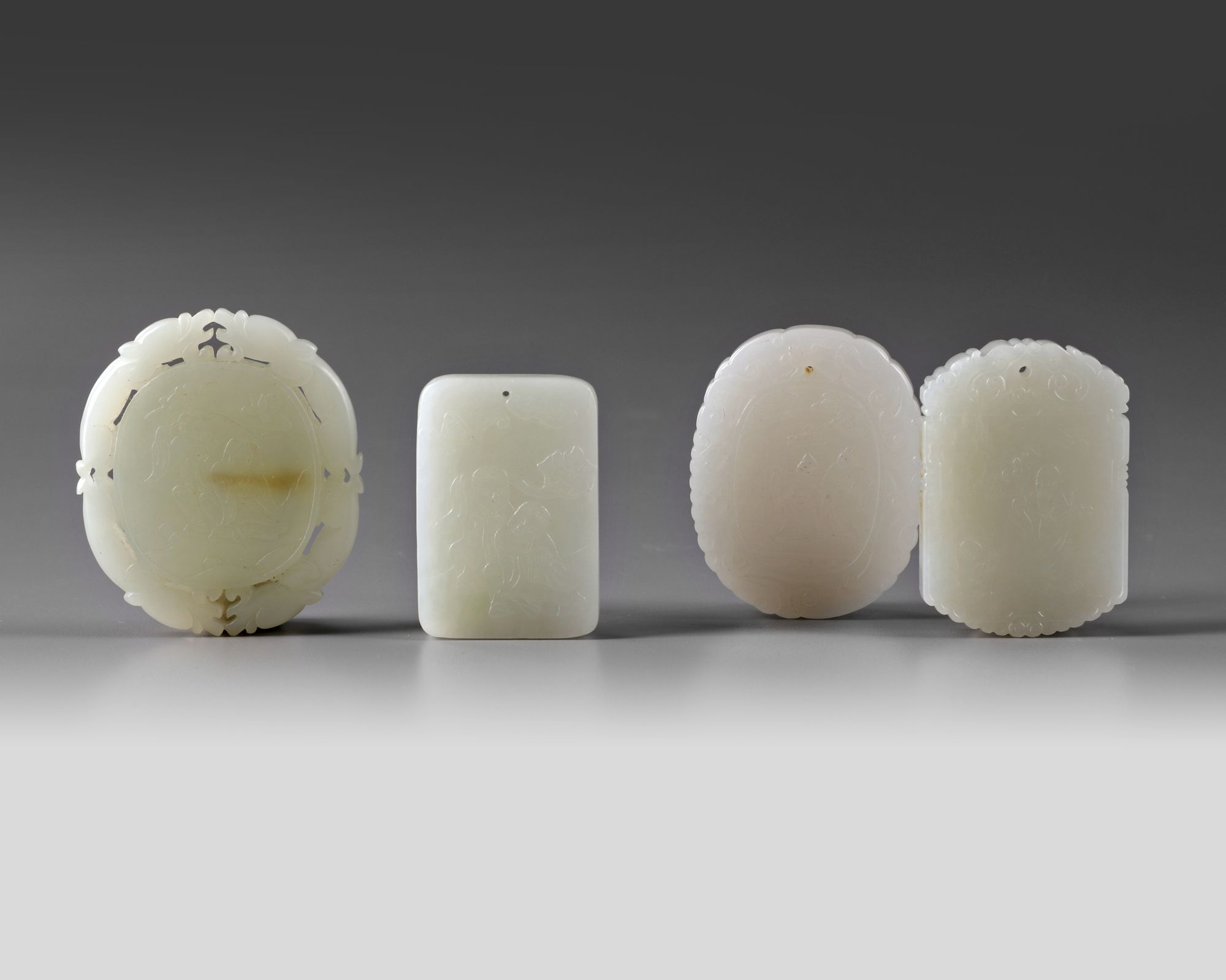 The group comprises: a plaque with the Hehe Erxian, a circular plaque with the Hehe Erxian, , and to the other with two bats and a peach, all surrounded by a patterned pierced border of confronting qilin; a plaque with two scholars; and a rounded rectangular plaque with Shoulao.