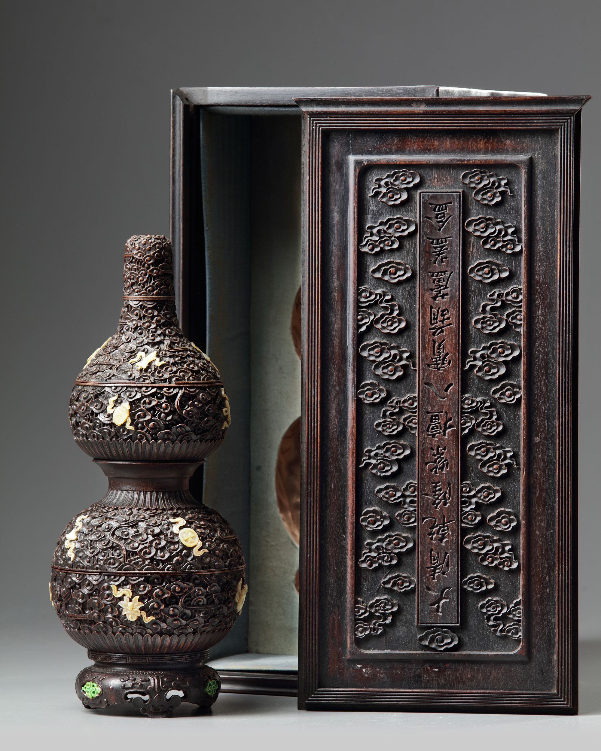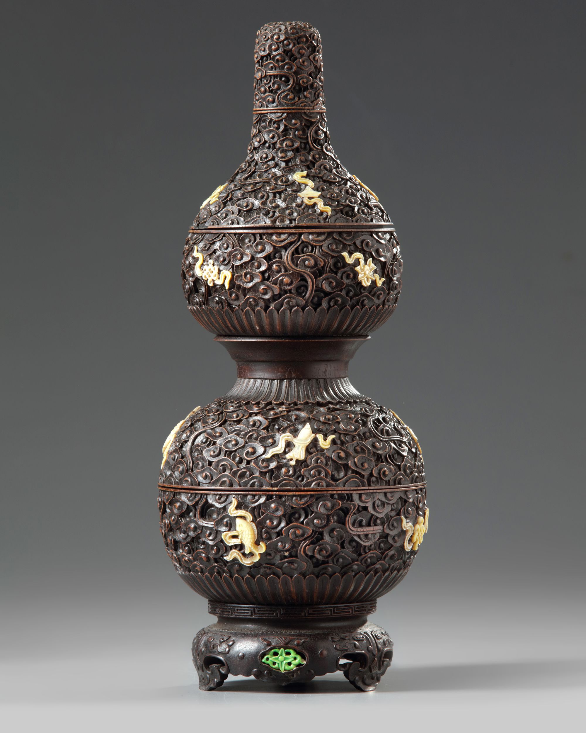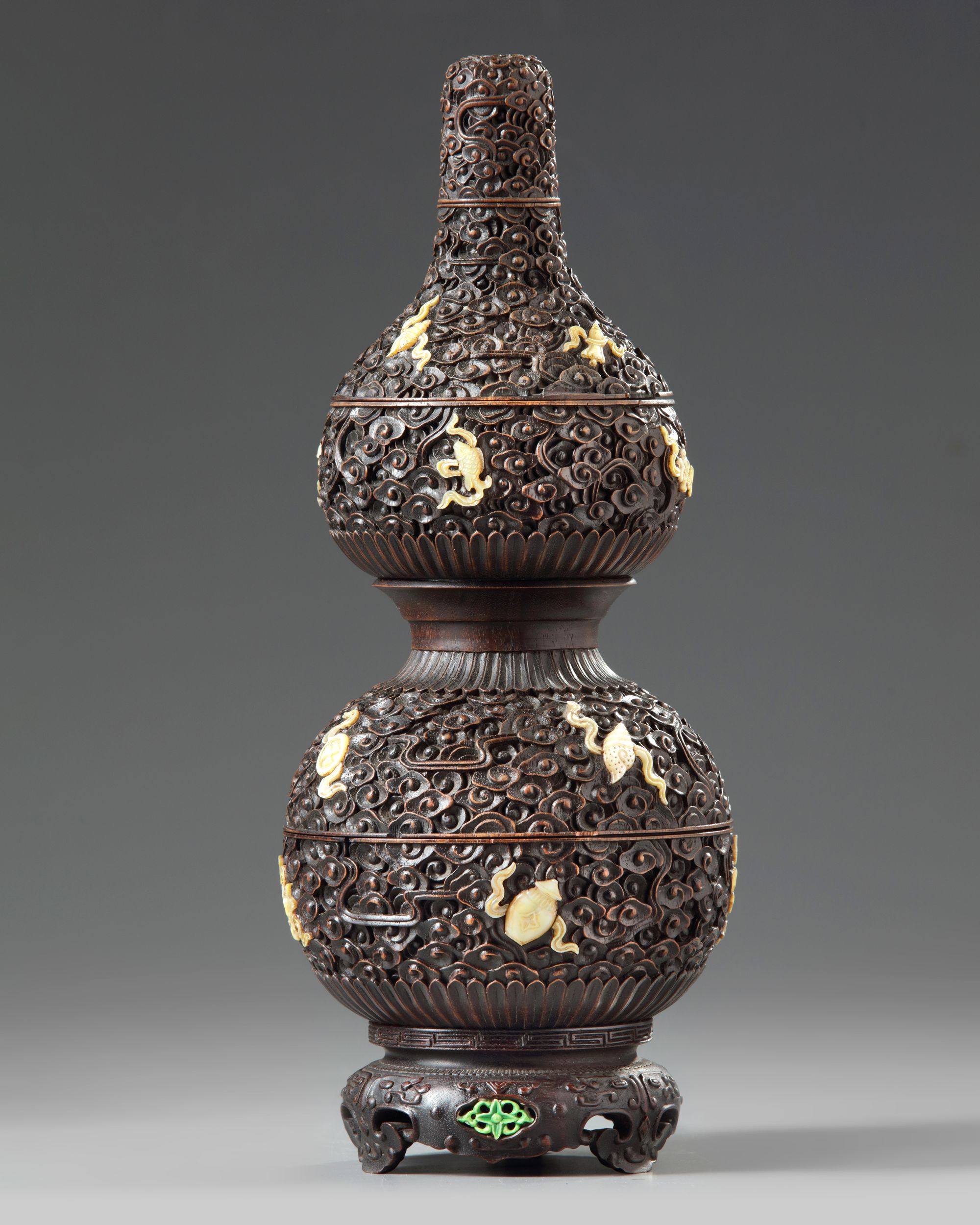 The vase is carved in three portions, the body is decorated with inlaid mother of pearl Eight Buddhist Emblems all reserved on densely scrolling lingzhi-shaped clouds, the waist is decorated with lotus petals. The gourd is carved with a stand which is decorated with inlaid green-painted flowers and standing on three ruyi-shaped feet. With a cloth lined wood box.