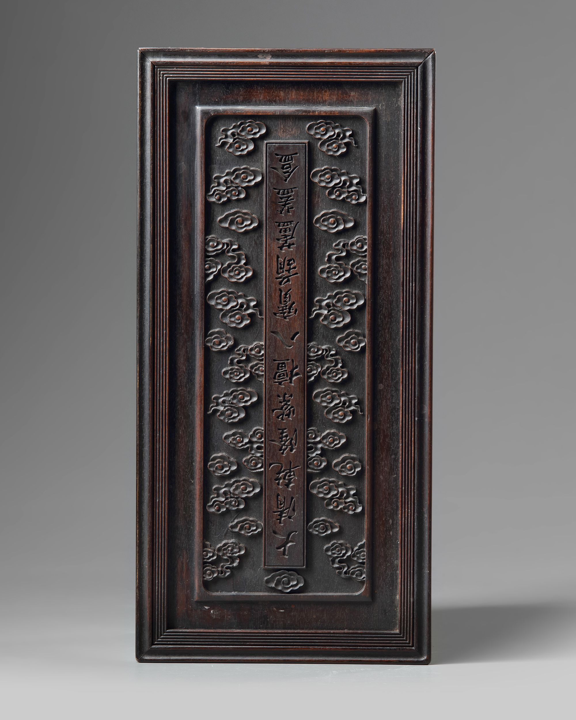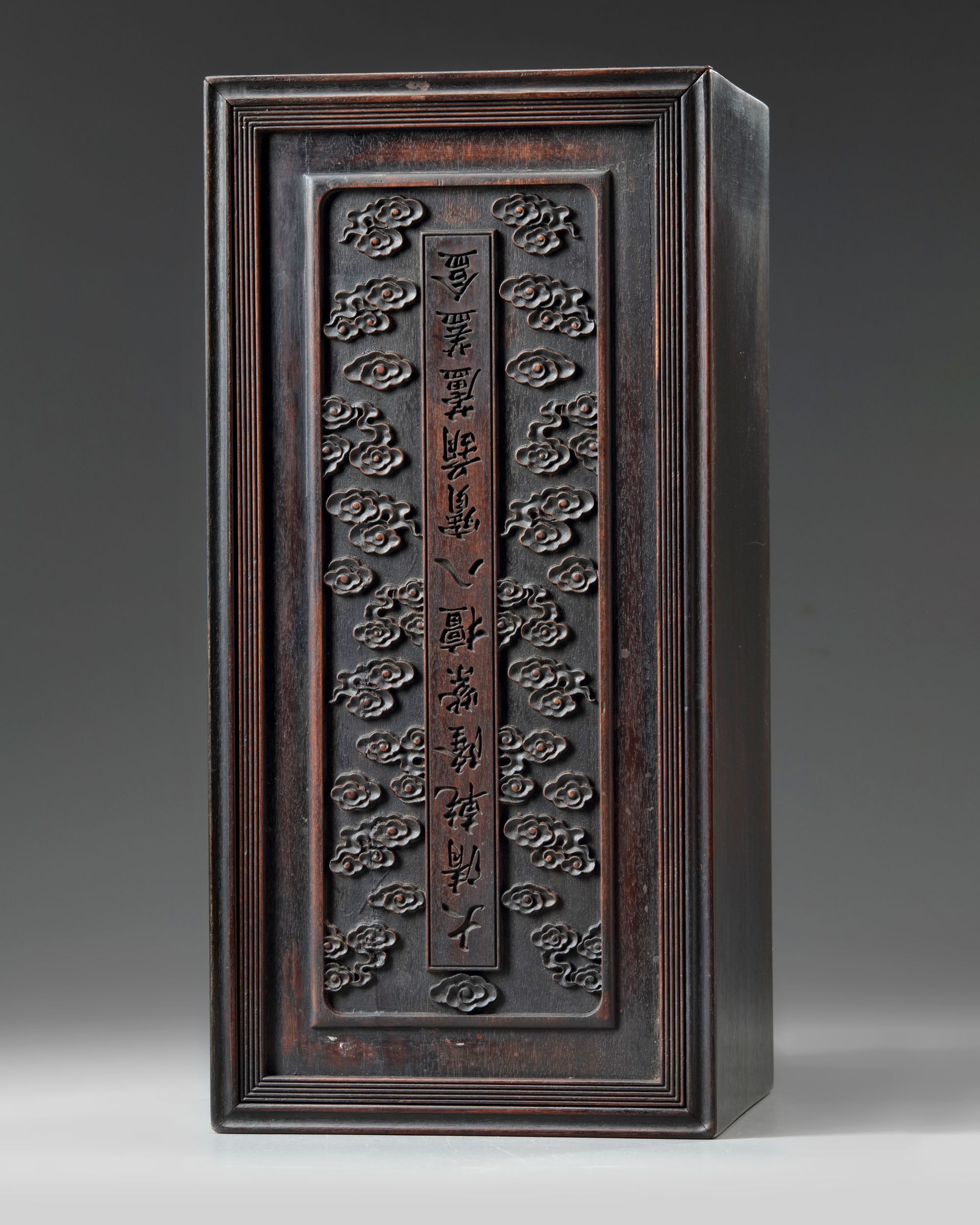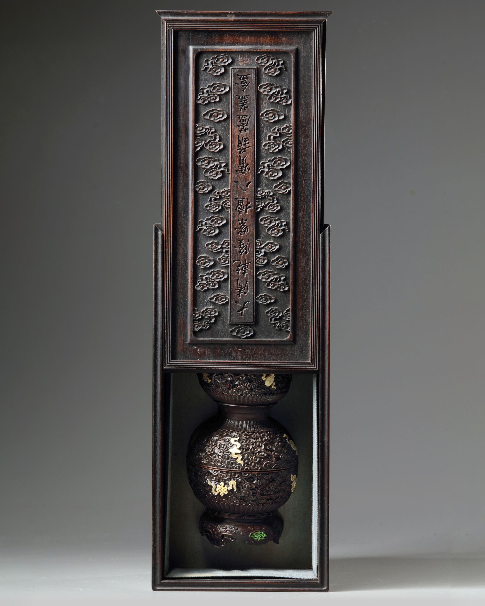The vase is carved in three portions, the body is decorated with inlaid mother of pearl Eight Buddhist Emblems all reserved on densely scrolling lingzhi-shaped clouds, the waist is decorated with lotus petals. The gourd is carved with a stand which is decorated with inlaid green-painted flowers and standing on three ruyi-shaped feet. With a cloth lined wood box.