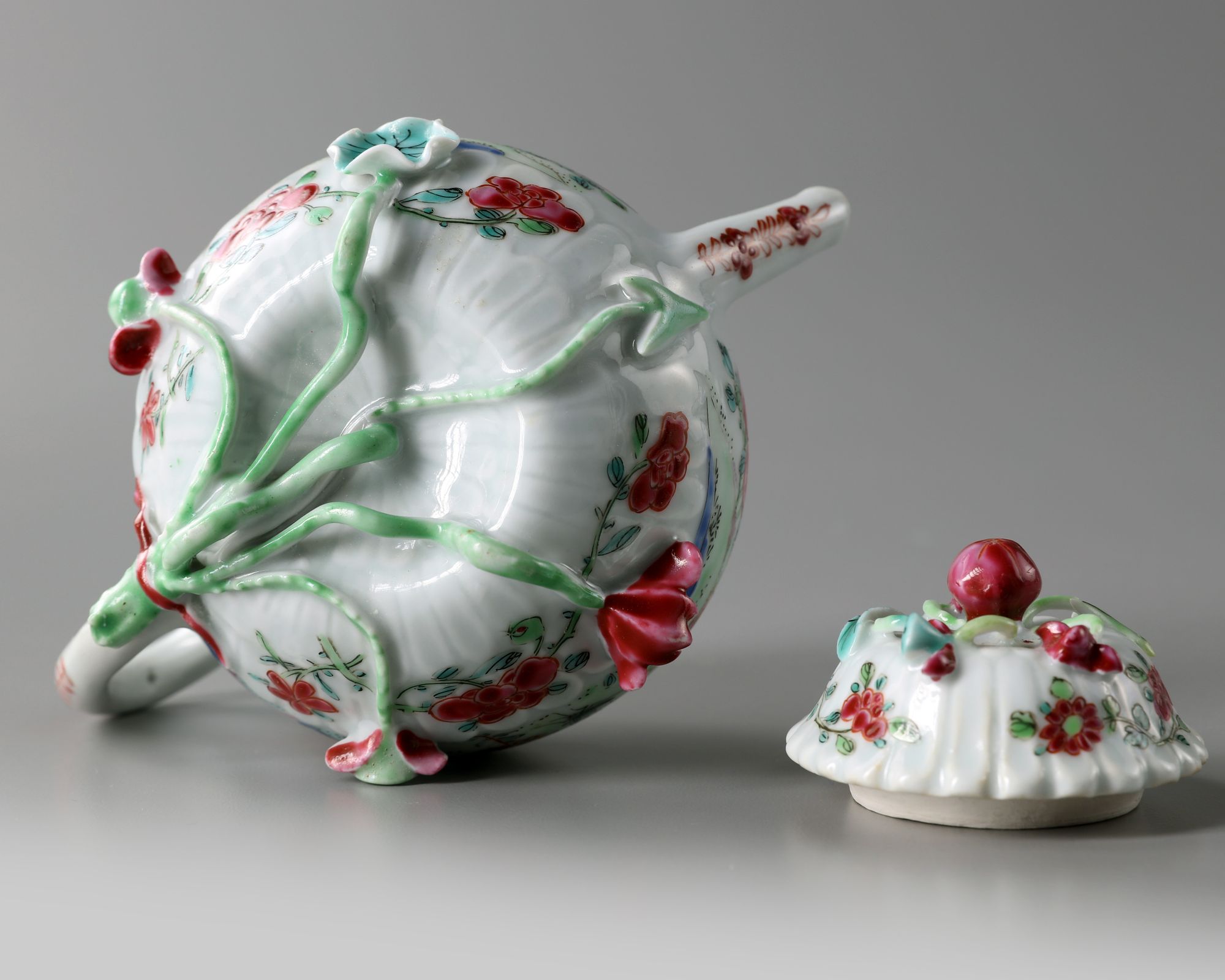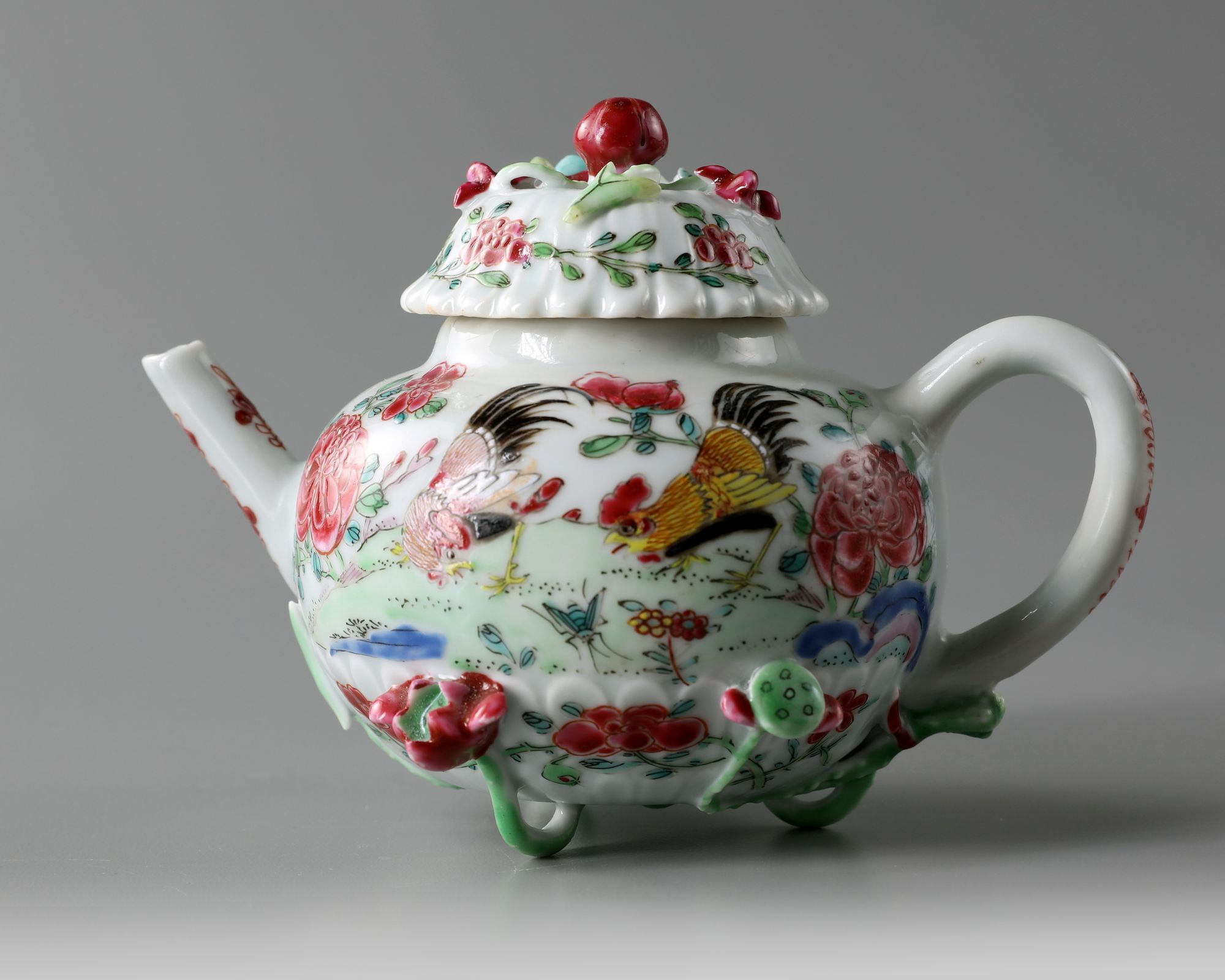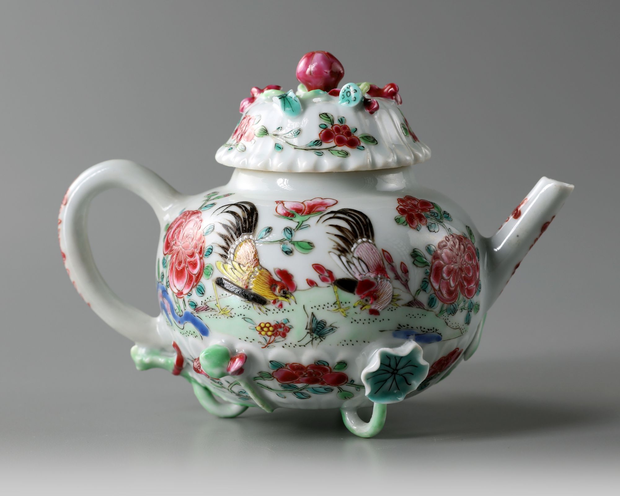 The teapot is of globular form, with the lower body moulded with chrysanthemum petals, the exterior is decorated in famille rose enamels with roosters amongst peonies. The teapot is supported on an applique lotus flower and root foot. The chrysanthemum-form cover is decorated with further applique lotus.