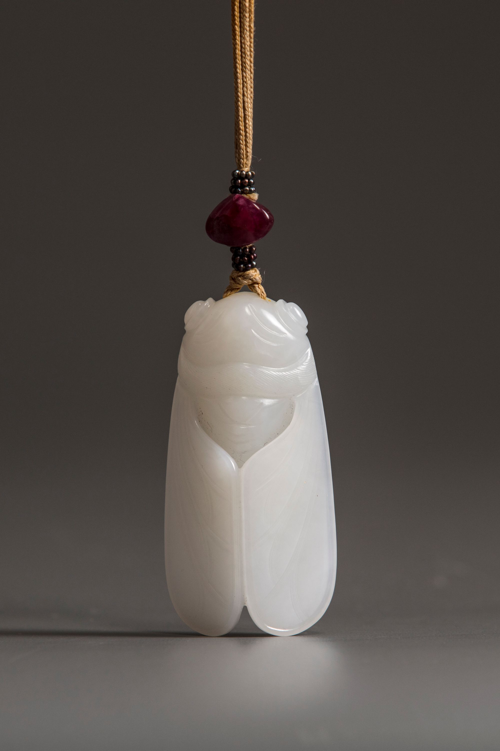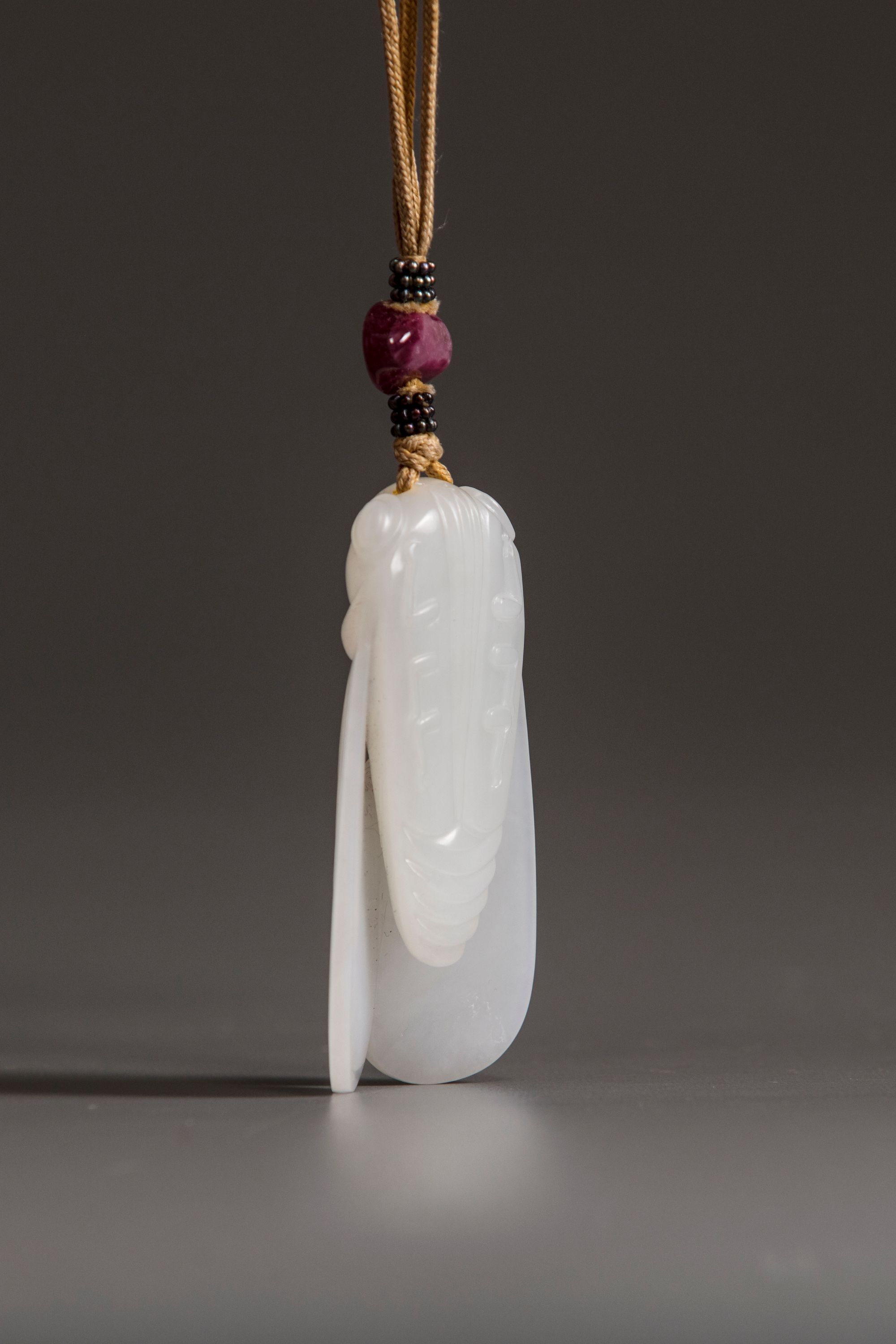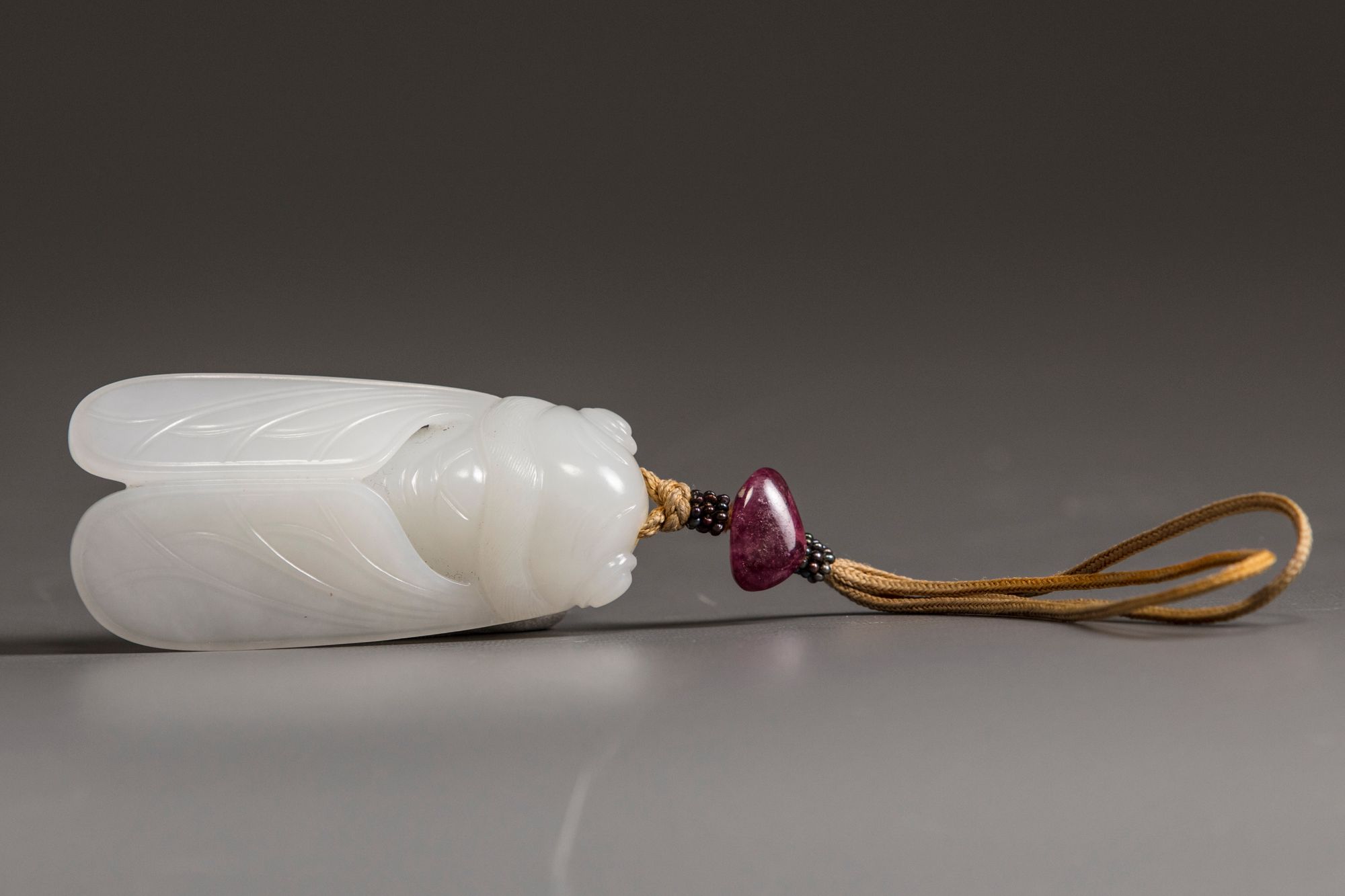 The Jade carving is carved in the shape of a cicada with its wings closed upon its back. The details of the head and the wings are finely incised. The stone is of an even pale tone.