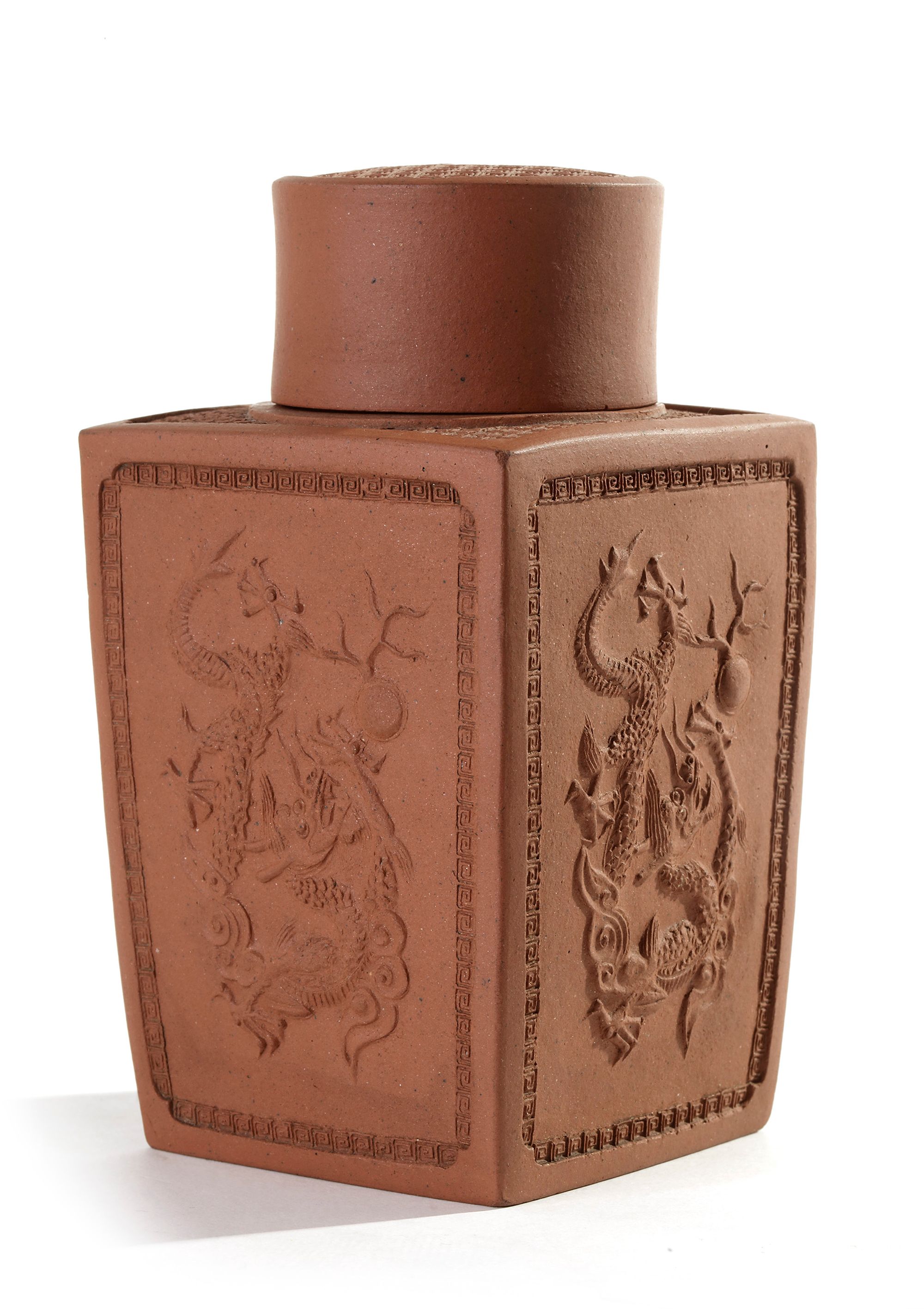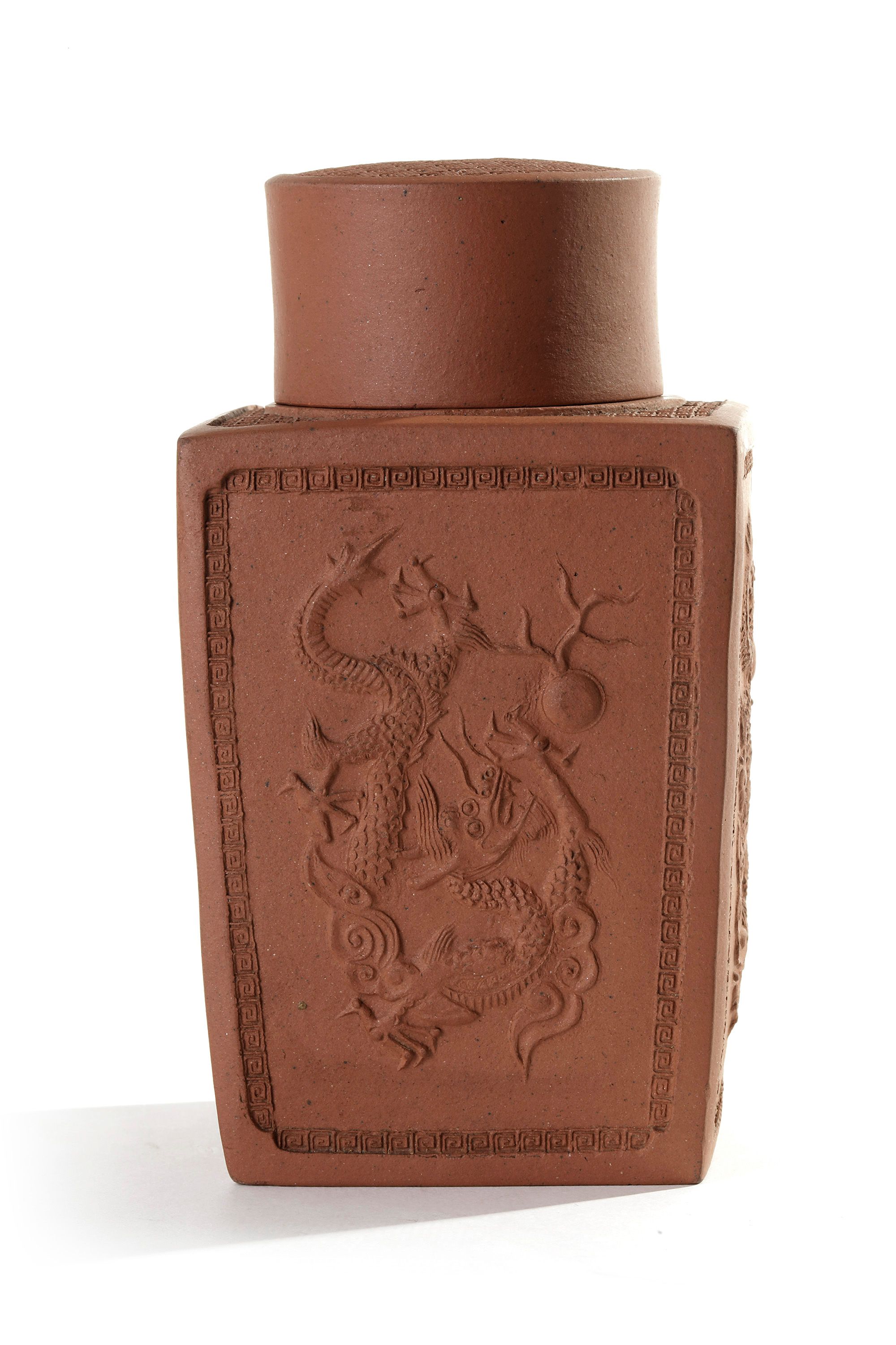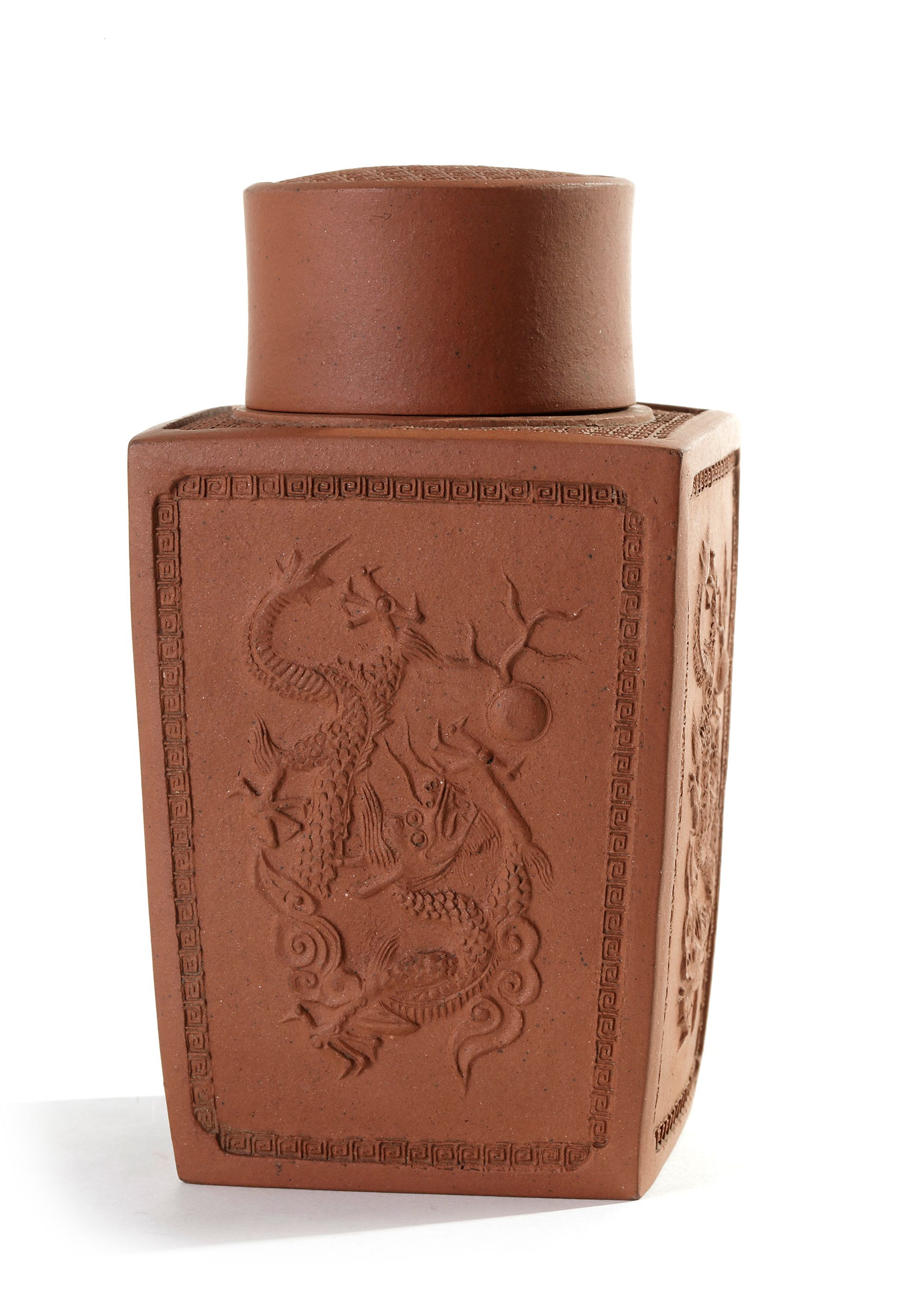 A Chinese yixing 'dragon' square-section tea caddy and cover
