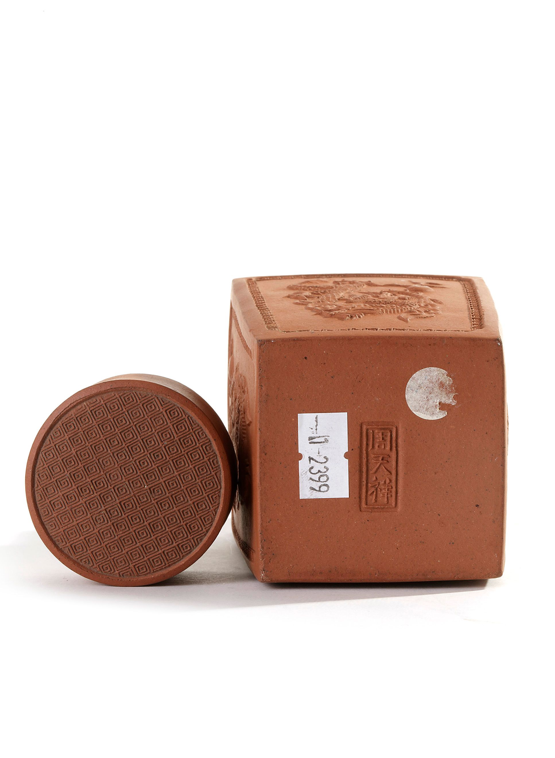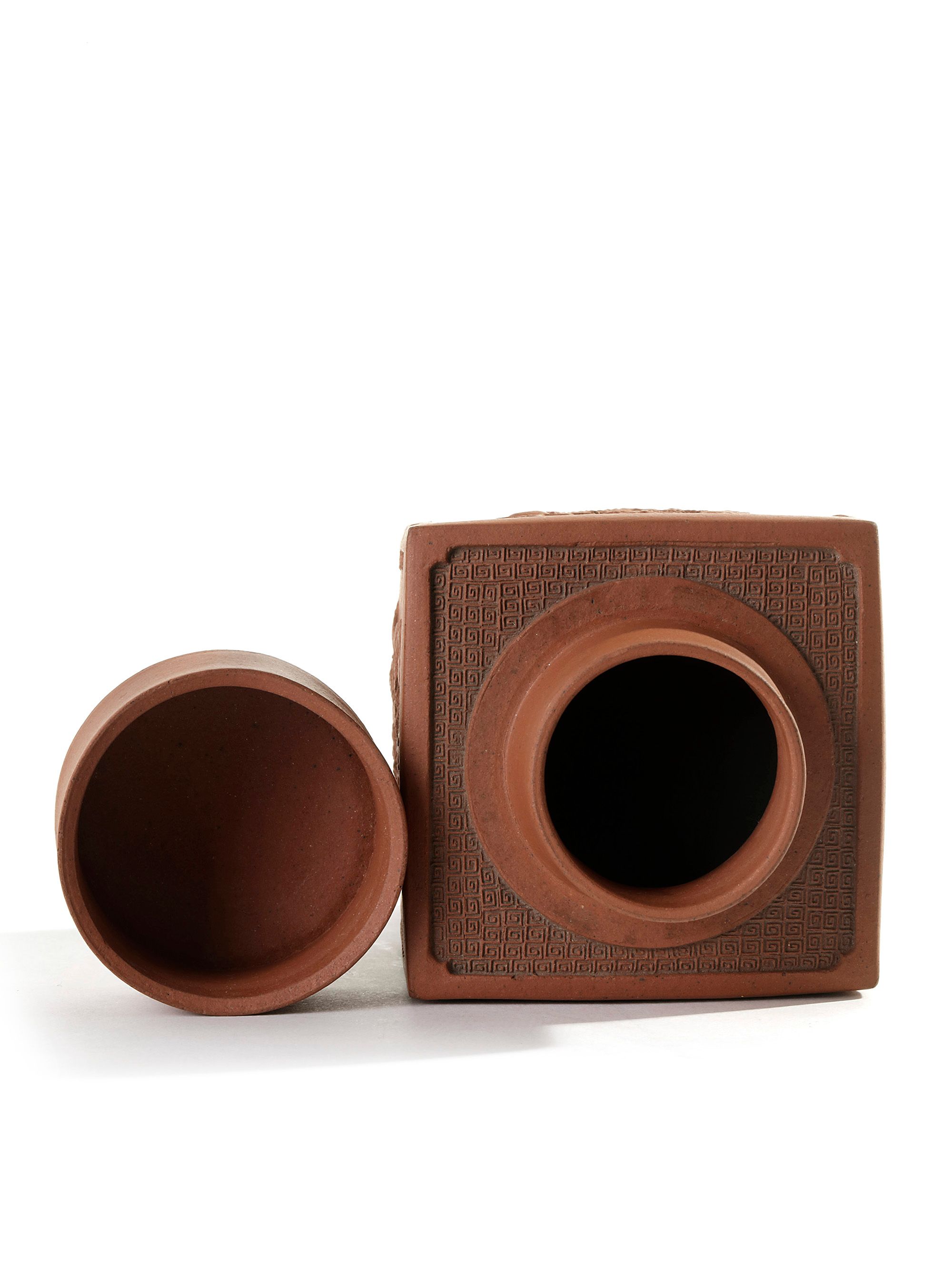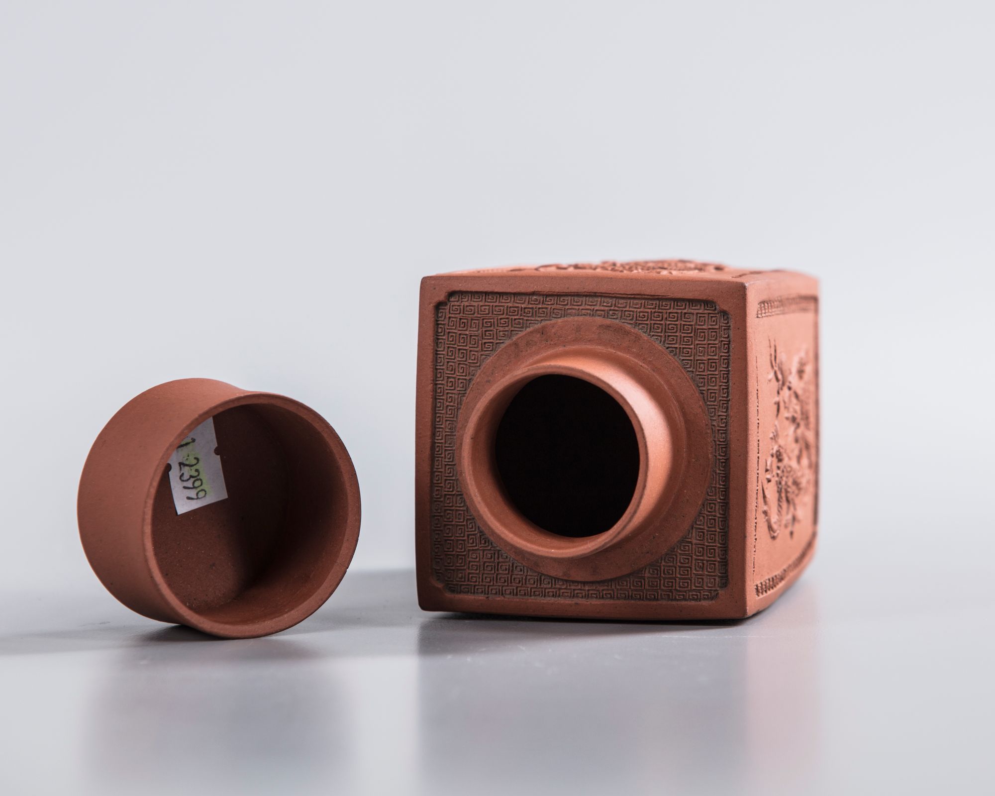 A Chinese yixing 'dragon' square-section tea caddy and cover