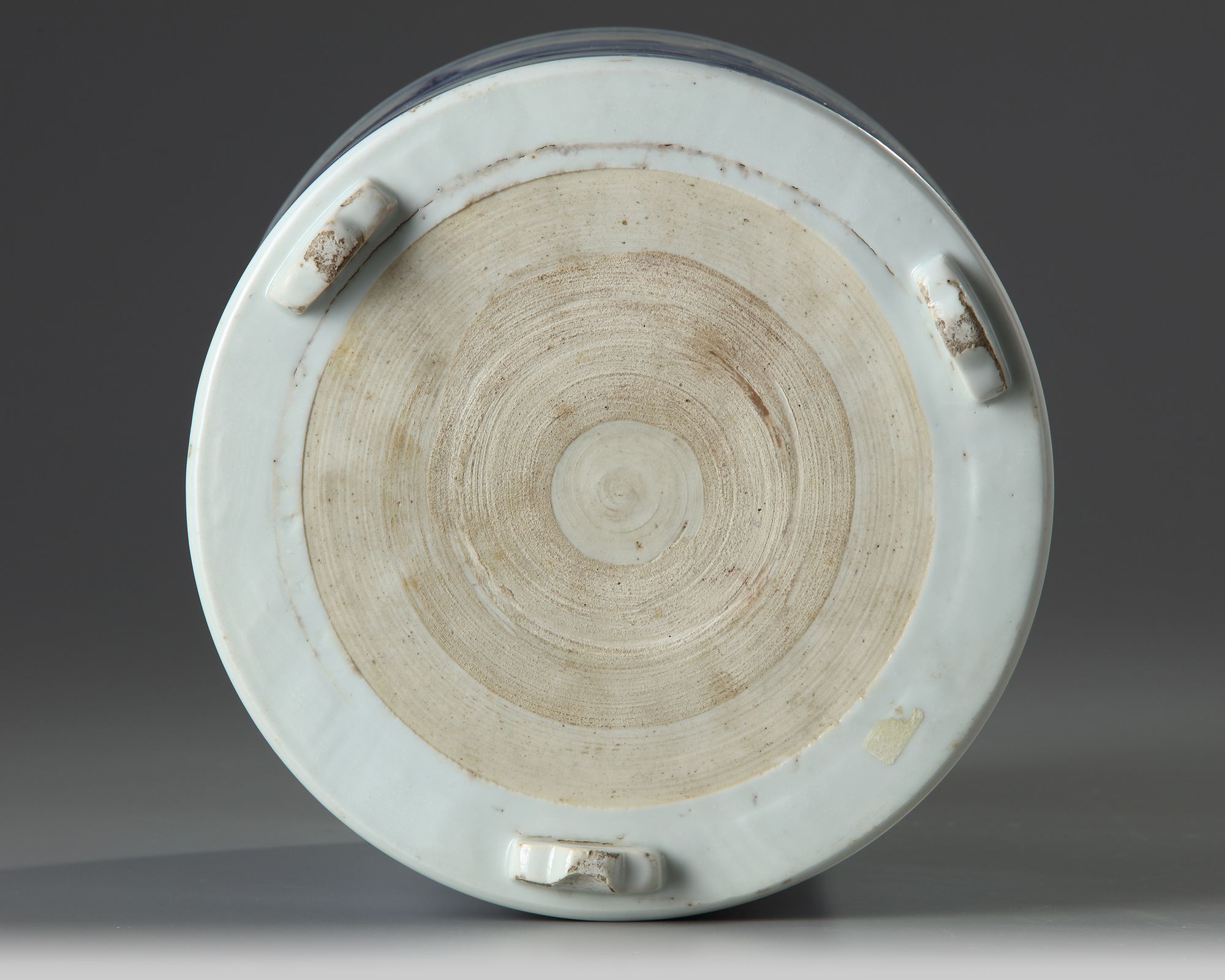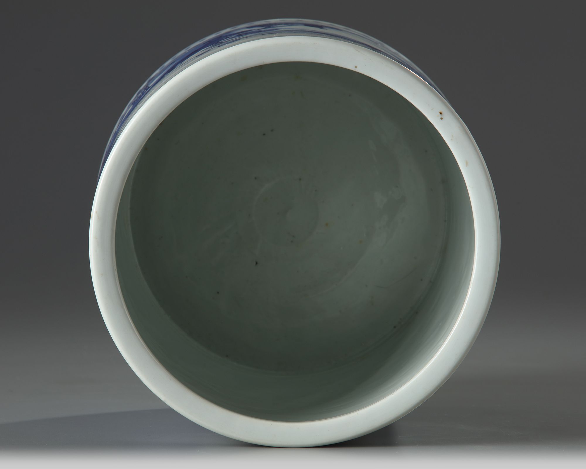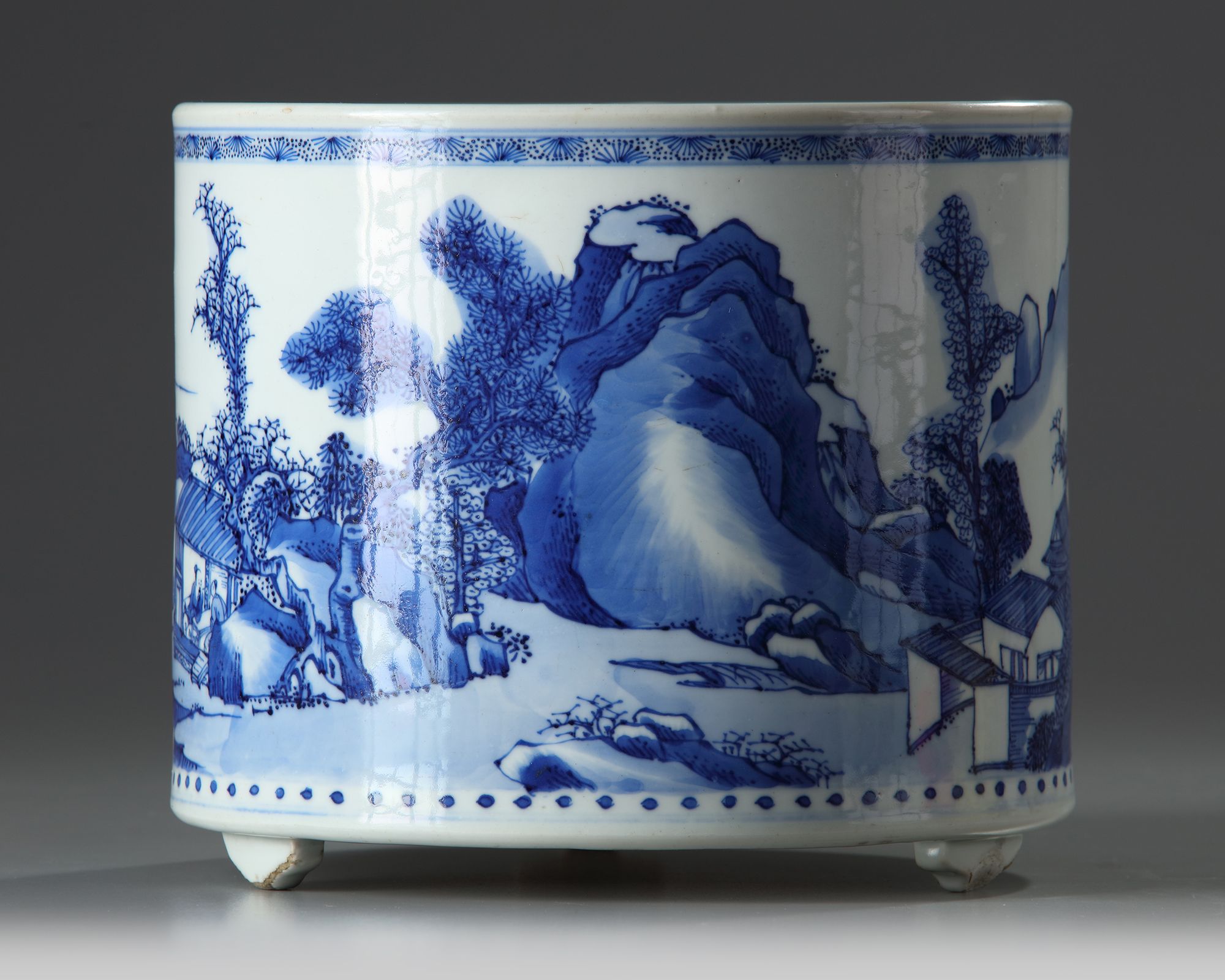 The impressive piece stands on three short feet. The straight sides are decorated in various shades of rich cobalt blue with a continuous scene of scholars in pavilions, conversing, and a figure fishing on a sampan, all below trees in a rocky mountainous river landscape. The rim is decorated with a demi-floral head band on a stippled ground and the foot is encircled with a band of dots.