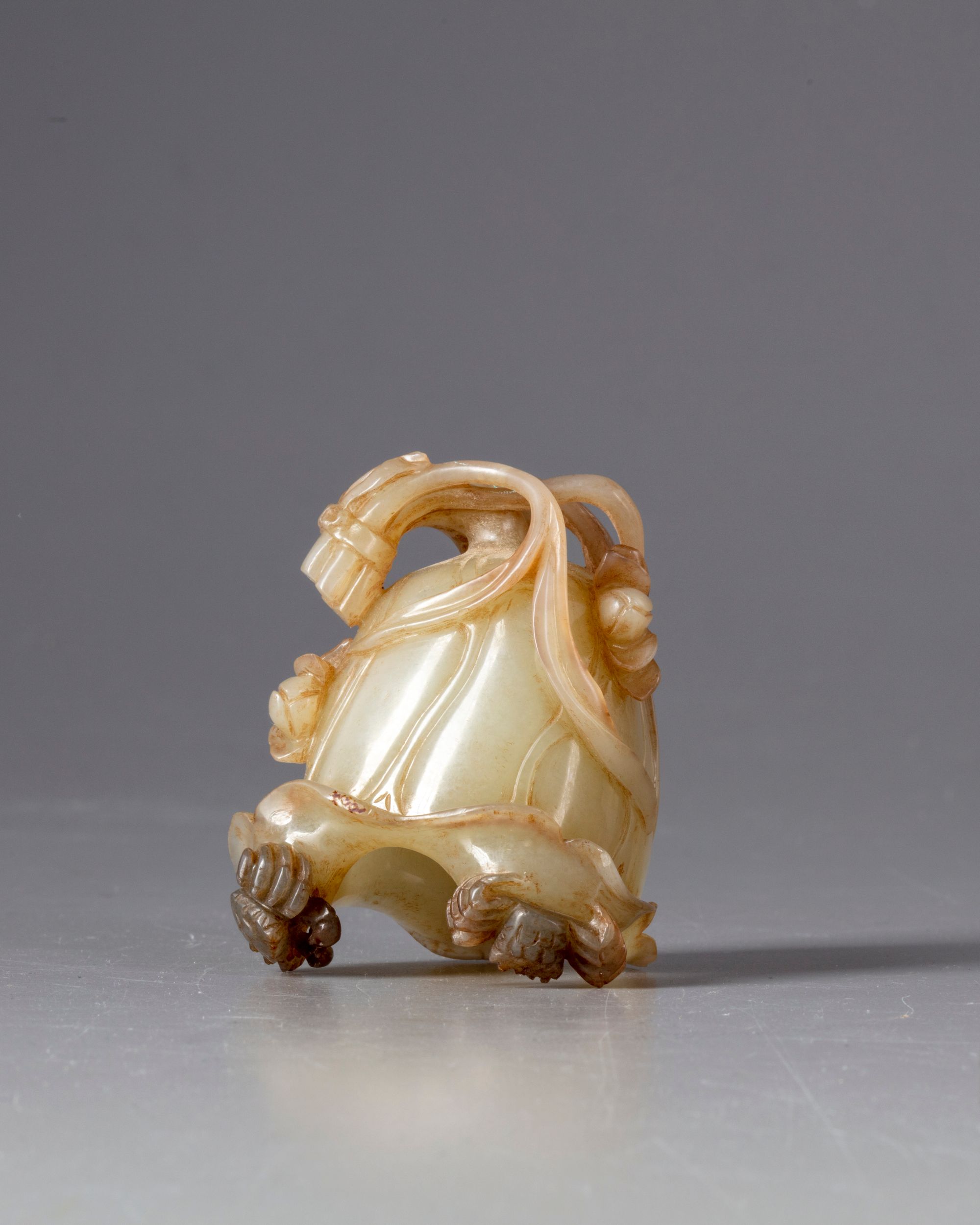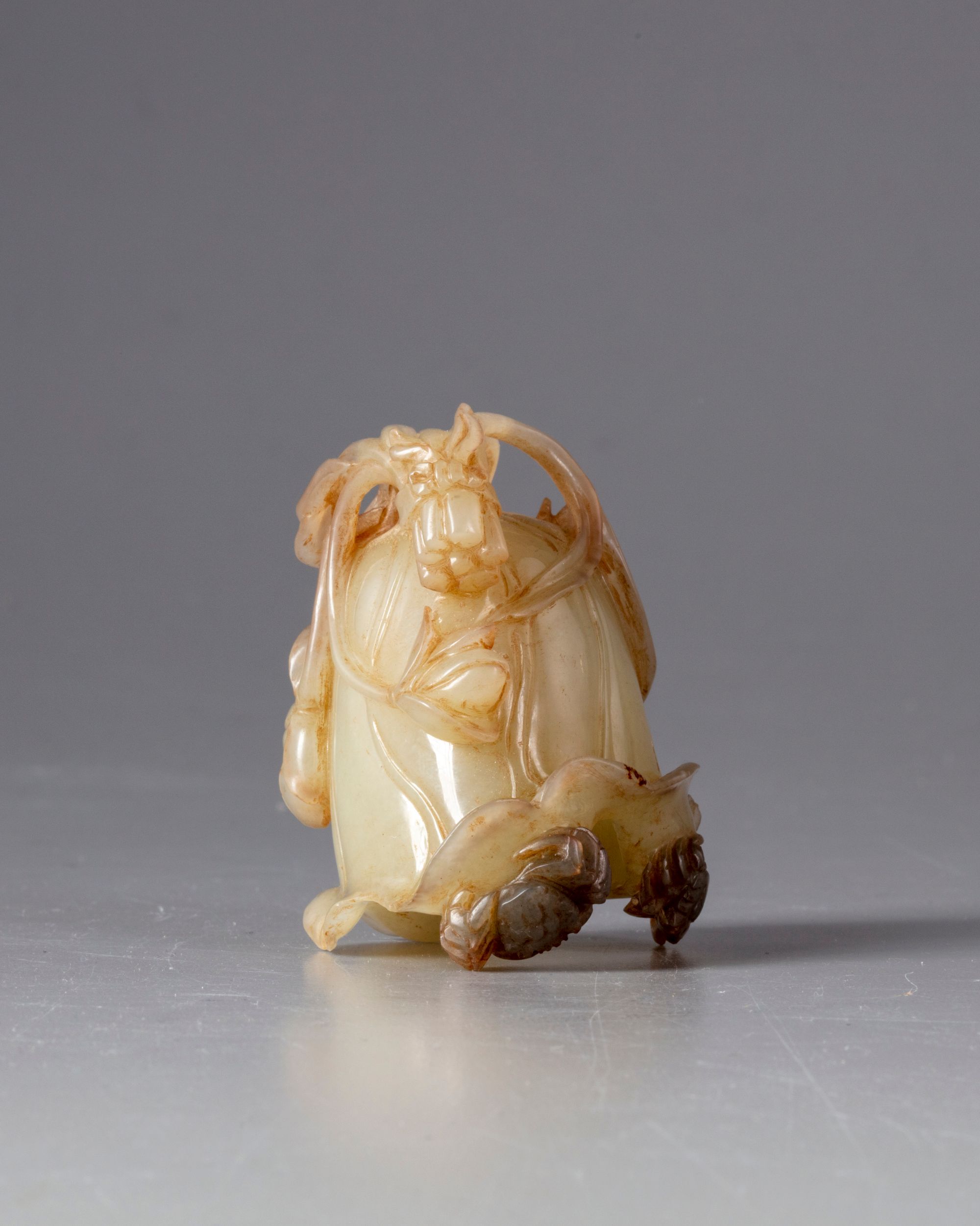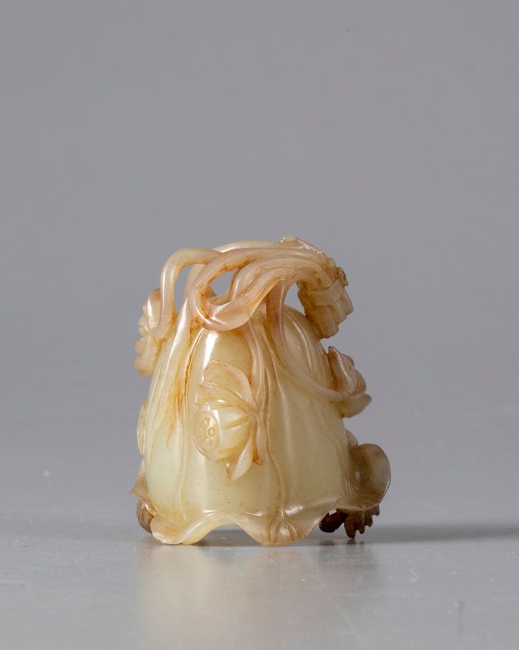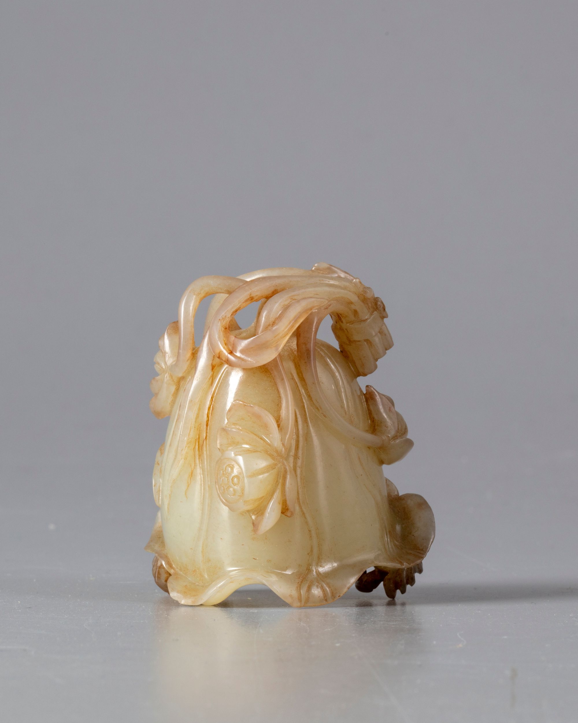 A Chinese pale jade carving, depicting a lotus shaped cup with two crabs around the rim.