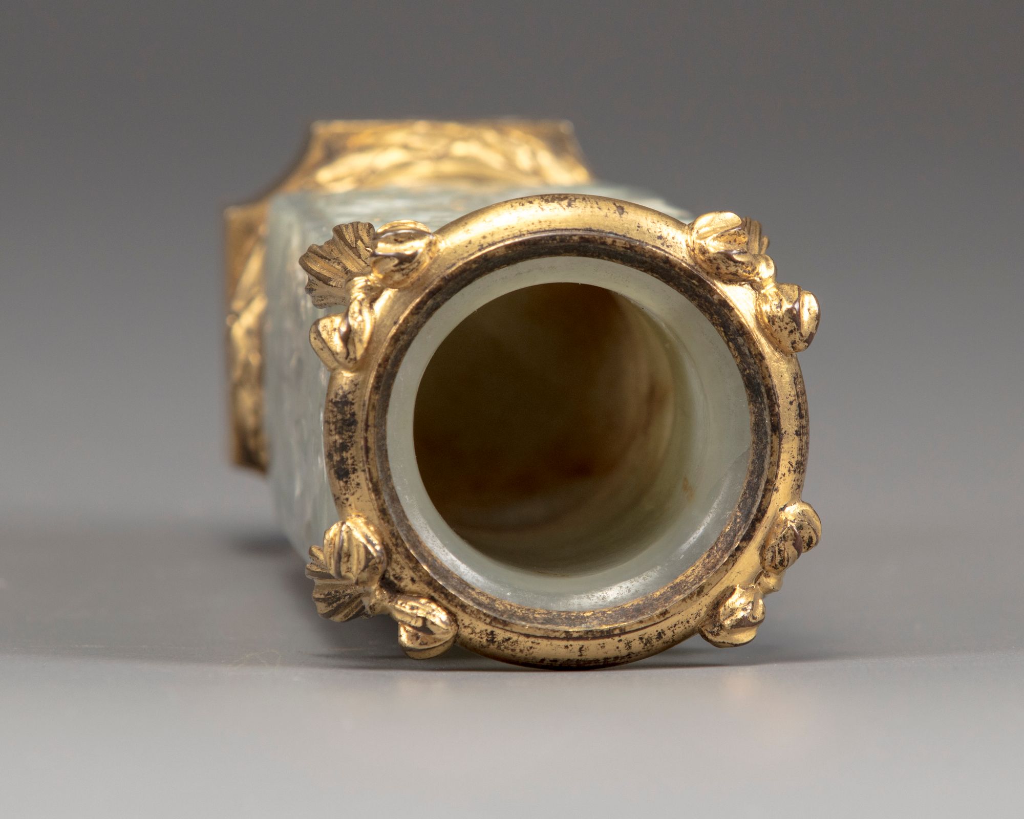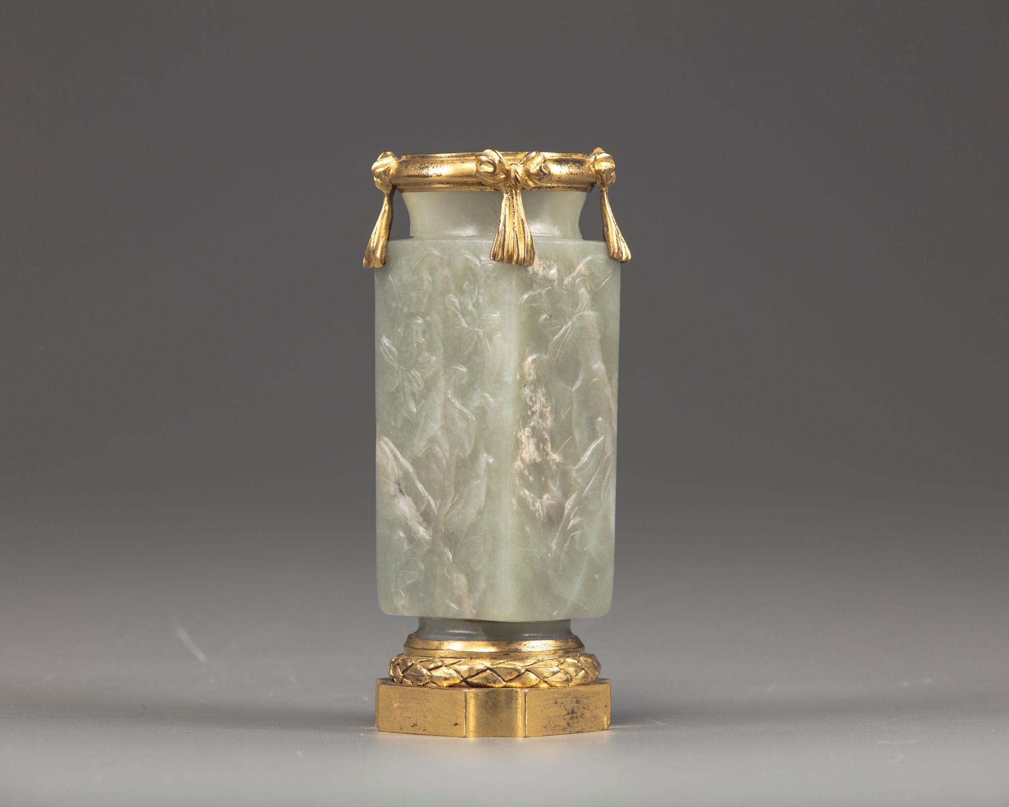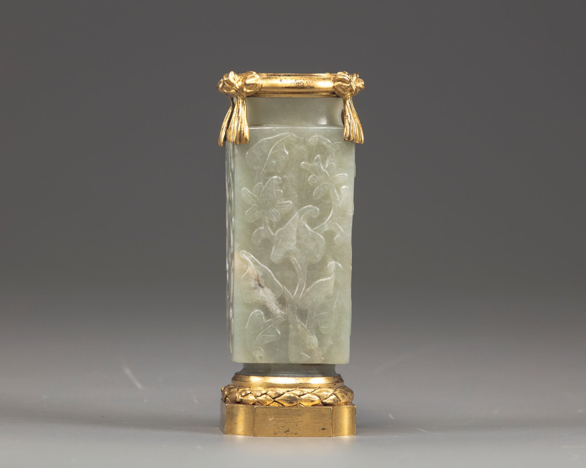 The square-section jade vase is decorated with a large floral bloom to each side, the rim and feet are mounted in later European gilt bronze mounts. The stone is of a celadon tone with a few pale and russet inclusions.