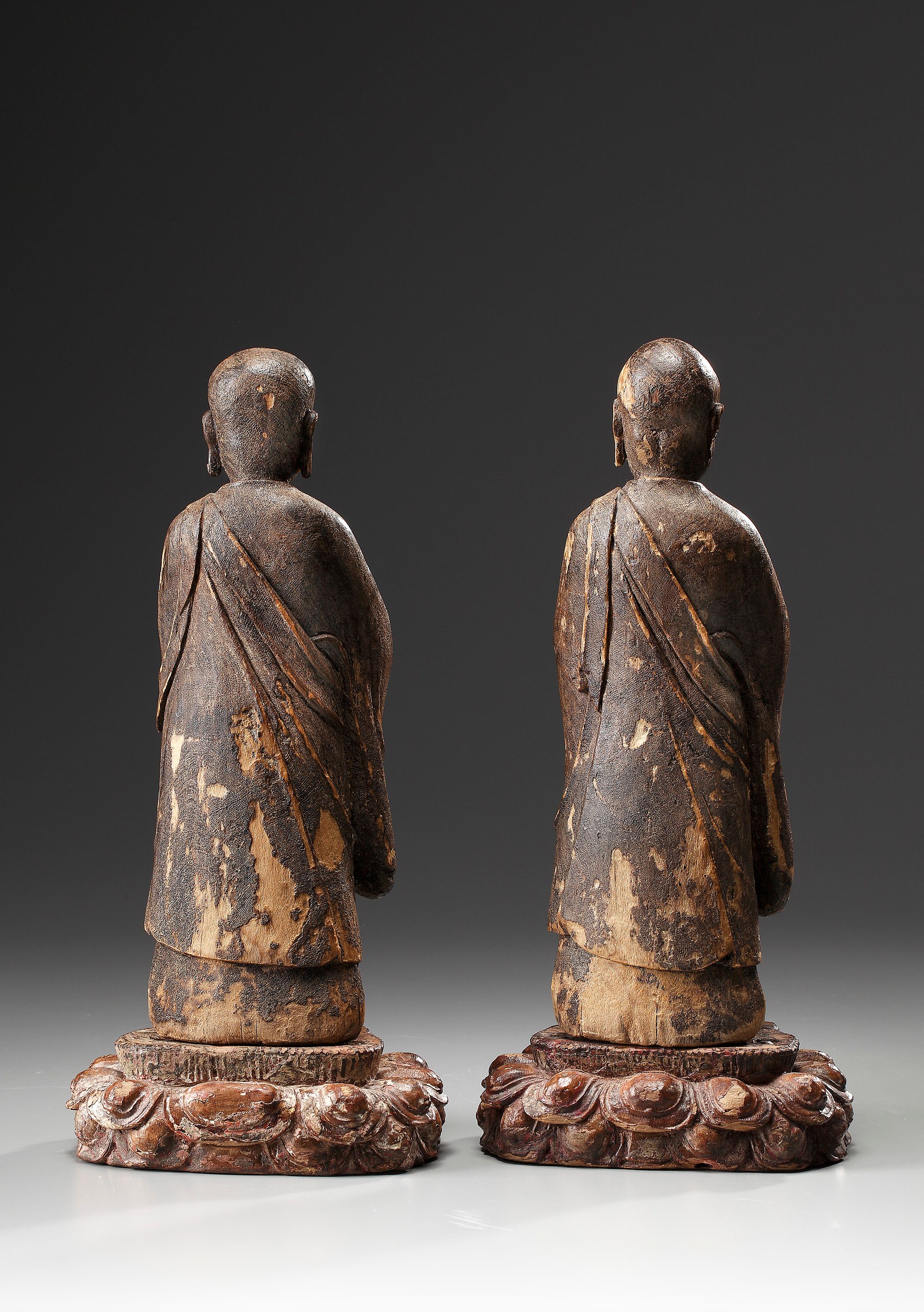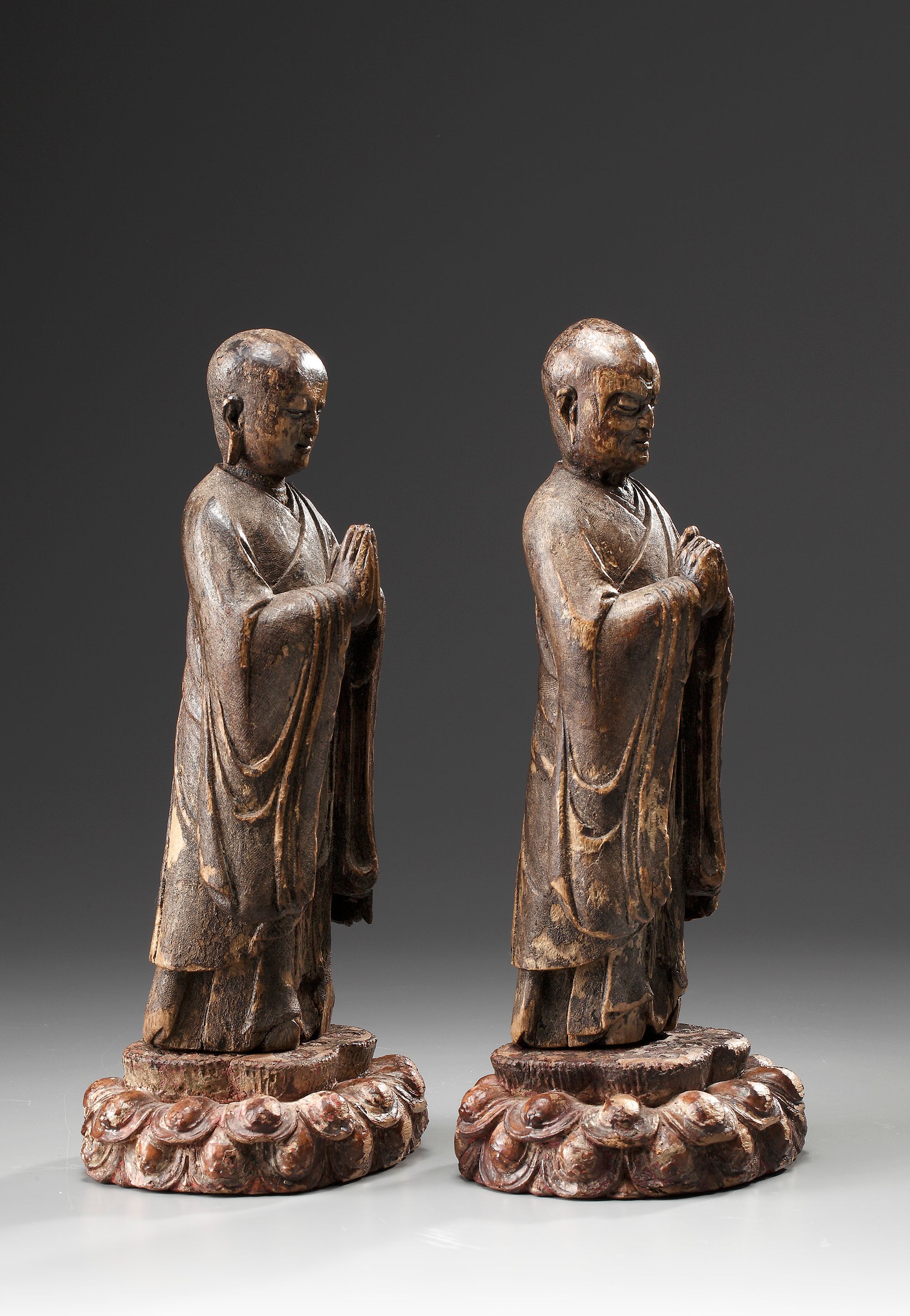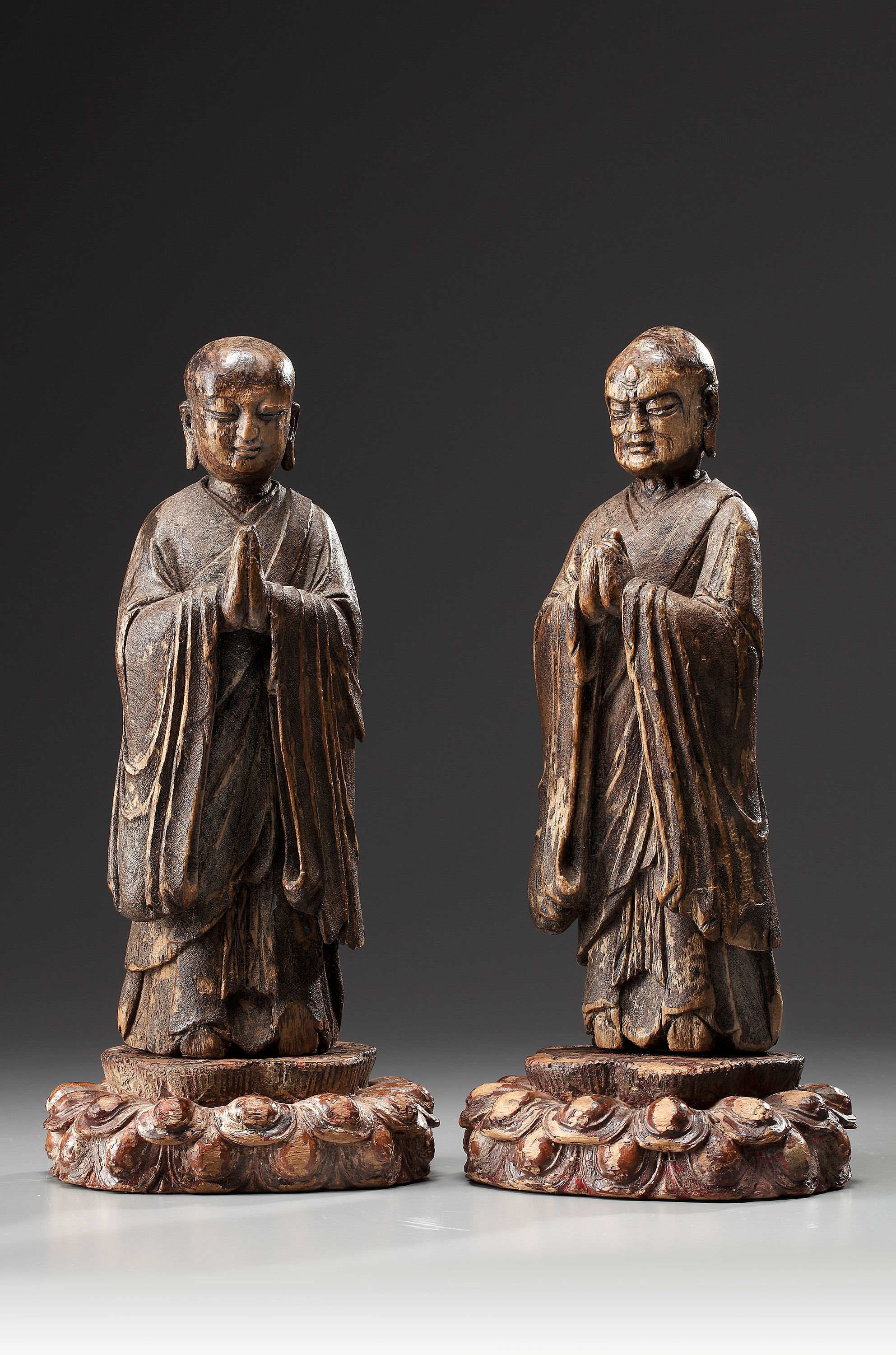 A fine pair of wood figures of Ananda and Kasyapa standing on lotus thrones and each dressed in long sleeved flowing robes, wrapped in layers across the body. The youthful Ananda with a shaven head, serenely composed face, elongated ear lobes and with the hands raised and pressed together in nebina gassho, the gesture of the firm and sincere heart. Kasyapa with a shaven head and elongated ear lobes, the forehead, eyebrows, cheeks and mouth fixed deep in frown of concentration. The hands raised and locked together in the in the gesture of kanjo-in, the mudra to accompany the ceremony of unction. The robes of both figures covered with fine fabric under traces of the original dark lacquer and the lotus thrones decorated with the original colours.