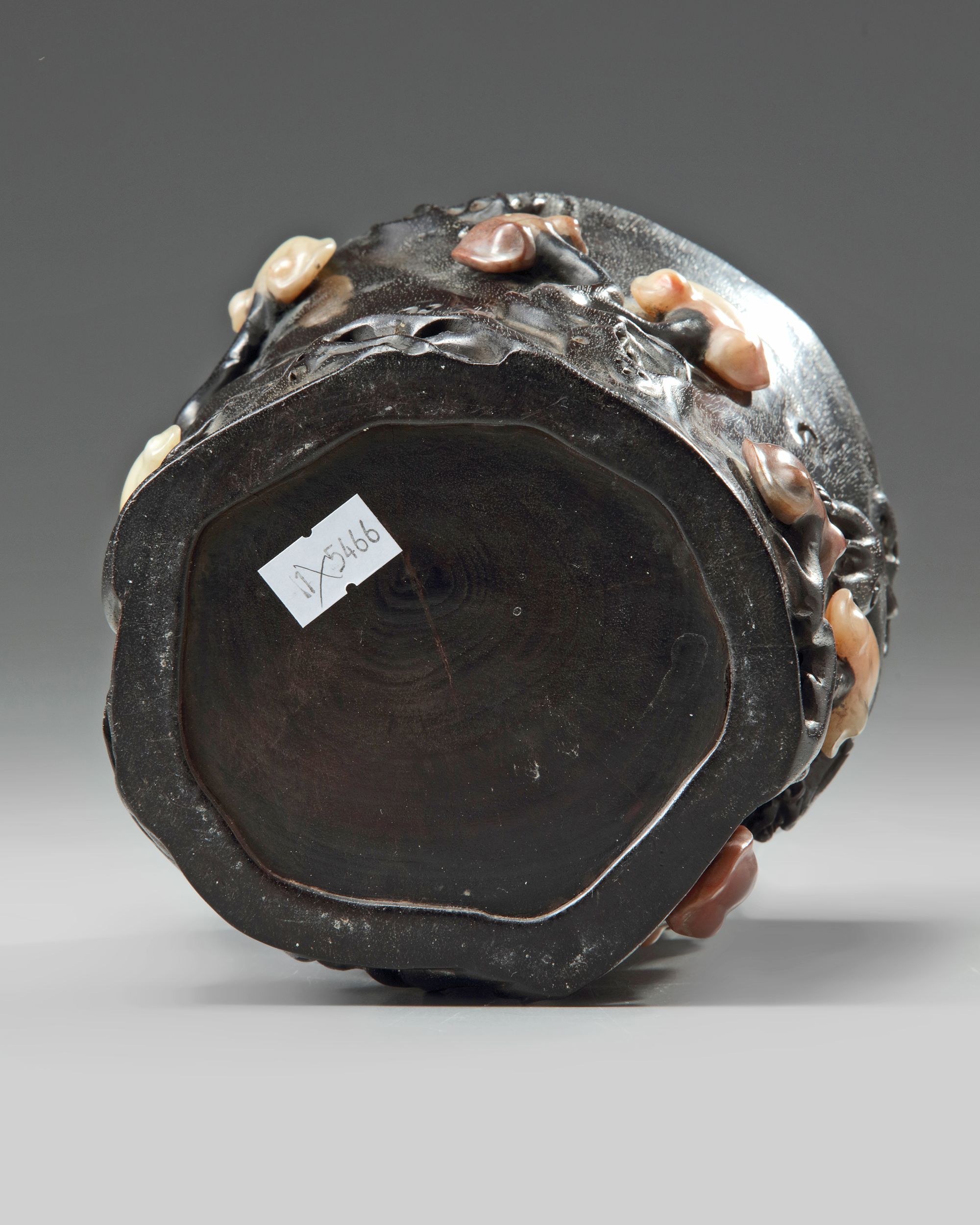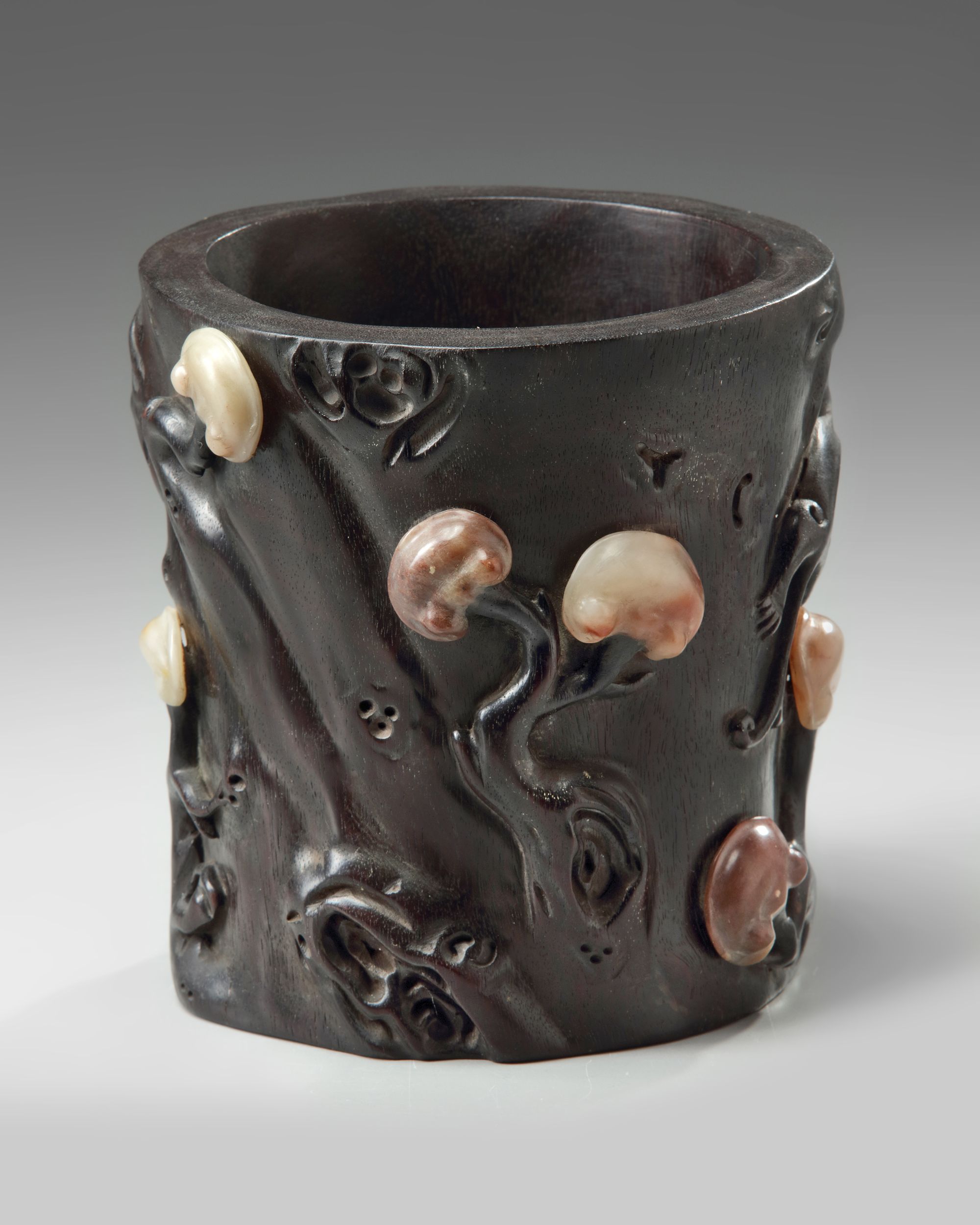 A Chinese hardstone-inlaid hardwood 'lingzhi' brush pot