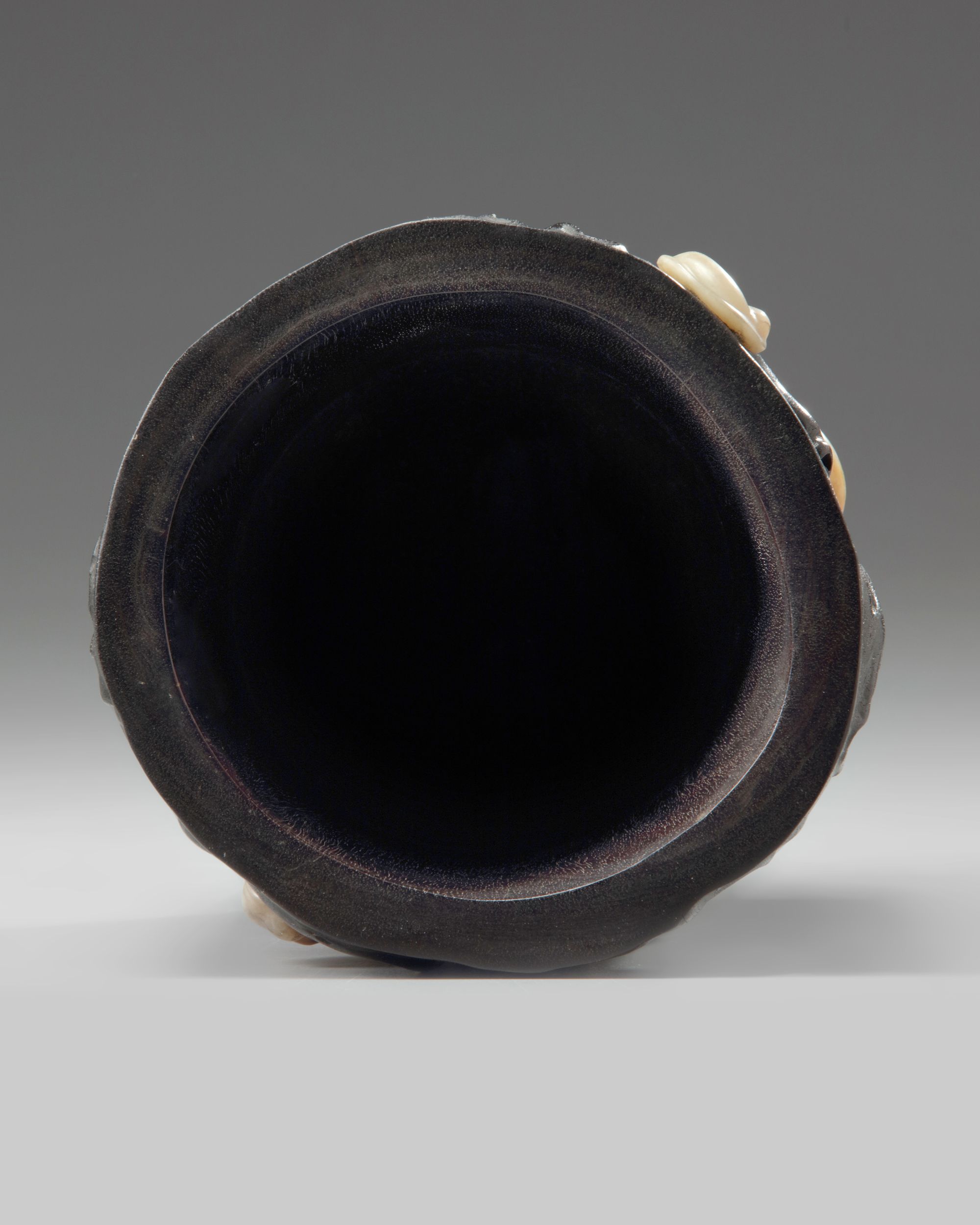 Carved naturalistically as a tree trunk with two chilong clambering on the side. The exterior is carved with lingzhi fungus growing from the tree trunk with the heads of the fungus as inlaid hardstones.