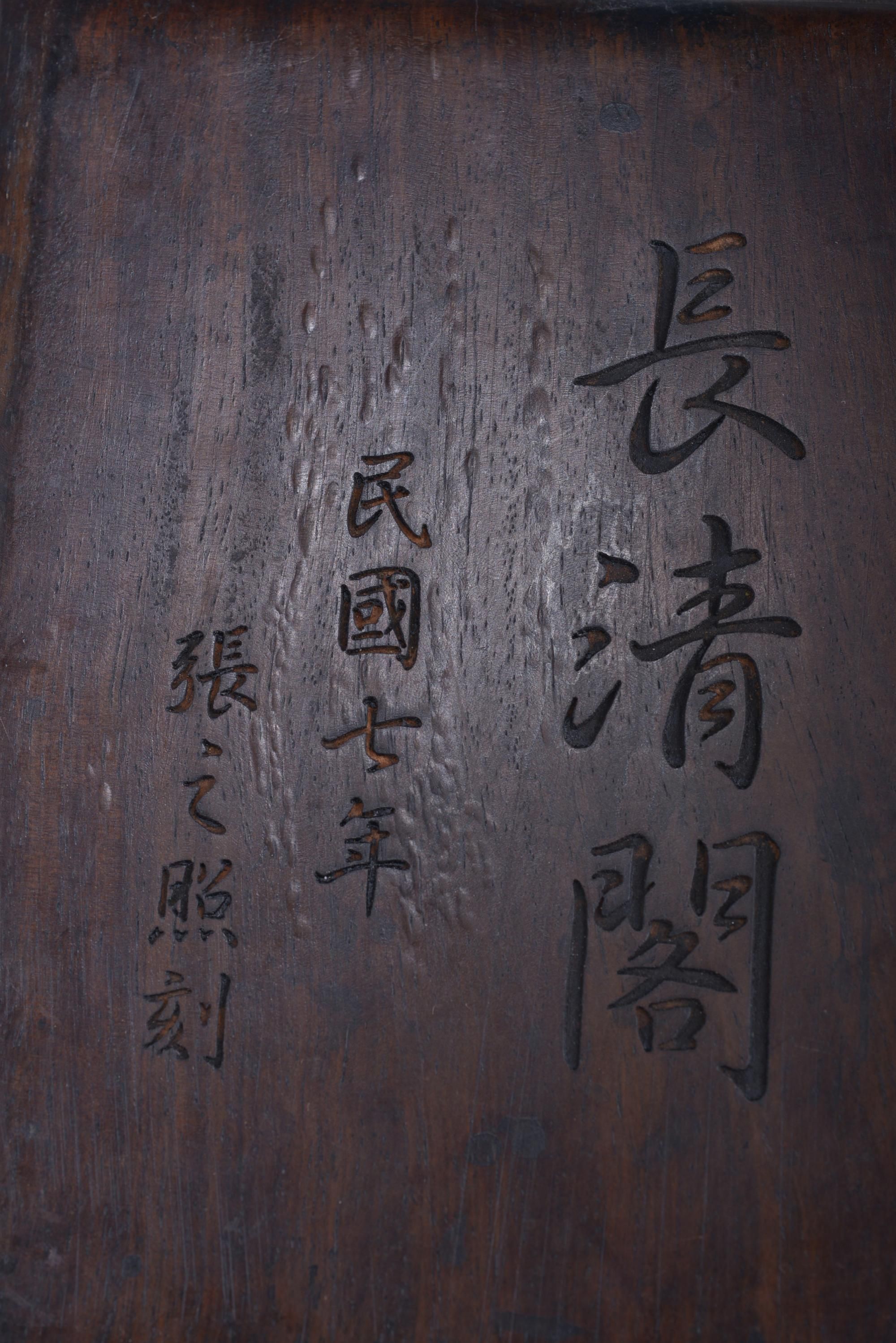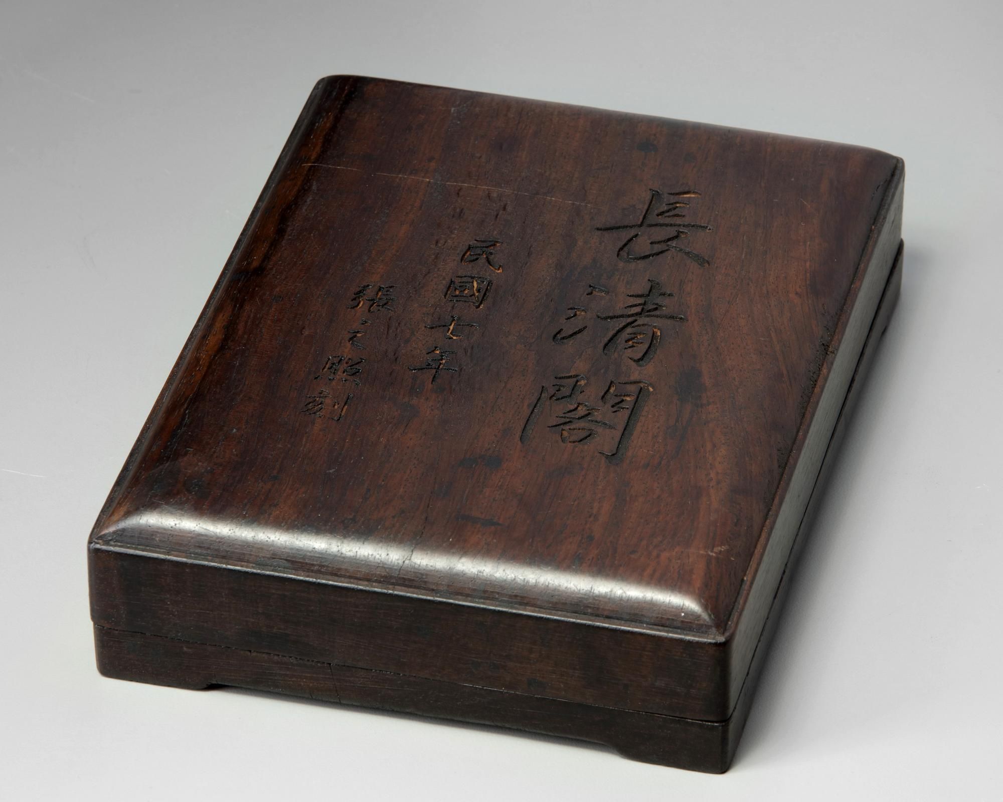 The ink stone is crafted with a circular depression to the lower surface, the upper surface is inscribed. The rectangular box is inscribed 'Chang Qing Ge', dated the seventh year of the Republic, with the signature of Zhang Zhizhao.