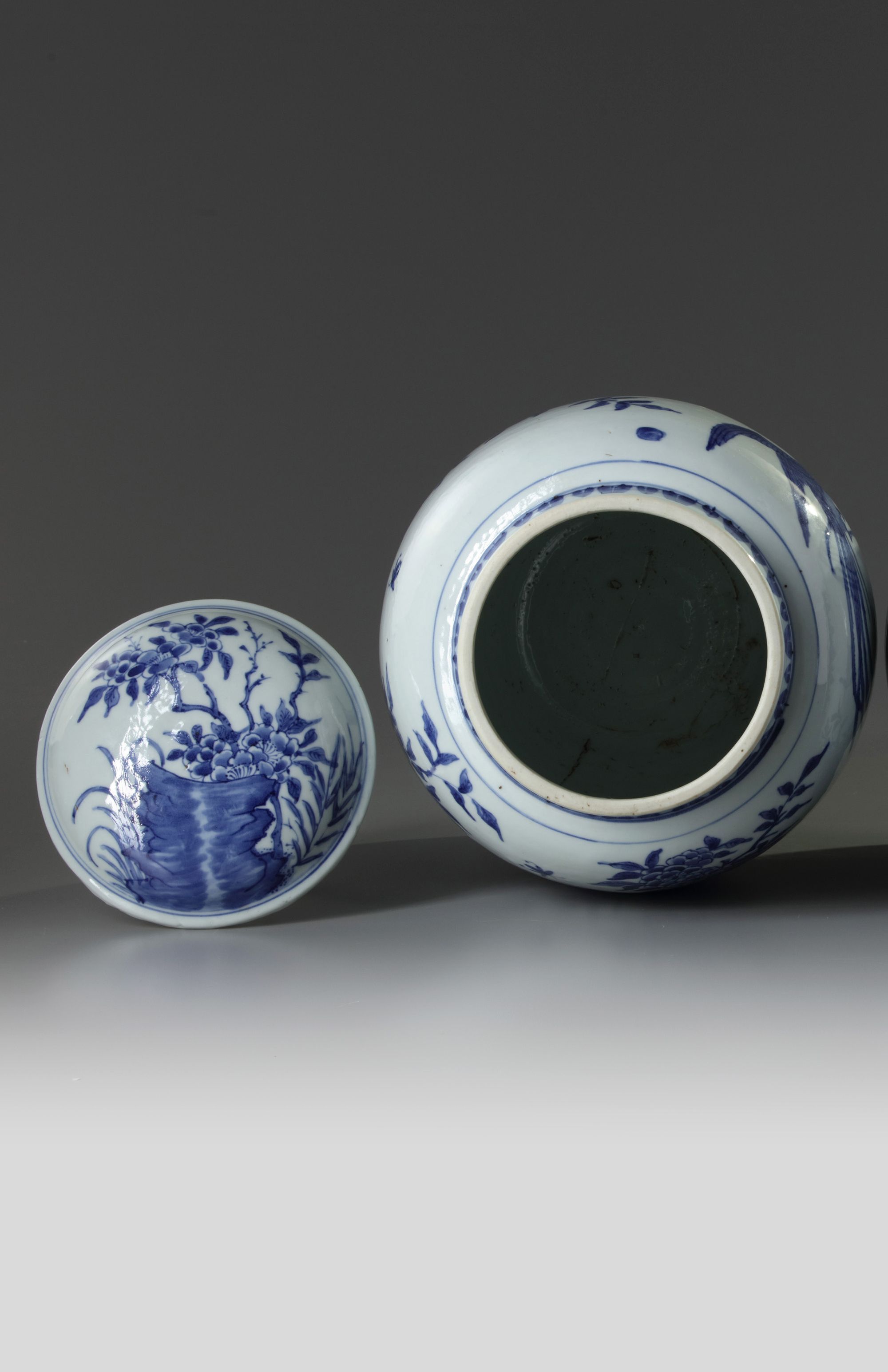 The jar is decorated with scattered birds and flowers, all below a stiff leaf band at the neck. The domed cover is similarly decorated.