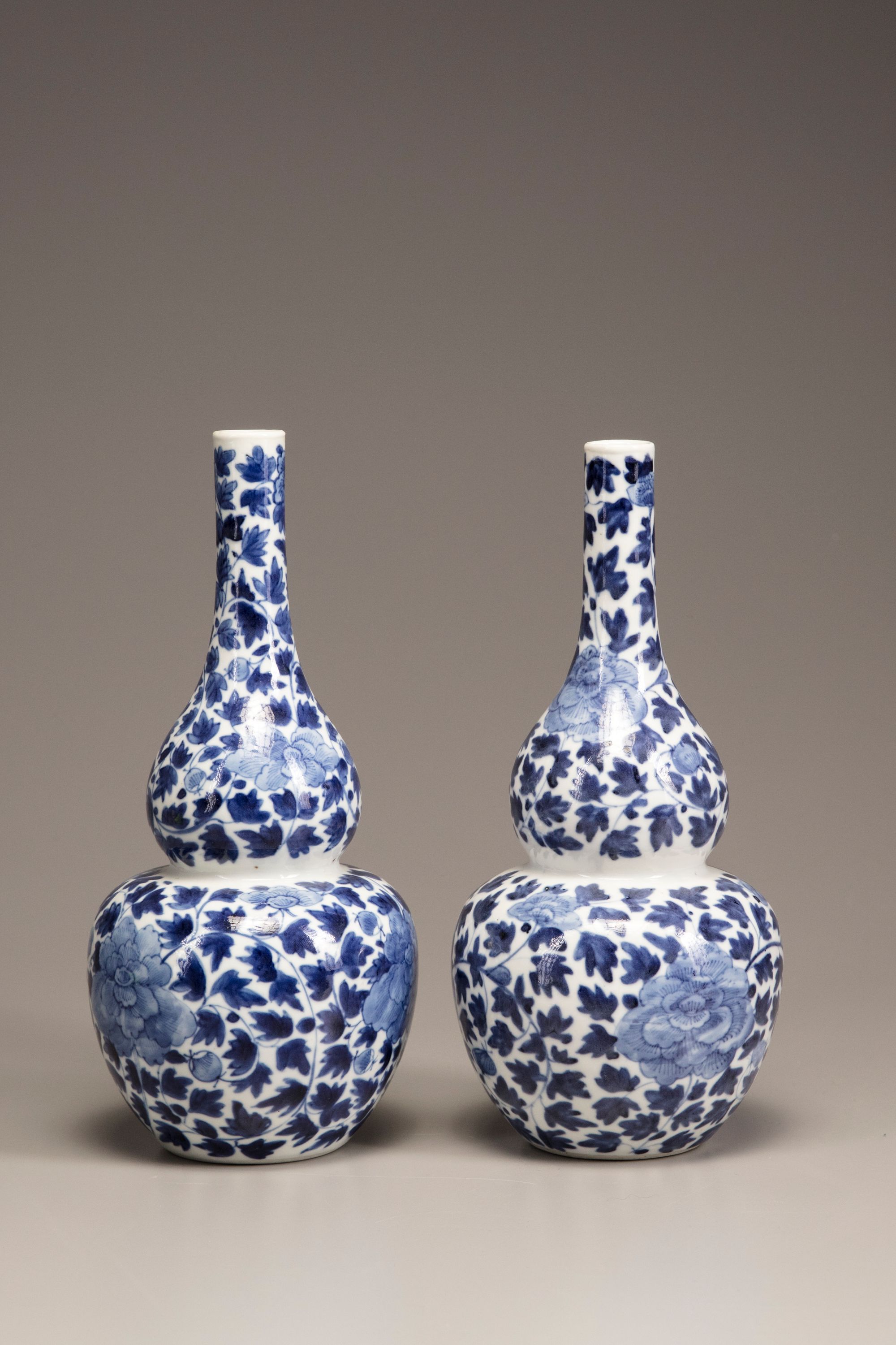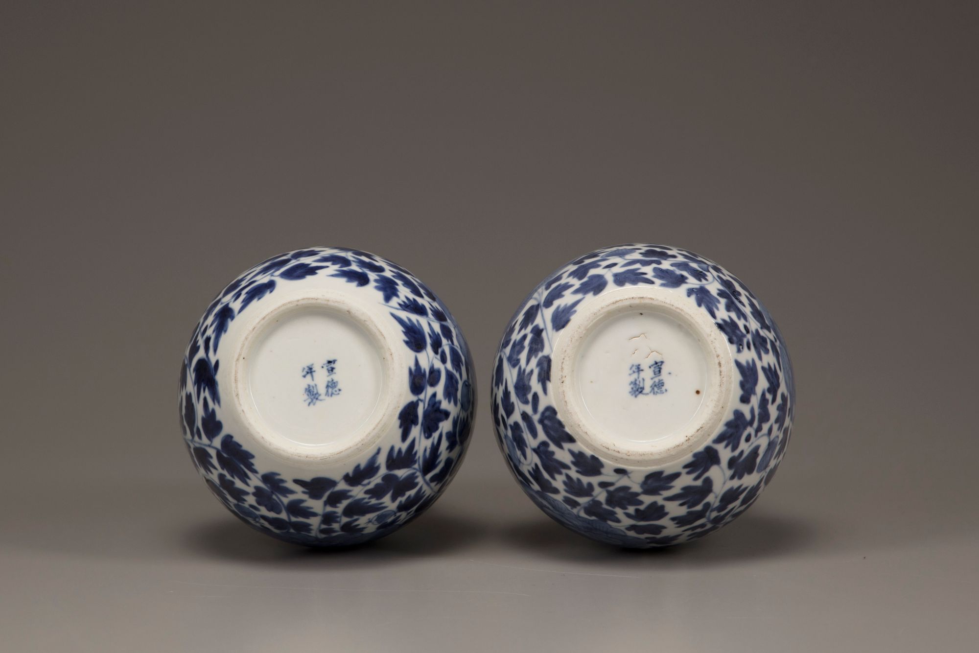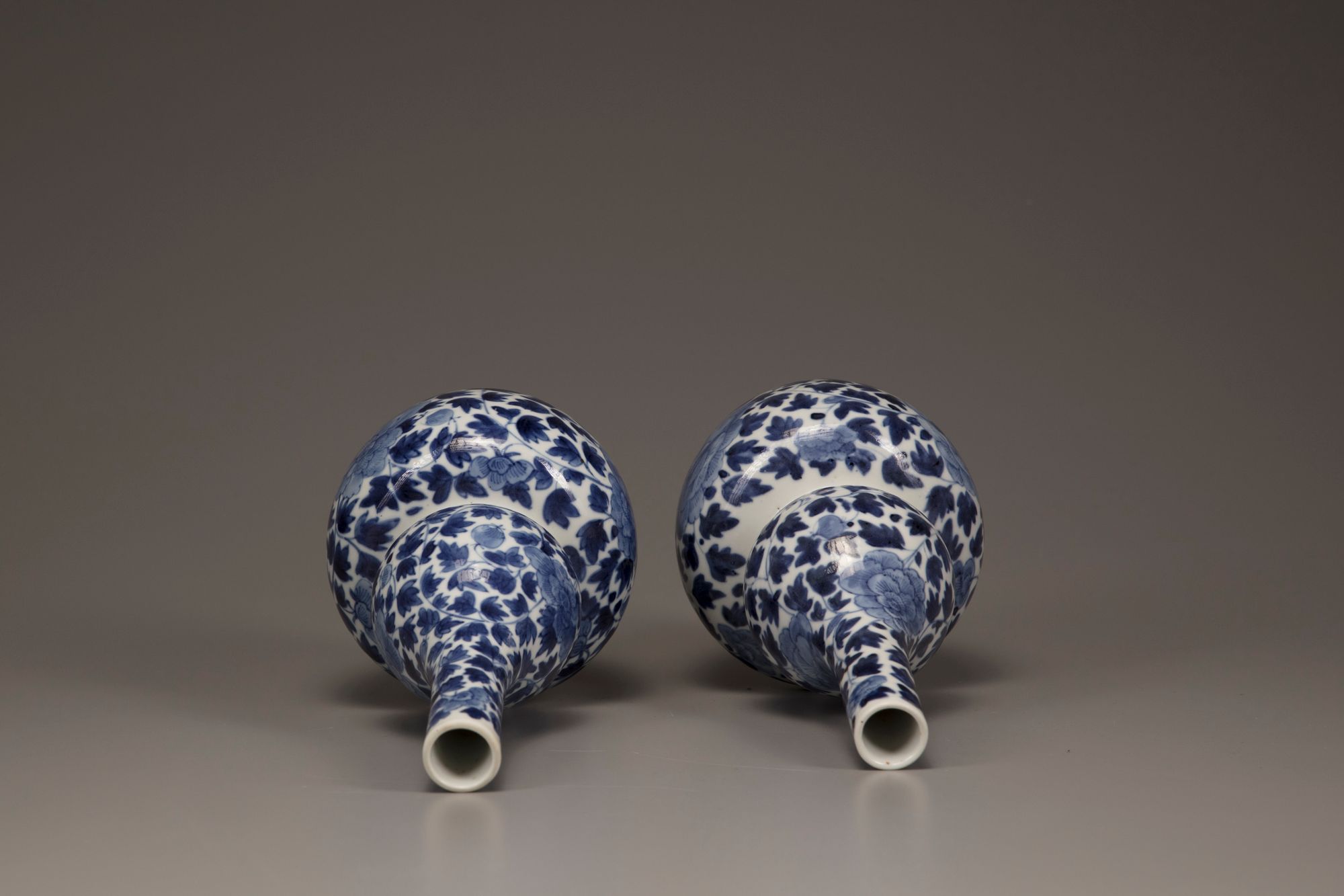 Each vase is decorated in underglaze blue with scrolling peonies and buds. The bases with an apocryphal Xuande mark.