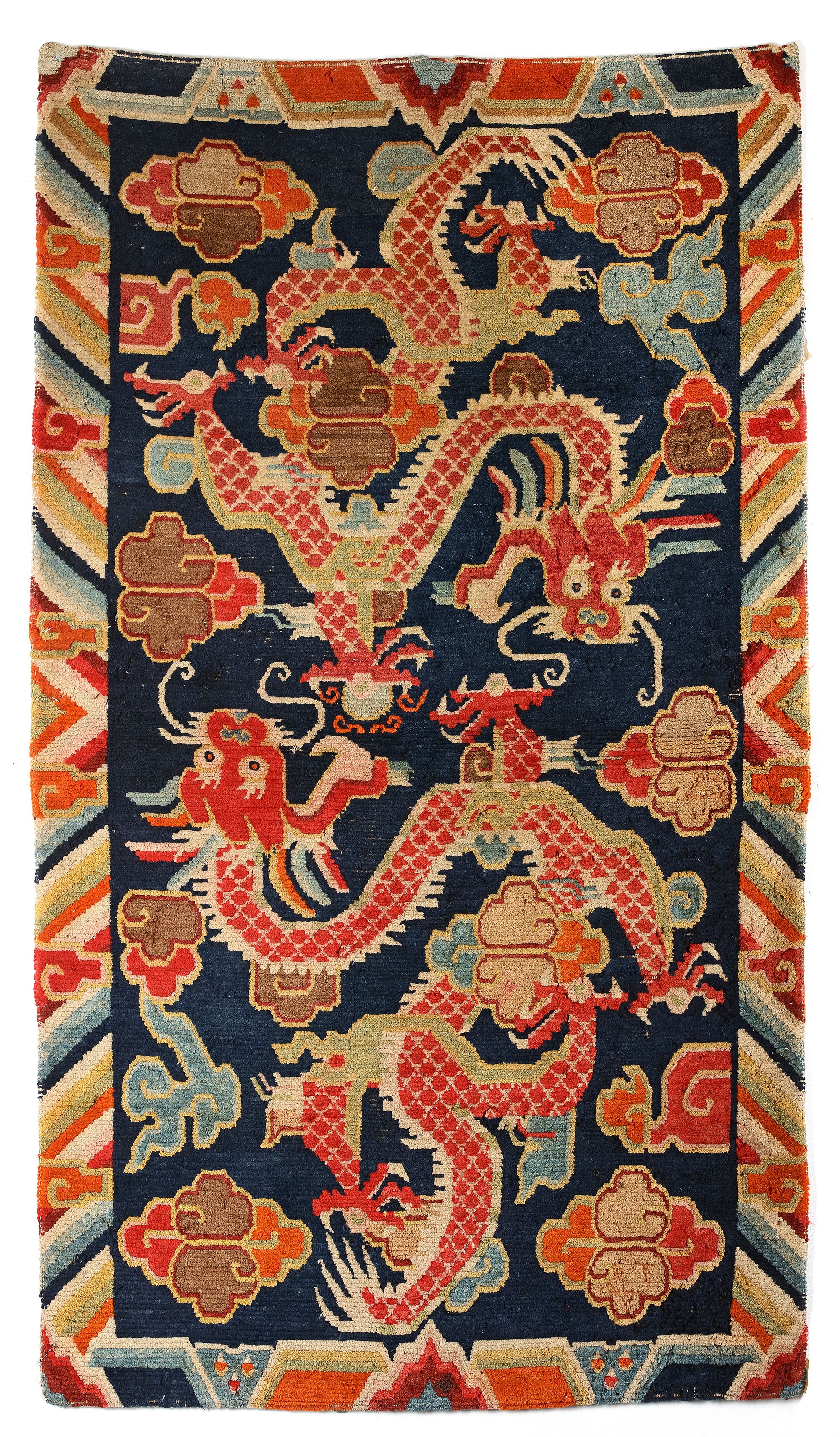 A Tibetan thick wool rug hand-knotted with two large dragons chasing a pearl amongst clouds on a deep blue ground. 87 by 157 cm.