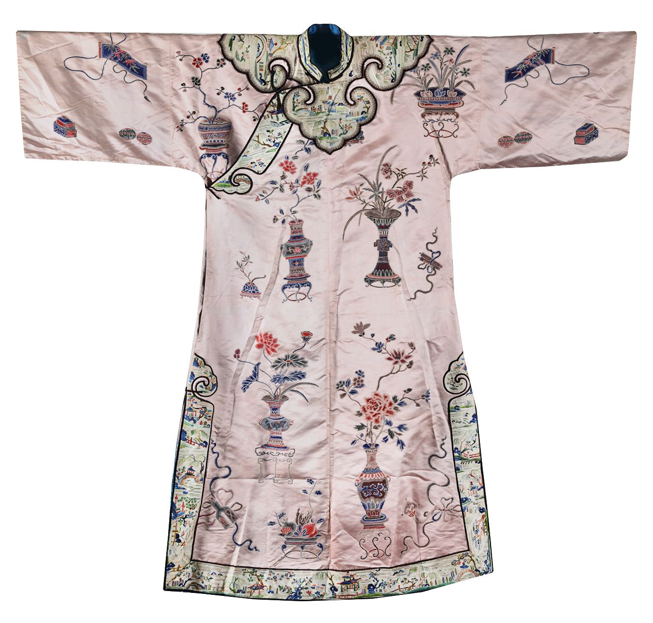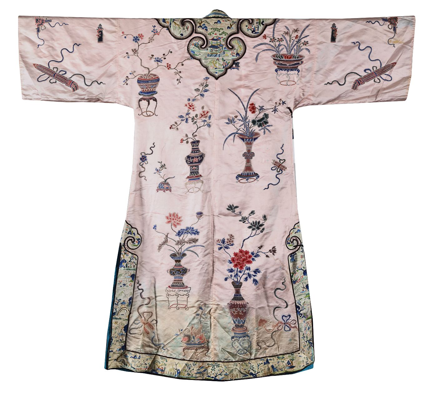 Embroidered silk lady's robe. The pink silk ground embroidered in intricate Peking knot stitches with vases and jardinières issuing flowering branches, the collar and hem decorated with ivory-ground bands depicting characteristic Chinese garden landscapes