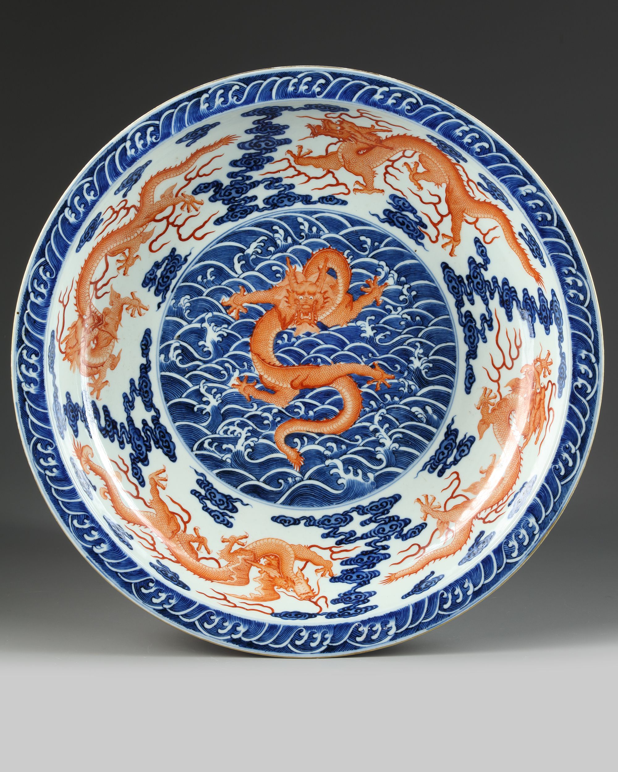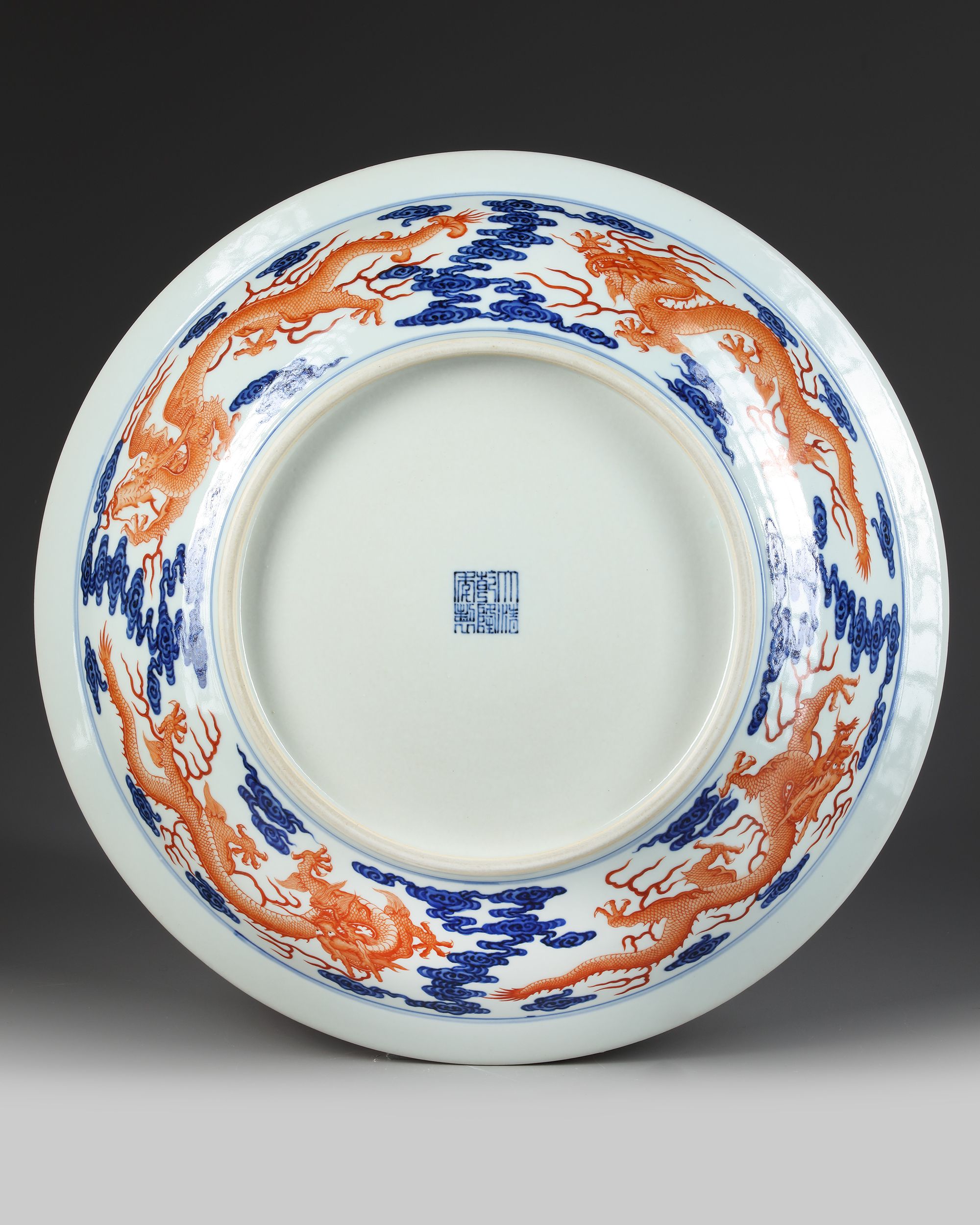 A Chinese porcelain charger, decorated to the centre with a five flawed iron-red dragon leaping on sea-waves. The sides to the exterior and the interior with dragons chasing flaming pearls amongst clouds. The bottom with a Chinese Qianlong seal mark.