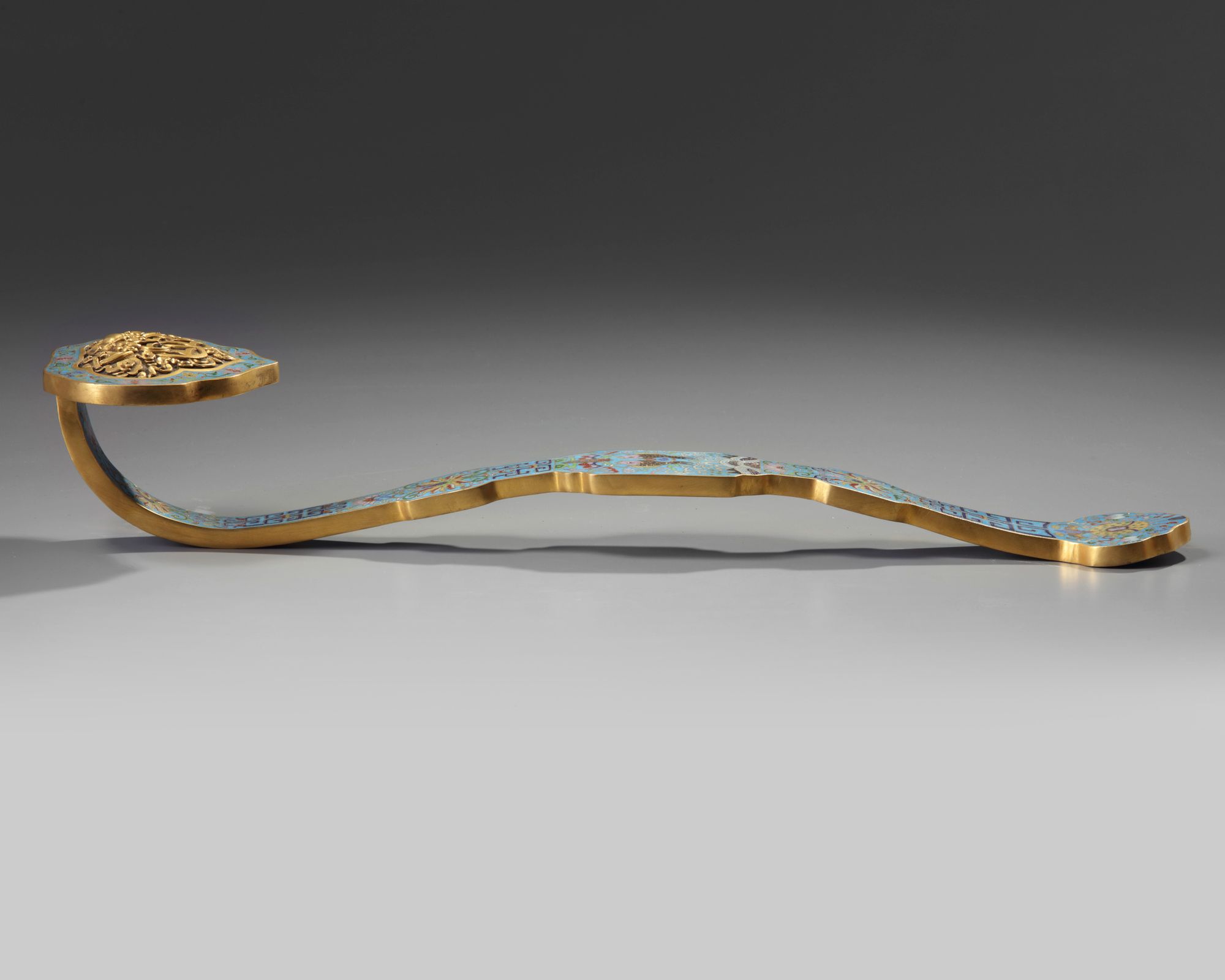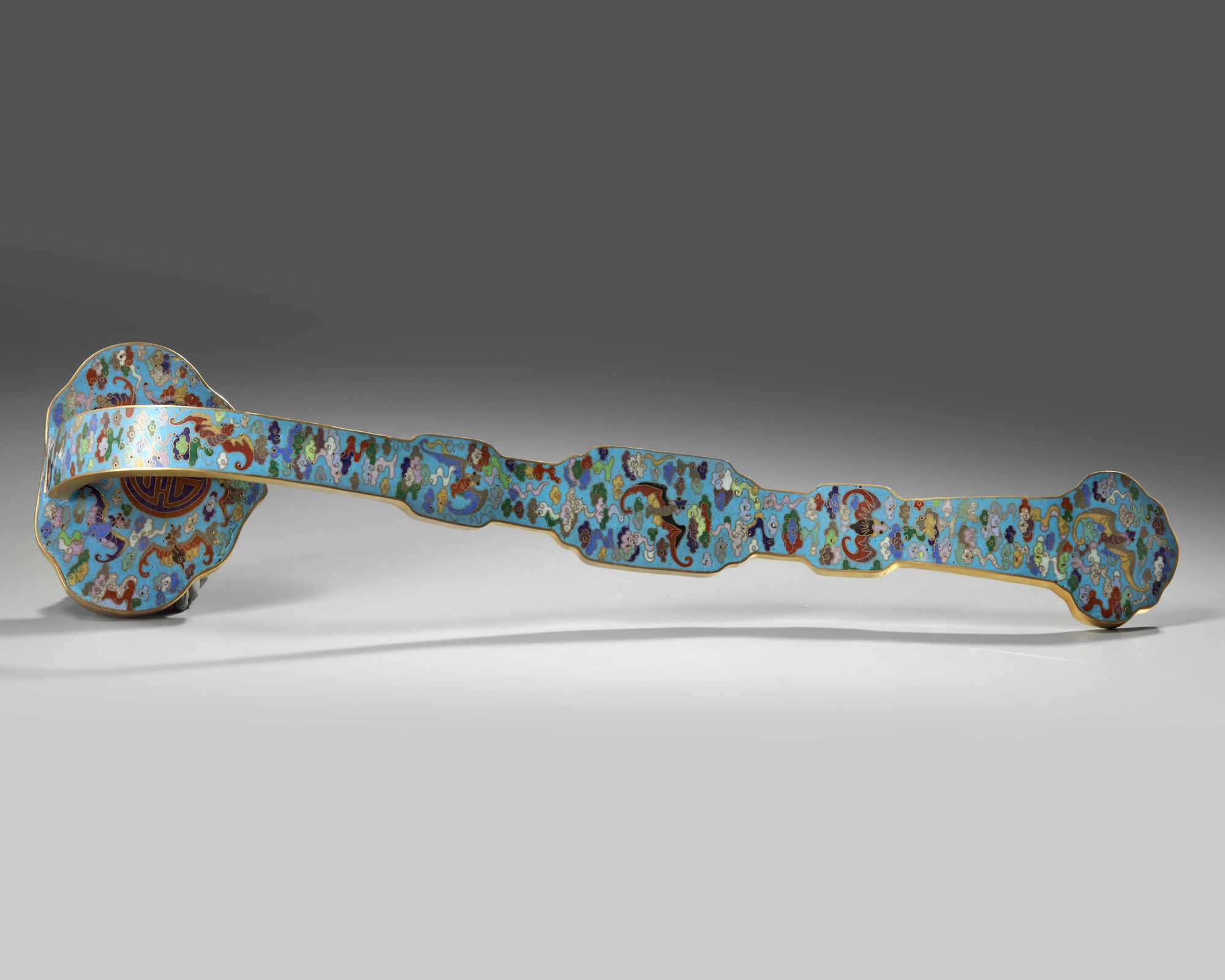 The ruyi-shaped head is inset with a gilt bronze panel decorated in relief with a bird of prey holding a twin-cash symbol in its beak, all surrounded by a cloisonné enamel design of flower scrolls, squared scrolls, lotus, and twin fish. The reverse is decorated with a bats and clouds design and a 'shou' roundel to the back of the head. 48 by 12 by 7.5 cm.